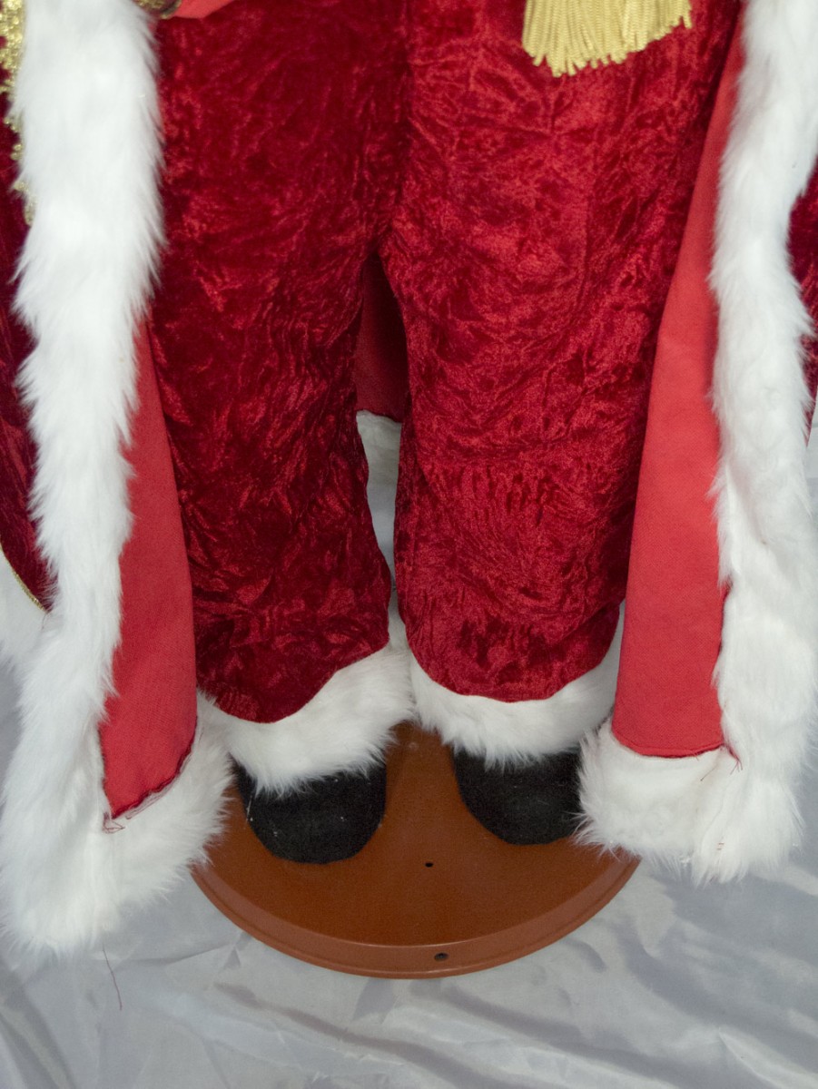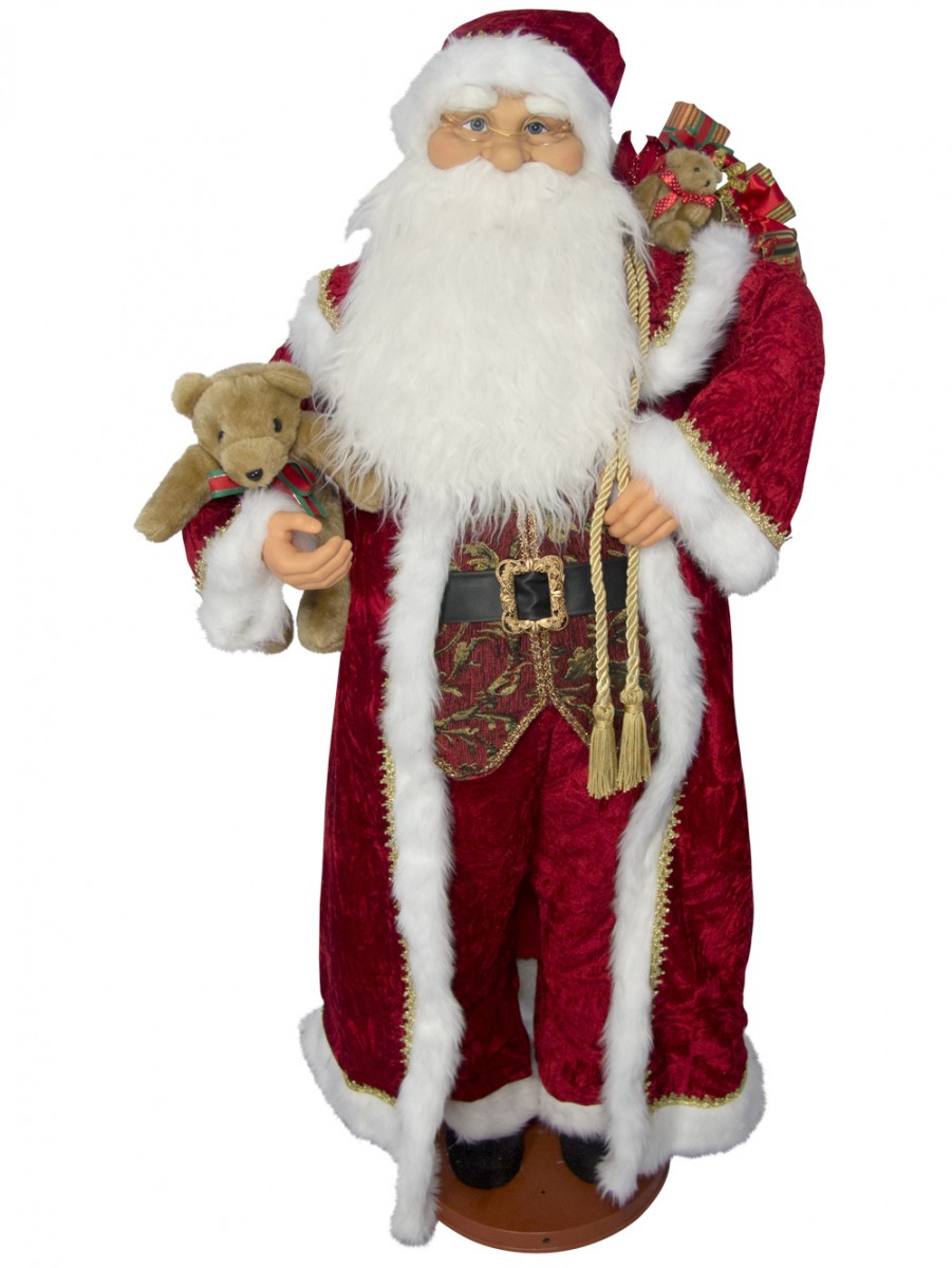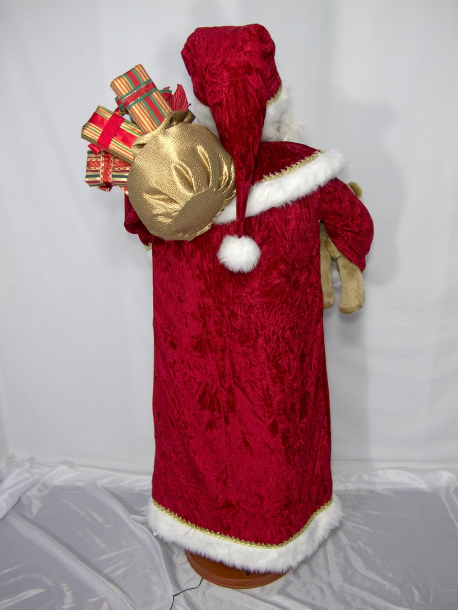 For those people who collect Santa figures, this is one you won't want to miss. Our Singing and Dancing Santa with Teddy and Gifts stands almost 5 feet tall, so he makes a really impressive presentation in any Christmas display! Place him at your front door to welcome all who enter for the holidays, or try standing him near the fireplace or Christmas tree. Let him peer out through a prominent window to delight the neighbours and passers-by!. Our musical Santa wears an old world costume with velvet-like trousers, a long robe with a wide collar, and a winter cap, all done in red and trimmed with white faux fur. His waistcoat is red, gold, and green paisley, and a black belt with a gold tone buckle finishes the look. He carries a sweet little teddy bear and a sack that's held by a gold braided cord with tassels. It's filled with toys, presents, and other goodies. The old fashioned life-like face has a long white beard.