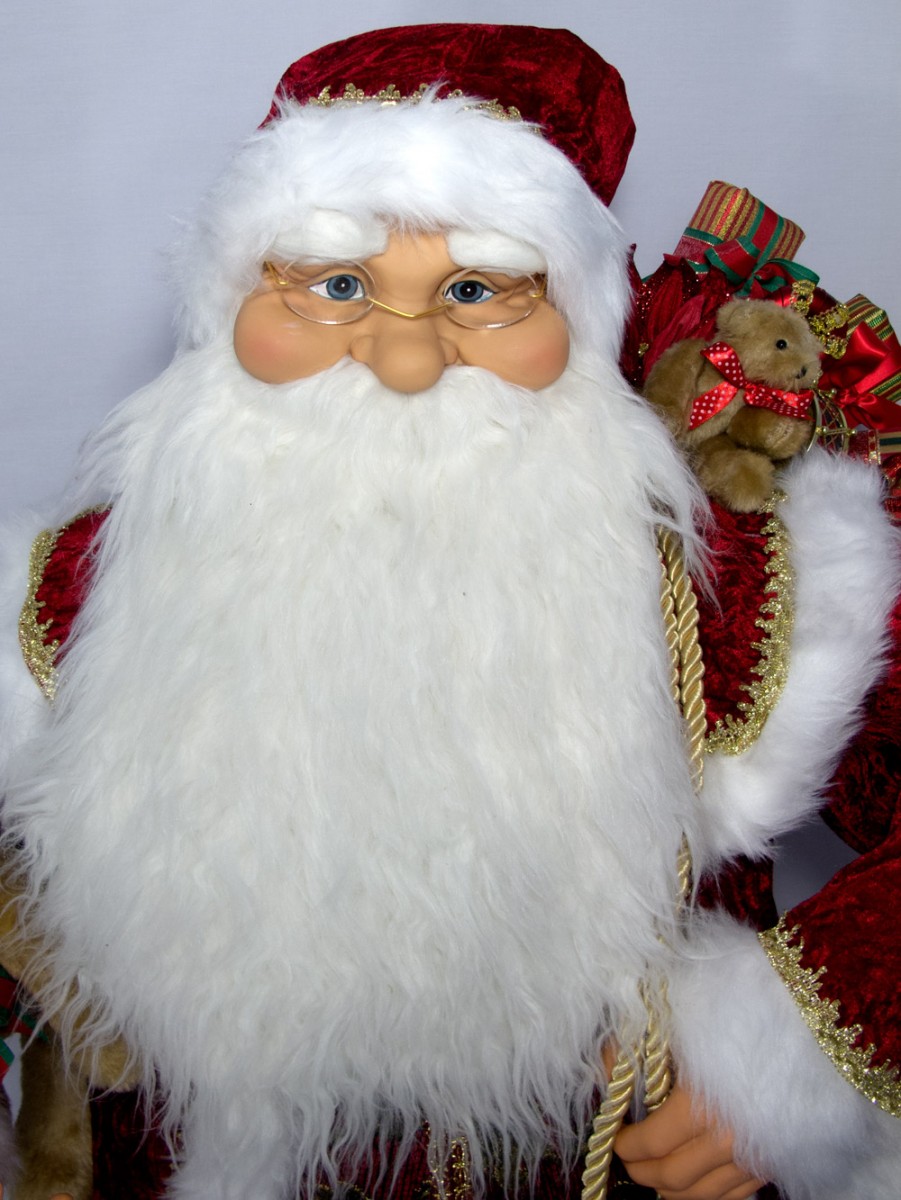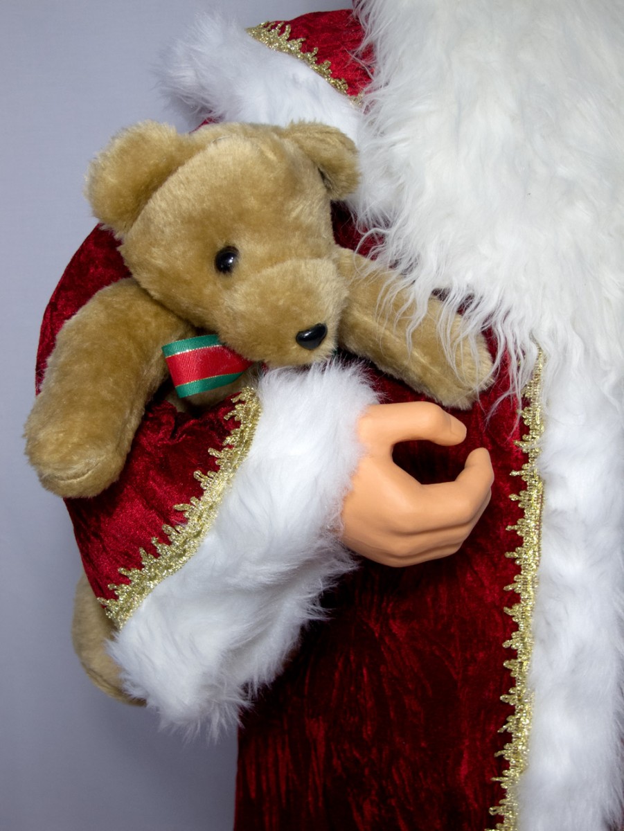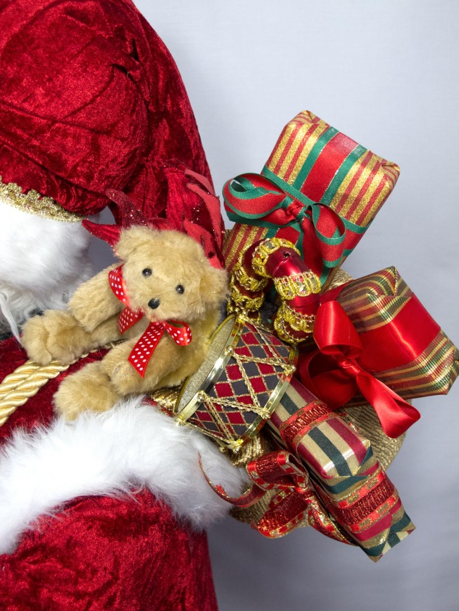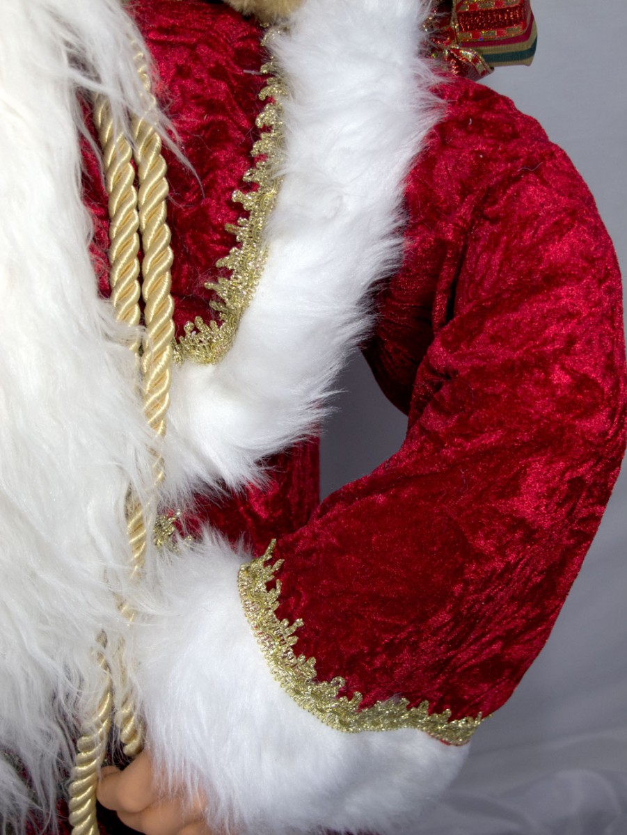 For those people who collect Santa figures, this is one you won't want to miss. Our Singing and Dancing Santa with Teddy and Gifts stands almost 5 feet tall, so he makes a really impressive presentation in any Christmas display! Place him at your front door to welcome all who enter for the holidays, or try standing him near the fireplace or Christmas tree. Let him peer out through a prominent window to delight the neighbours and passers-by!. Our musical Santa wears an old world costume with velvet-like trousers, a long robe with a wide collar, and a winter cap, all done in red and trimmed with white faux fur. His waistcoat is red, gold, and green paisley, and a black belt with a gold tone buckle finishes the look. He carries a sweet little teddy bear and a sack that's held by a gold braided cord with tassels. It's filled with toys, presents, and other goodies. The old fashioned life-like face has a long white beard.