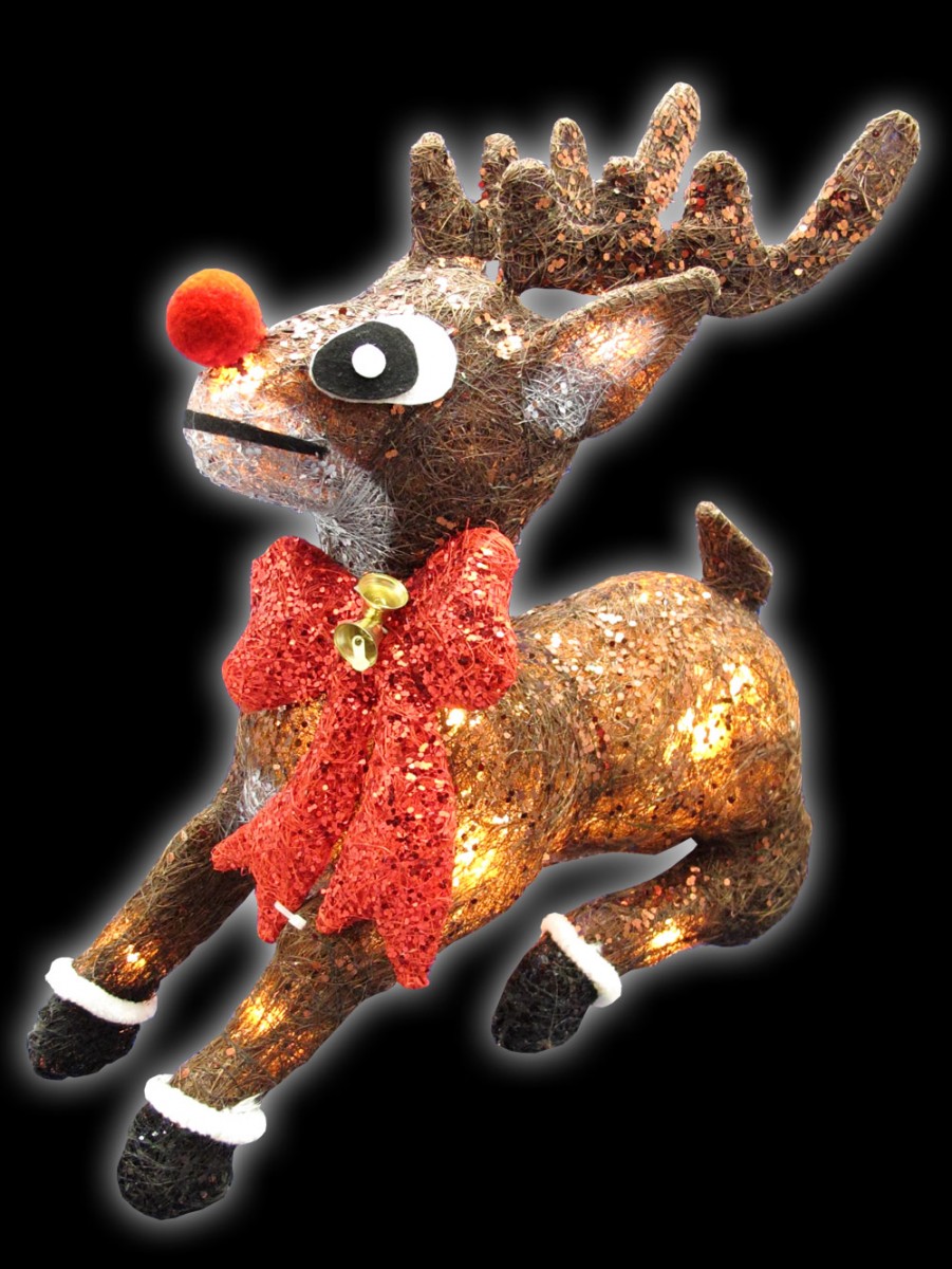 The sisal sitting reindeer with a red bow and nose light display is suitable for indoor and outdoor use. The red nose is a dead giveaway that this must be Rudolf.