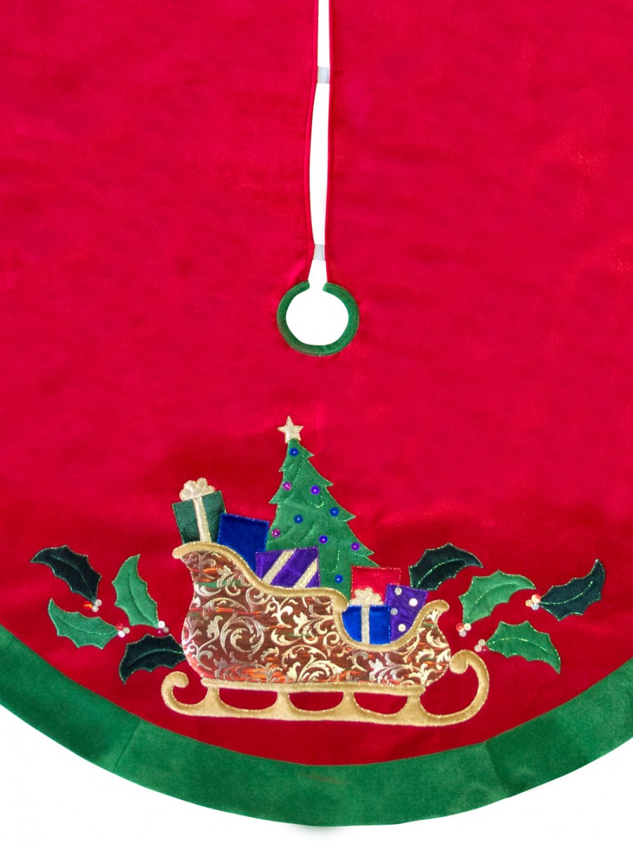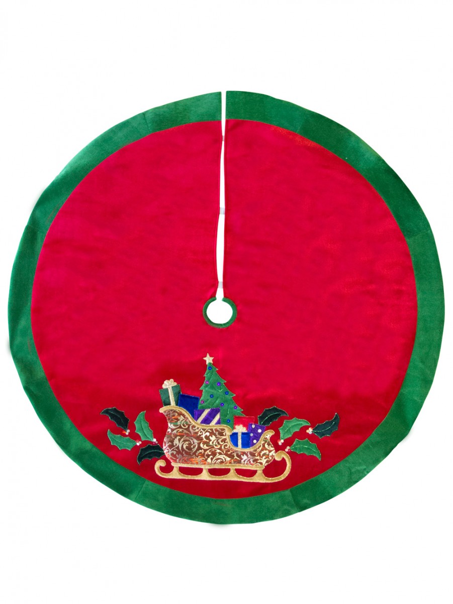 Complete the entire look of your Christmas tree with the Sleigh With Tree & Gifts Tree Skirt. 1.2m in size, you can be sure that the base of your tree will be completely covered and decorated. This tree skirt is perfect for small to large Christmas trees. So you don't have worry about having enough room for your presents and other trinkets. The base is wide enough for a multitude of gift bags and boxes for the holidays. The design is pretty classic, to usher in a vintage look and feel. The skirt has a sleight packed full of gifts highlighted by a tree and holly leaves in the background behind the sleigh. One side of the skirt has an opening that you can pull aside to place under the tree, and can be reattached with a Velcro strap. The red and green colors of the tree skirt are ideal for this cheery and festive celebration which is designed to highlight the other Yuletide colors that you have chosen for your Christmas tree.