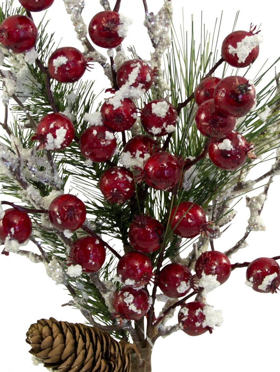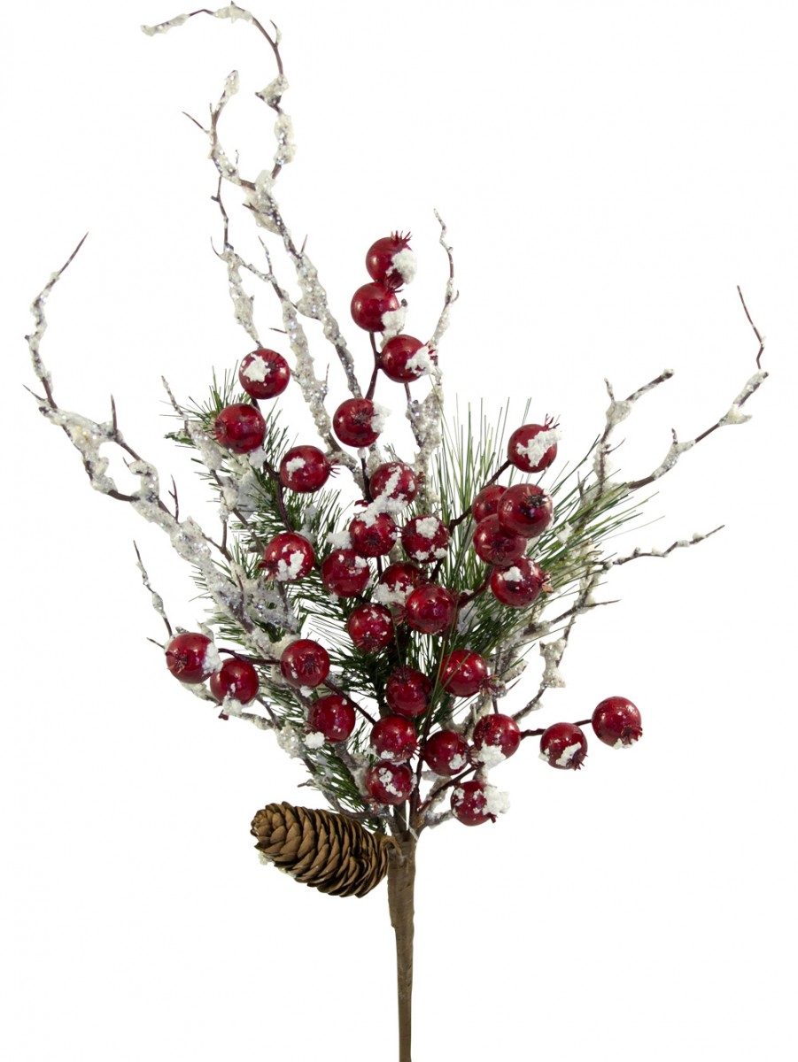 Throw back to some classic rustic country Christmas charm! If you are a fan of DIY home decorating, this type of decorative Christmas pick is ideal for holiday arrangements. Sold individually, but purchase one or more for more elaborate arrangements. A snow frosted twig pick is adorned with mixed pine needle foliage, a pine cone, and some small red berries. This pick can complement a variety of settings and is very easy to use- simply unpack and add to whatever part of your home needs a bit of holiday cheer! This pick�s dimensions are 28 cm x 13 cm x 58 cm.