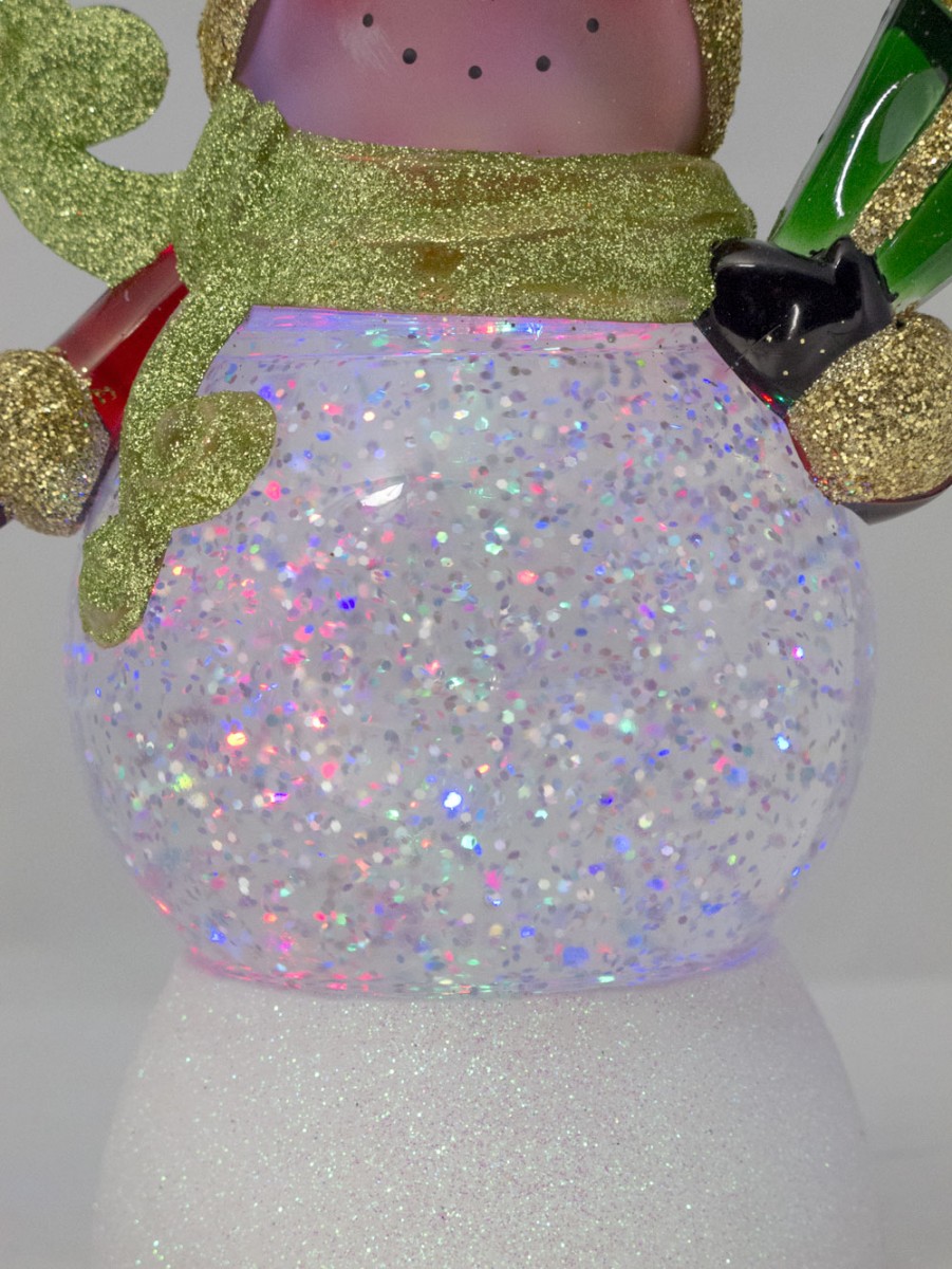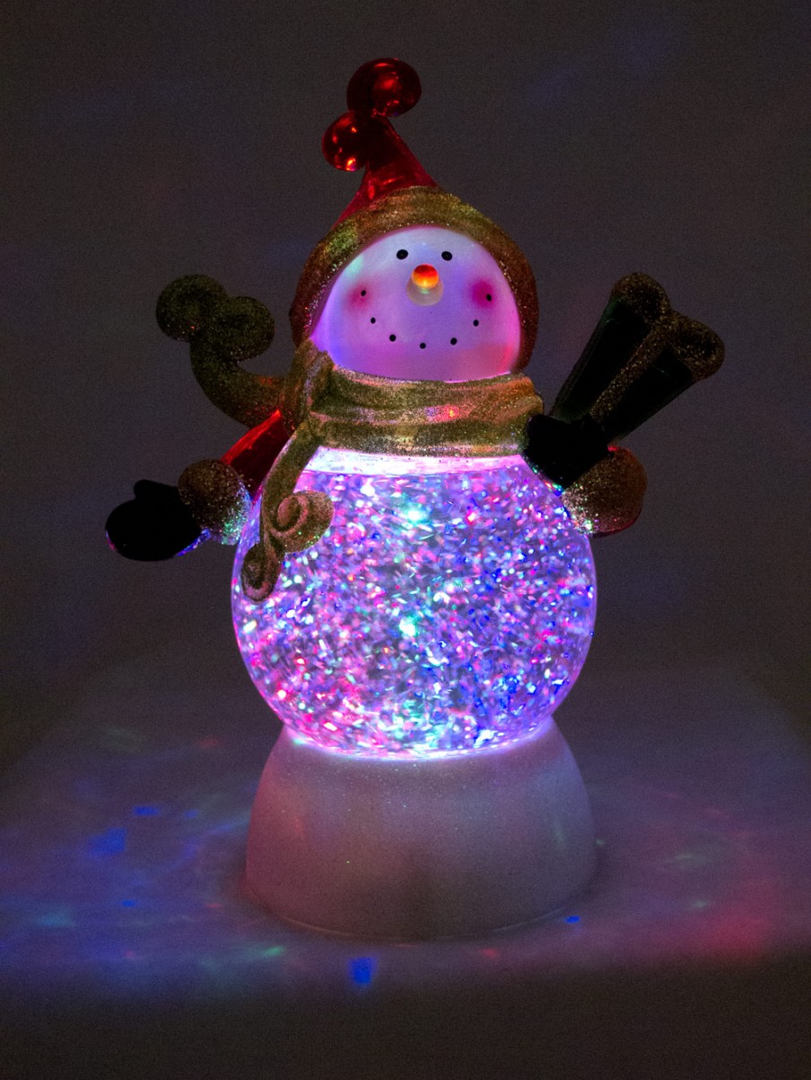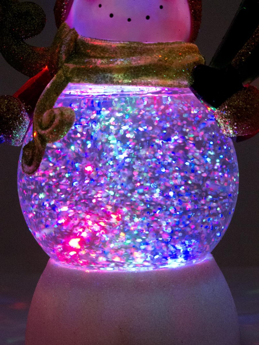What makes you remember and cherish Christmas the most? Holiday symbols such as Santa Claus, Christmas trees and snowman are just few of the popular choices. Hence, when looking for the best yuletide accessories, snowman decorations are always on top of the list. This jolly and merry symbol of the holiday season is perfectly captured in our Snowman Illuminated Snowing Snow Globe Ornament. Nothing boosts the aesthetics of every home, offices and any other venues with a smiling snowman with multi colour LED. The resin and snow globe snowman is crafted from fine quality materials. It is molded with a smiley design complete with the green glittered scarf, frosted facial features and white iridescent base. The continual swirling silver in the snow globe embellished with Led lights complete the eye-catching treat. The LED lights are controlled by an on / off switch on the base. It required 3 x AAA batteries that are not included.