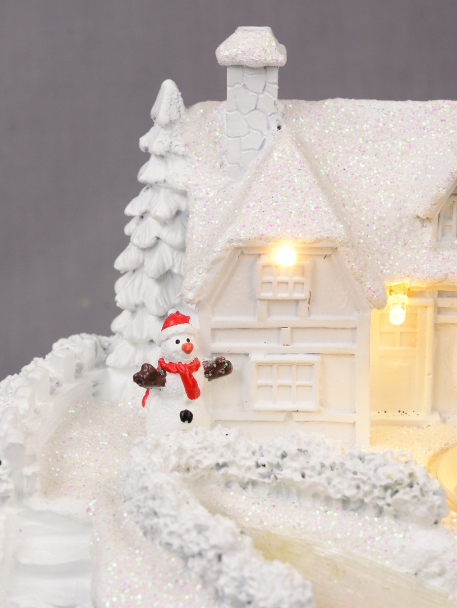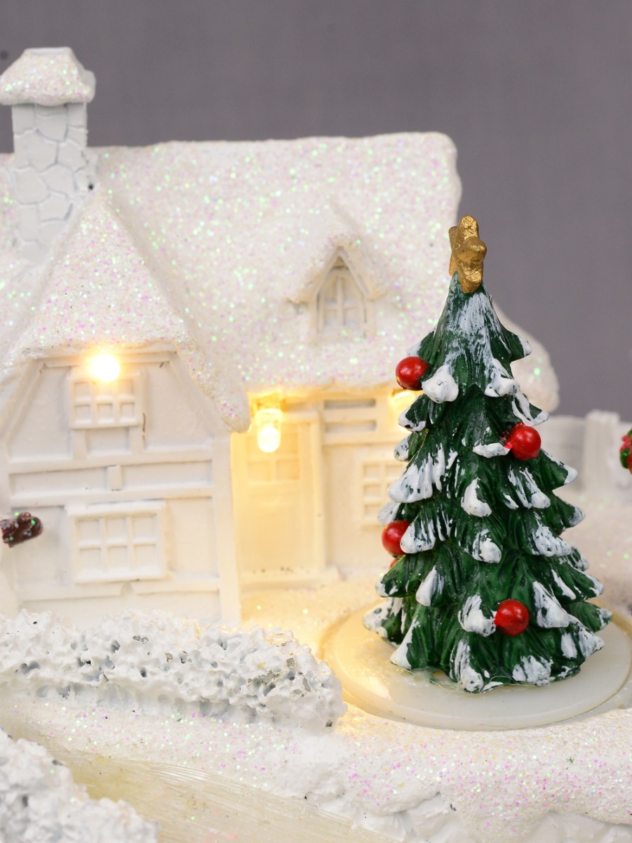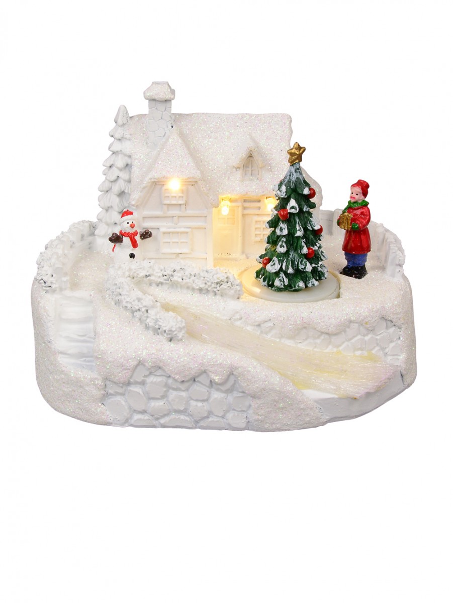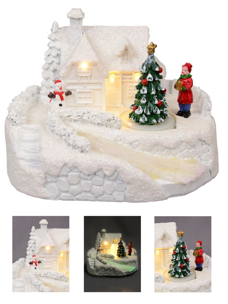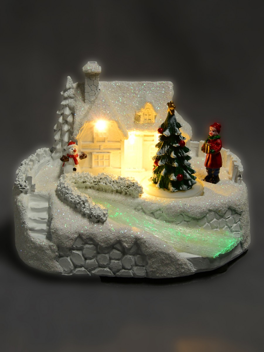 The Illuminated & Animated Snowy Winter Home With River & Tree Scene is a visually captivating Christmas ornament which depicts a home beside a bright, sparkling river. There is a decorated Christmas tree complete with red berries and gold coloured star topper. As is his habit, Santa is caught in the act of being about to place a gift package beneath the Xmas tree. There is also a flowing, green sparkling river beside the house while yellow bright light illuminates the exterior from inside the house. For added decorative effect, every snow covered area and river are ornately decorated with green sparkling sequins.