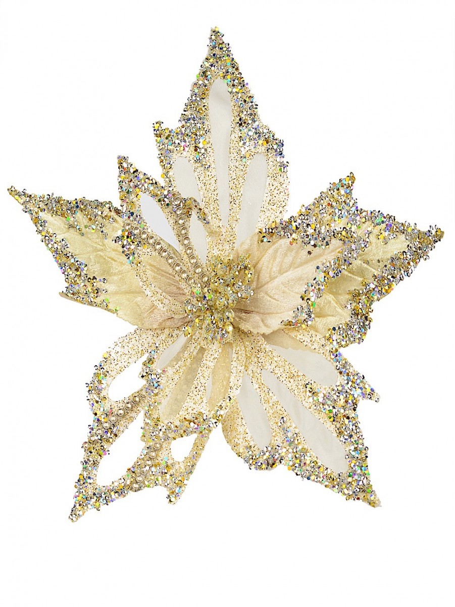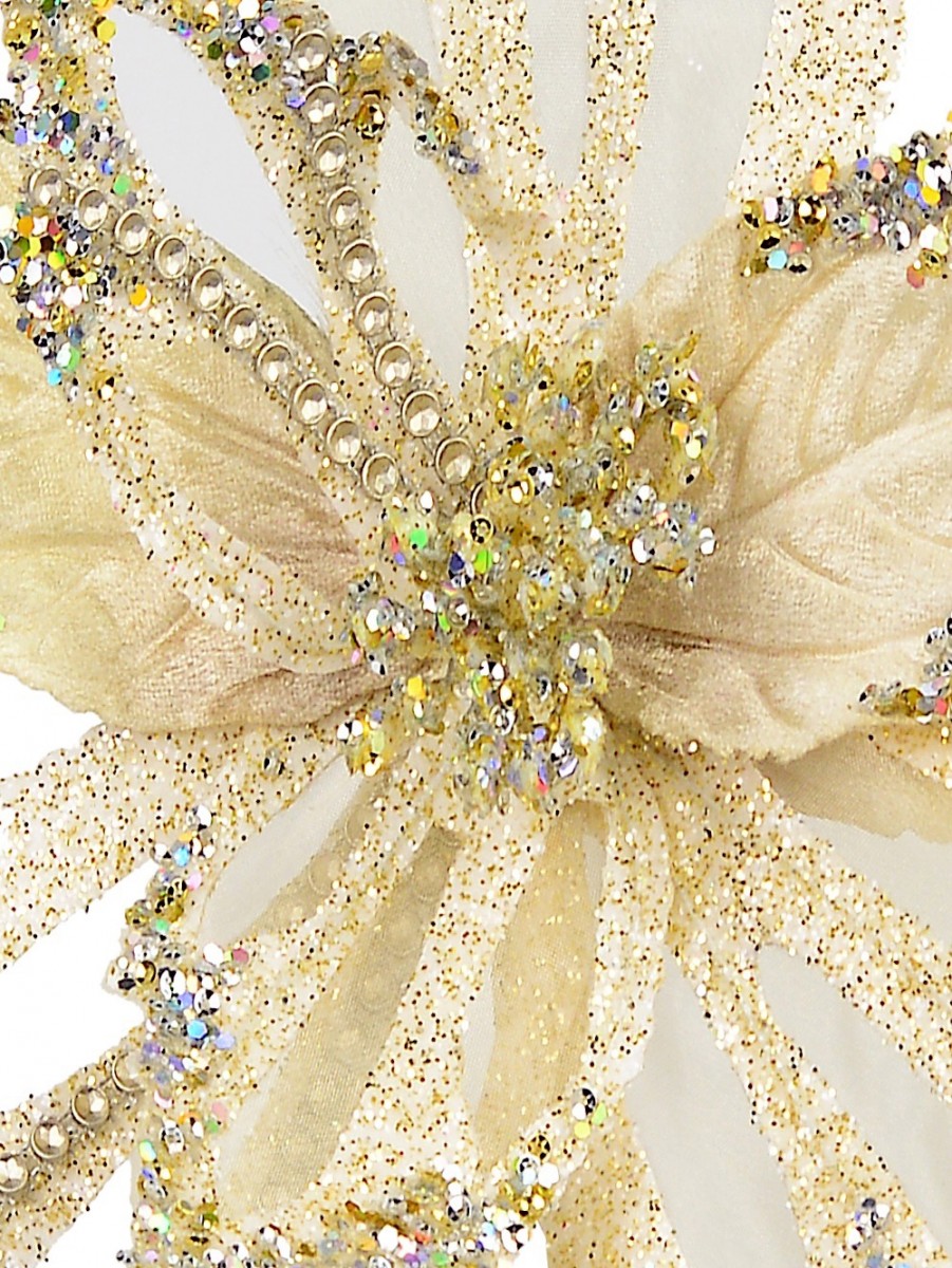 Add that finishing touch to your Christmas tree this year with this beautiful gold poinsettia pick that is a soft, lighter version of the regular gold colour. Simply clip on the flower onto the outer branch of the tree to add a luxurious colour and dimension to your Christmas tree. You can also match them with the champagne gold ornaments available here at Christmas Warehouse!