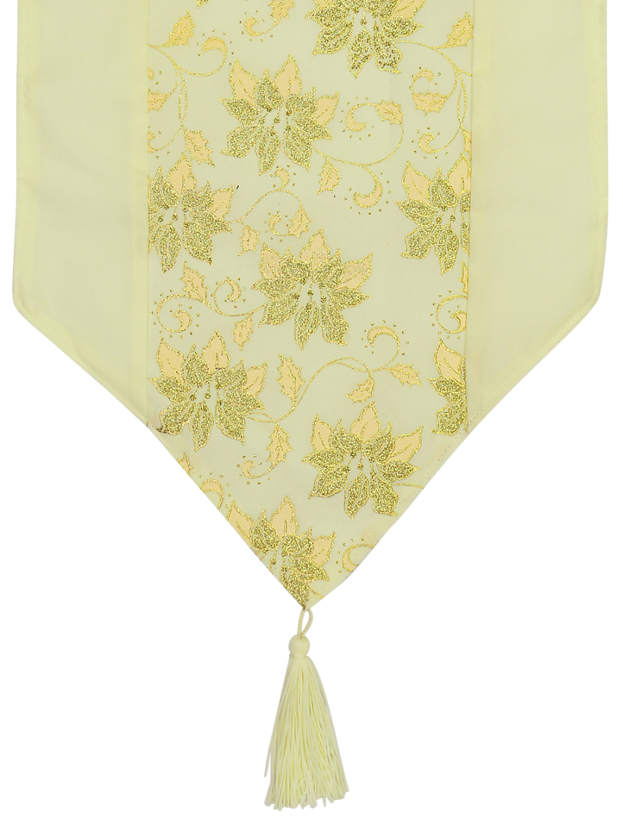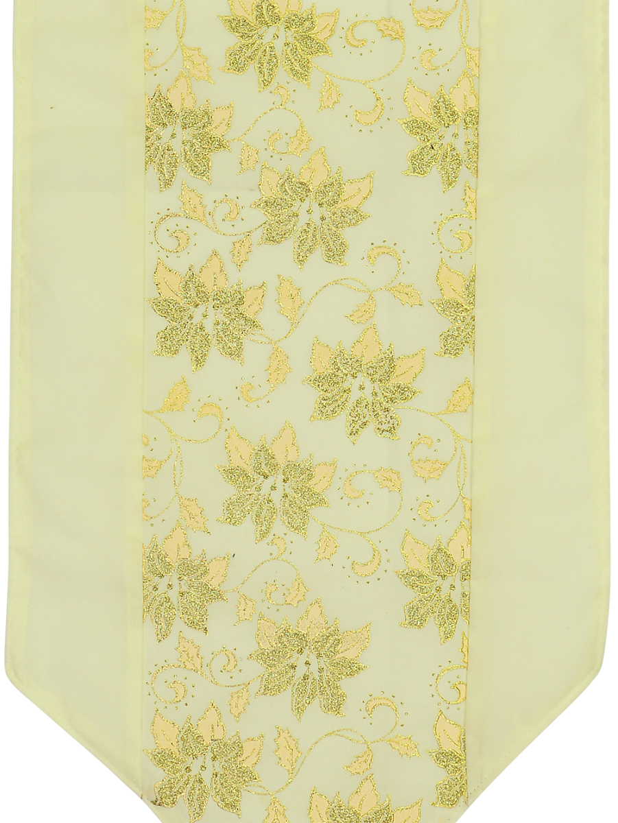Dress up your table to look pretty in classic fashion with our soft gold table runner with a flower design that is also perfect to use for any occasion! This runner is made of soft gold organza material with a plain gold border on each side having a gold glitter flower and leaf design in the centre and tapering towards the ends with a gold tassel attached.