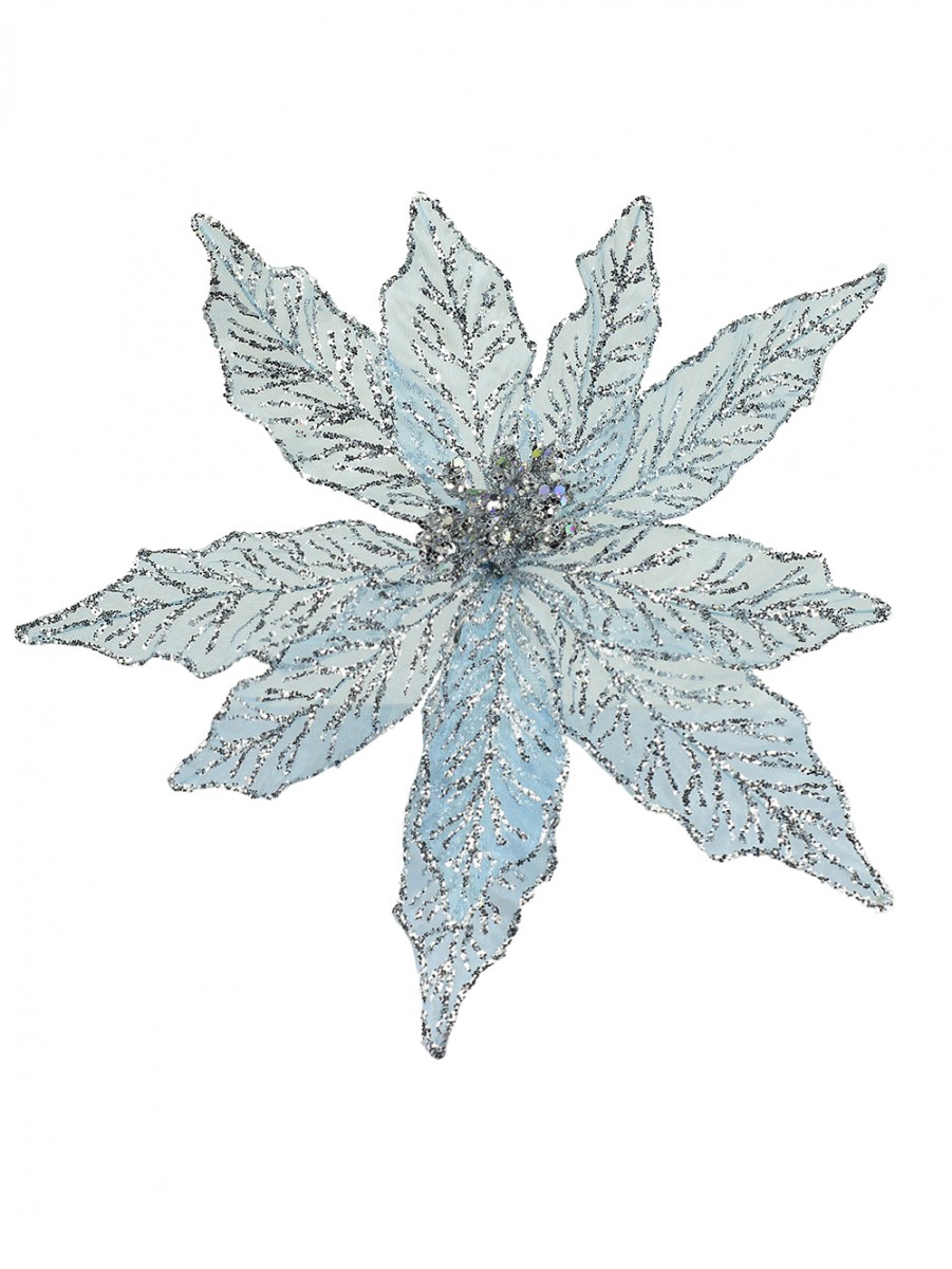 The Tiffany-inspired poinsettia flower features light blue petals made of sheer fabric having silver glittered veins and also delicately outlined with silver glitter on the edges with a jewelled centre to complete the pretty look. This flower pick will go seamlessly with other flowers to create a superb centrepiece and features an alligator clip so you can easily attach it to an Xmas tree, display, other picks, a shirt or dress or even place it in your hair! The product also makes for a wonderfully unique gift item for weddings or any occasion as it ships worldwide.
