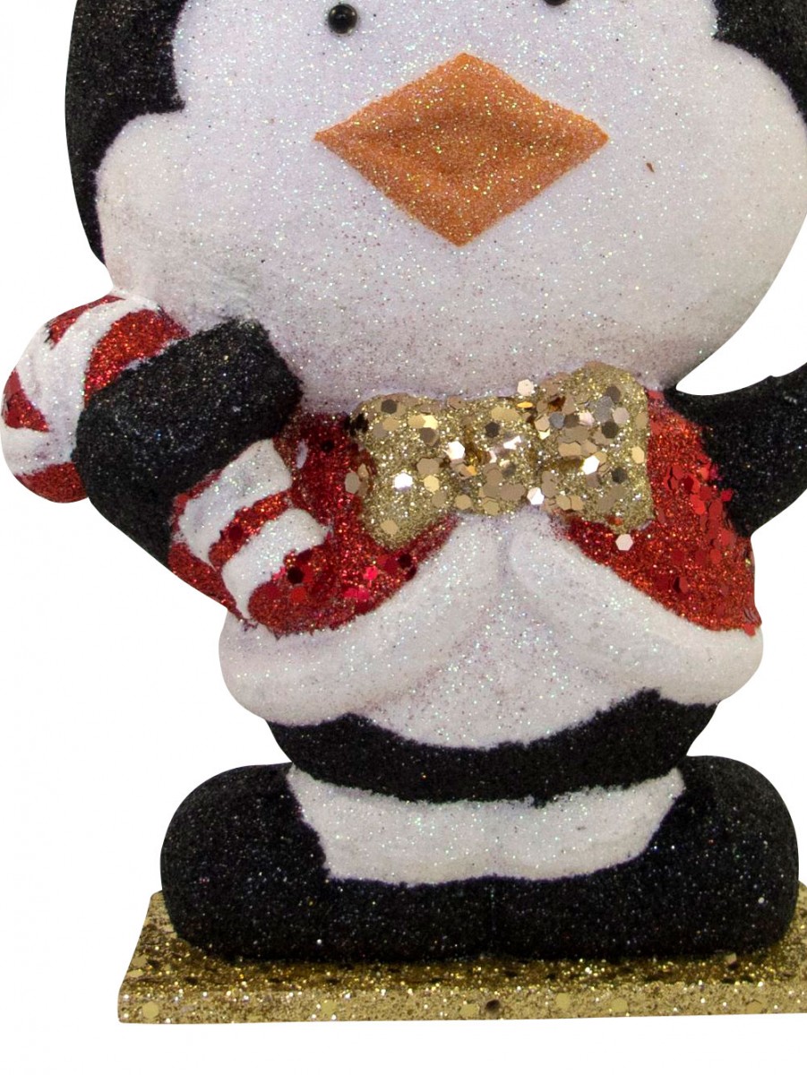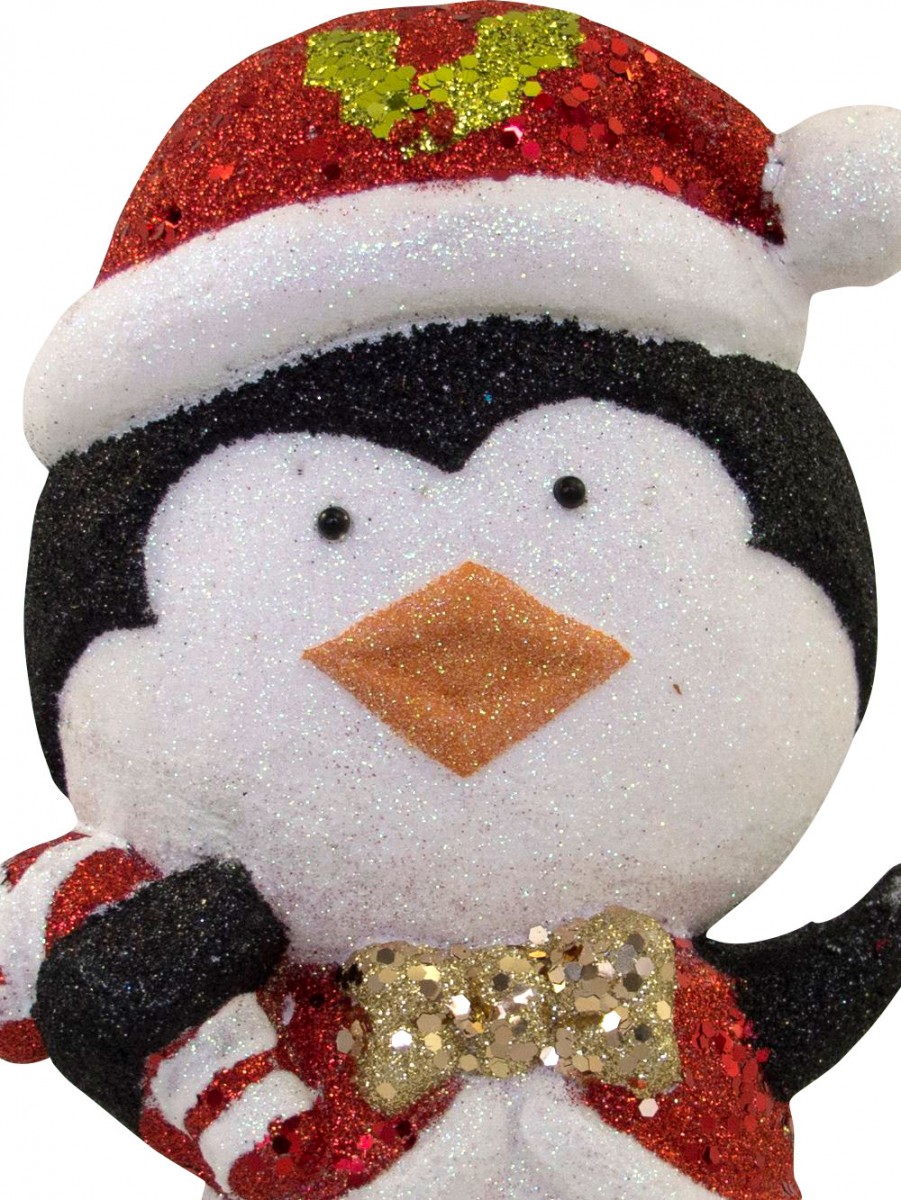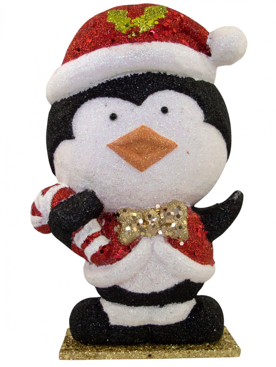 Are you looking to add a little bit of sparkle, shimmer, glitter, and pizzazz to your life this Christmas? This sparkly little penguin friend is just what you need! Santa�s little helper from the South Pole. This glitter penguin has a red glitter vest, red and white glitter hat with sequined holly leaves, and gold sequined bow tie. He holds a red and white glitter candy cane and stands cutely on a gold glitter base. Made of Styrofoam with a flat glittered back. This sparkly little guy stands 21 cm tall x 13 cm x 50 mm.