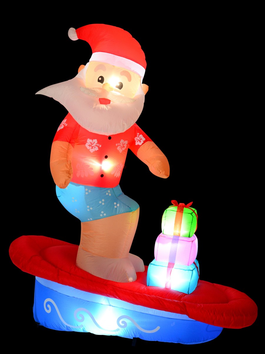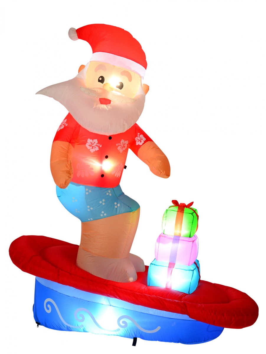 The Surfs Up Santa On Surfboard Illuminated Christmas Inflatable is a lovely addition to any Christmas decoration you may have planned for this coming Christmas celebration. This air blown decorative Santa figurine showcases Santa's new way of delivering gifts to kids on the island - via a sporty wave riding surfboard! This Santa themed inflatable would be perfect for adding delightful Christmas festive outlook to every living and working environment.