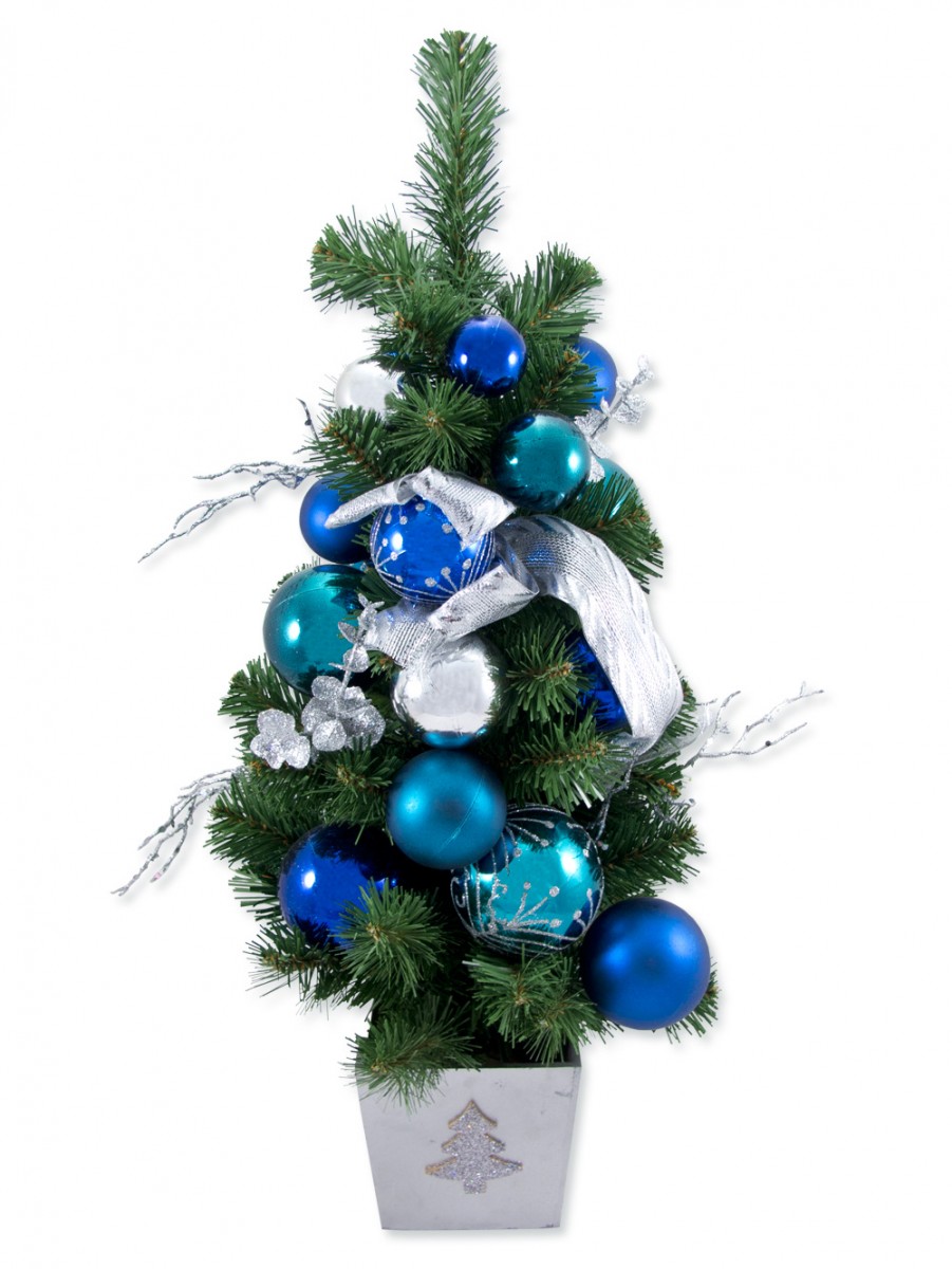 Everyone loves Christmas trees whether they stand several stories tall or are light enough that they can sit on the palm of your hand. They're a must have during the holiday season regardless of their size, shape or color and can really incorporate the holiday spirit into the home. That's just what this Pre-Decorated Table Top Tree does. This charming little green tree is already decorated for you so there's no hassle with finding just the right ornaments that will fit. It sits in a small silver wooden pot that's decorated with a Christmas tree while the tree itself is chock full of blue and silver round ornaments of varying sizes, designs and finishes. Silver glitter twigs are stuck throughout while a silver ribbon is added for an extra dose of sparkle. This little tree will fit beautifully on your coffee table, in your foyer or on a window sill. As it comes already decorated, all you have to do is remove it from the packaging, fluff it up a bit and display it wherever you wish.
