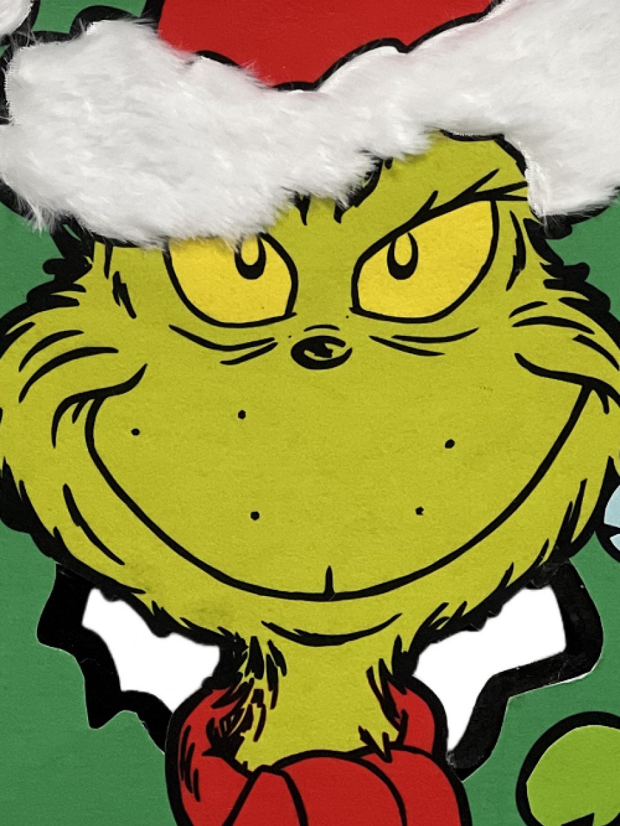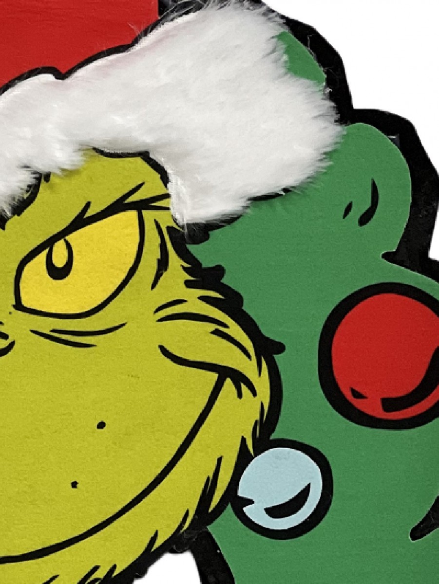 This charming accessory features the green and mischievous Mr Grinch with his signature yellow eyes and a wide grin, playfully peeking through a beautifully decorated wreath. He's decked out in style with a red scarf and a red Santa hat that boasts a soft faux fur white cuff and a whimsical pom-pom.