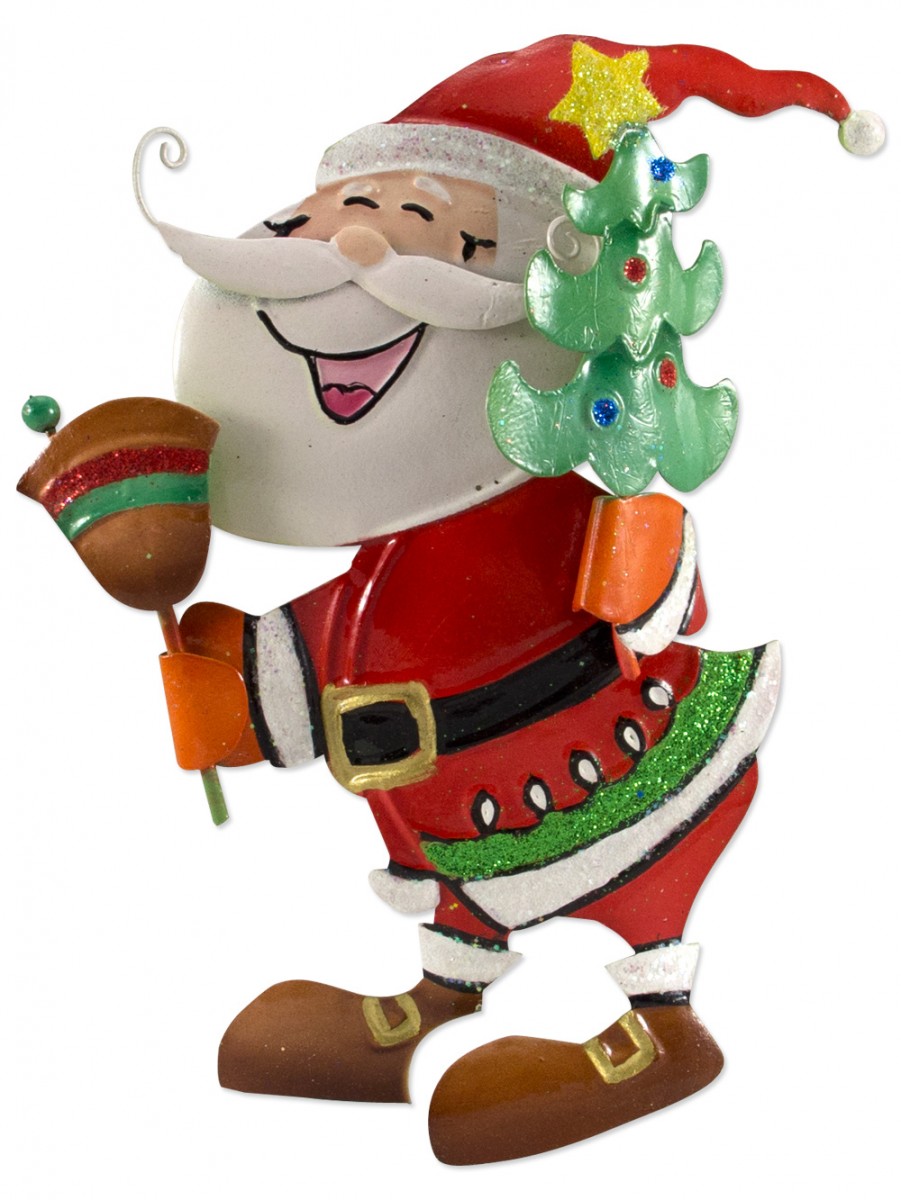 Here comes Santa Claus! Here comes Santa Claus! Strutting his merry way right down Santa Claus lane! This adorable hanging Santa ornament will soon become a favourite among your Christmas decorations. This ornament is perfect for any home with a Christmas tree. Hang him from a branch and delight at his joyful expression, his brightly coloured outfit, and his sparkling glitter highlights that reflect the light from every bulb on the string. This tin Santa is also the ideal choice for decorating your front door. His smile will likely be contagious; one glance at this wonderful ornament and poof, you are suddenly in the Christmas spirit! Depicting jolly old Saint Nick carrying a decorated star-topped Christmas tree in one hand and his festive golden bell in the other, this ornament is an adorable addition to your Christmas decorations. Santa is dress in his very best outfit - a red coat with white trim and a glittering strip of green, wrapped tightly by his black belt with a golden buckle, matching red and white trousers and hat, bright orange mittens, along with brown boots embellished with gold buckles. This charming Saint Nick ornament is 12cm by 12cm. It is sold only one per pack so be sure you order multiples for dressing the trees, hanging on the mantle, and gifting to friends. Christmas time is drawing closer each and every day - are you ready? You will be one step closer to being prepared for the holidays once you order your own Tin Santa Holding Tree and Bell to complete your Christmas decorations.