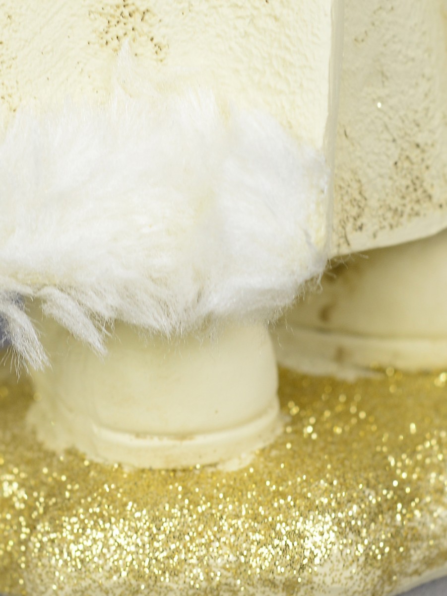 The long ivory white gown of this traditional style Santa is quite unique; adorned with thick white fur cuff and trim and is coated in gold glitter all over. A small gold glitter Christmas tree is held in his left hand and a gold bell in the right. This ornament will make a lovely display by combining it with a couple of vintage gold baubles and will be a welcoming decoration on a hearth, shelf or table in the foyer. Place it on the desk to bring a little Christmas cheer to the office!