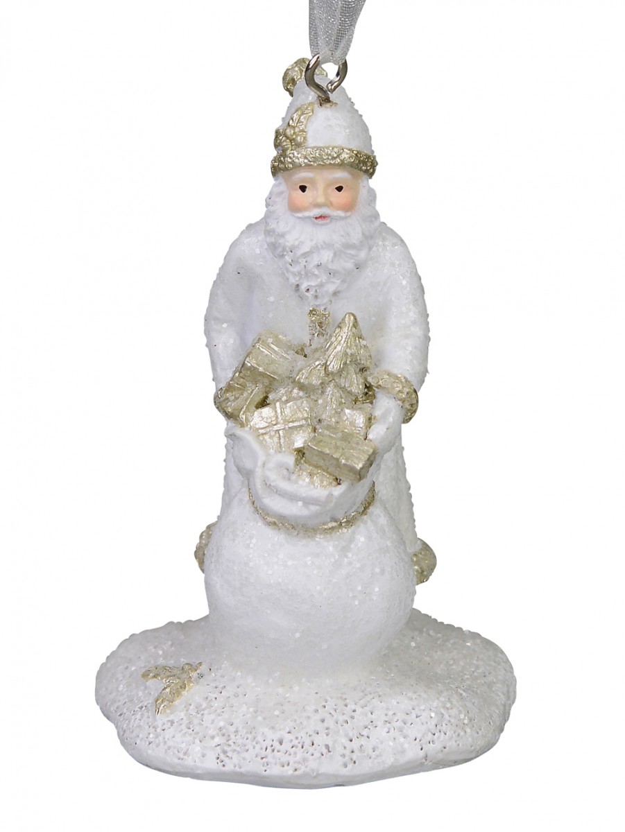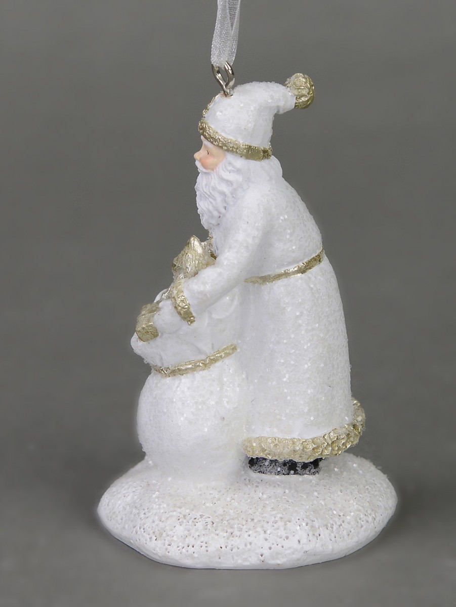 Each ornament comes with a white hanging ribbon attached to a small ring and is sprinkled all over with sparkling glitter. Great for embellishing a special gift, this adorable decoration can even stand on its own and will be a fantastic addition to your figurine collection. Combine it with another tabletop Santa or your other Christmas decorations to create a charming vignette for the holiday season. This elegant piece will be a welcoming decoration on your hearth or in your foyer and will be the perfect Christmas present for the Santa collector in your life!