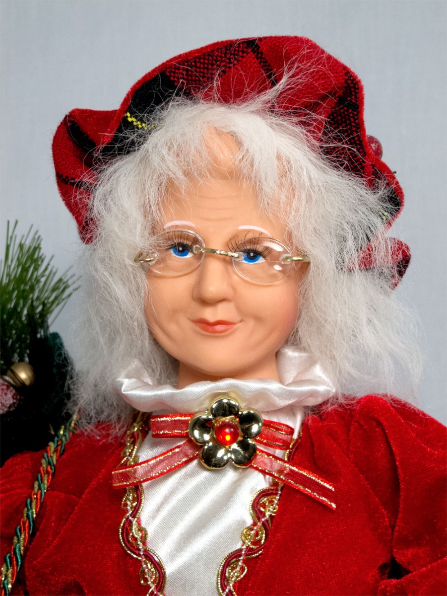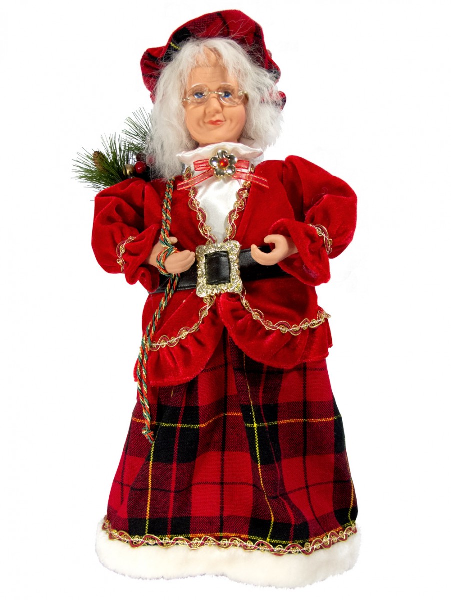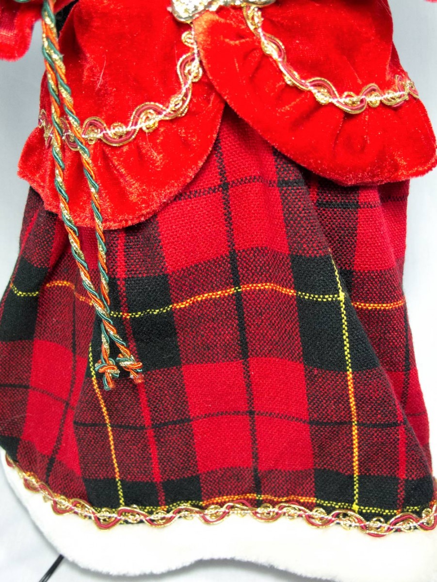 Our delightful Traditional Mrs. Claus comes to you dressed in a beautiful green and red plaid skirt with a white band and gold braid trim. She wears a white blouse with a red and white striped bow and silver ornament at her neck, and a red velvet coat with ruffled cuffs and hem. A wide black belt with a fancy buckle and a red velvet mob cap complete her ensemble, with a sprig of pine and a pine cone on her shoulder. Stands just over 18 inches tall and moves when activated.