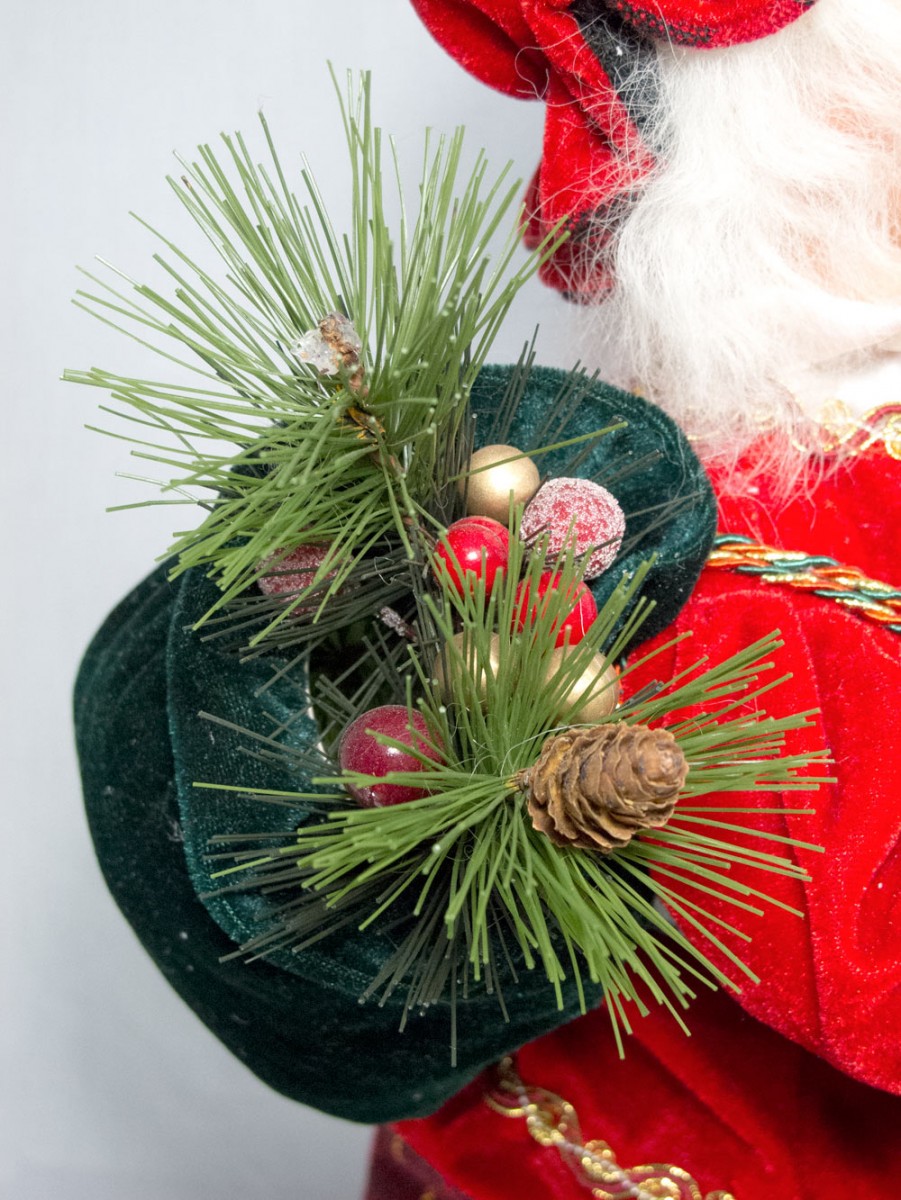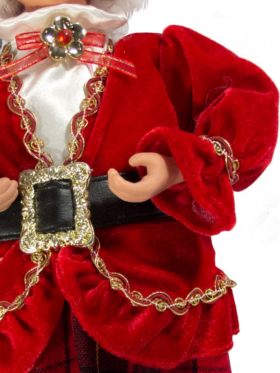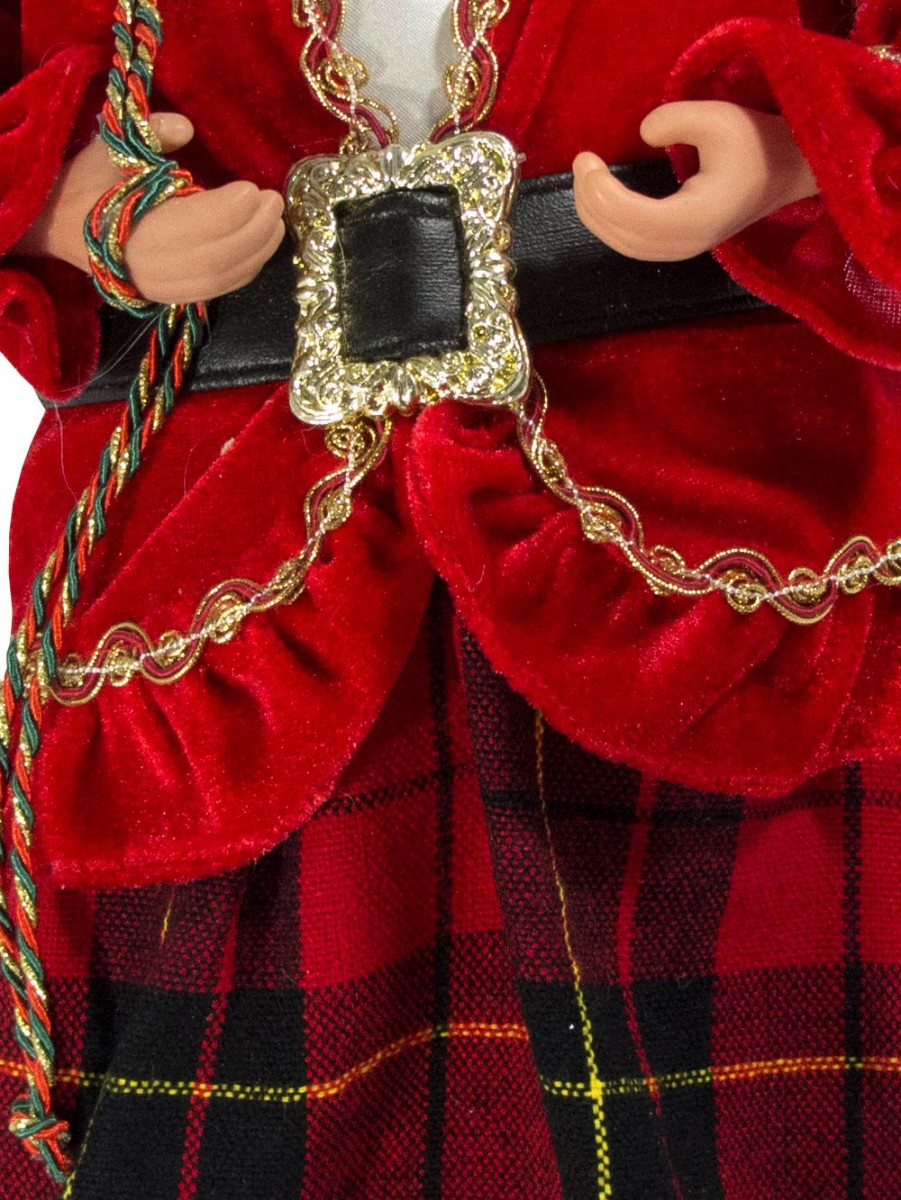 Our delightful Traditional Mrs. Claus comes to you dressed in a beautiful green and red plaid skirt with a white band and gold braid trim. She wears a white blouse with a red and white striped bow and silver ornament at her neck, and a red velvet coat with ruffled cuffs and hem. A wide black belt with a fancy buckle and a red velvet mob cap complete her ensemble, with a sprig of pine and a pine cone on her shoulder. Stands just over 18 inches tall and moves when activated.