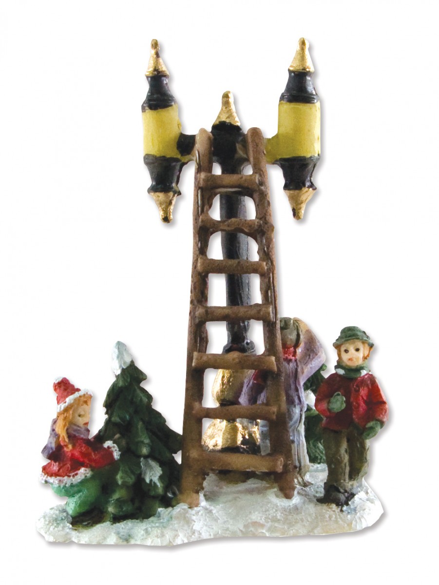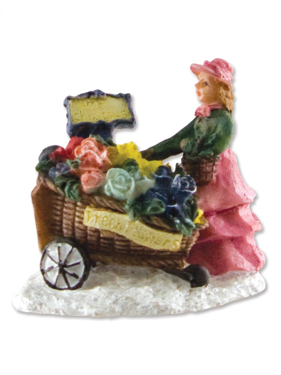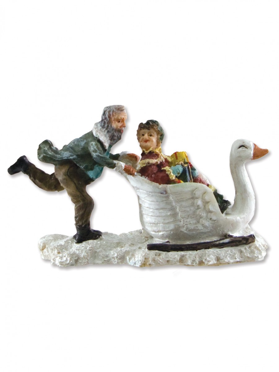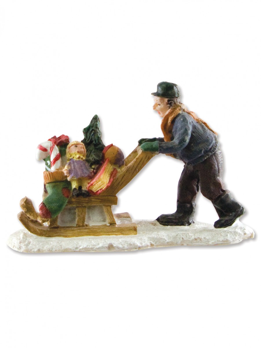 The nine piece set of traditional polyresin figurines comes with two trees dusted in snow, one old fashioned gas lamp post, and a motley assortment of people. Two youths appear to be engaged in conversation with a friendly hobo. A flower girl dressed in a pink dress and bonnet pushes a cart full of blossoms through the snowy streets. A child skips hand in hand with a man dressed as Santa Claus while a group of towns people are attempting to hang a wreath from a lamp post with a tall ladder. One man is pushing a sleigh full of Christmas gifts home while another pushes a swan shaped sleigh that bears his female companion. The figurines are sure to delight and inspire the young and old alike.