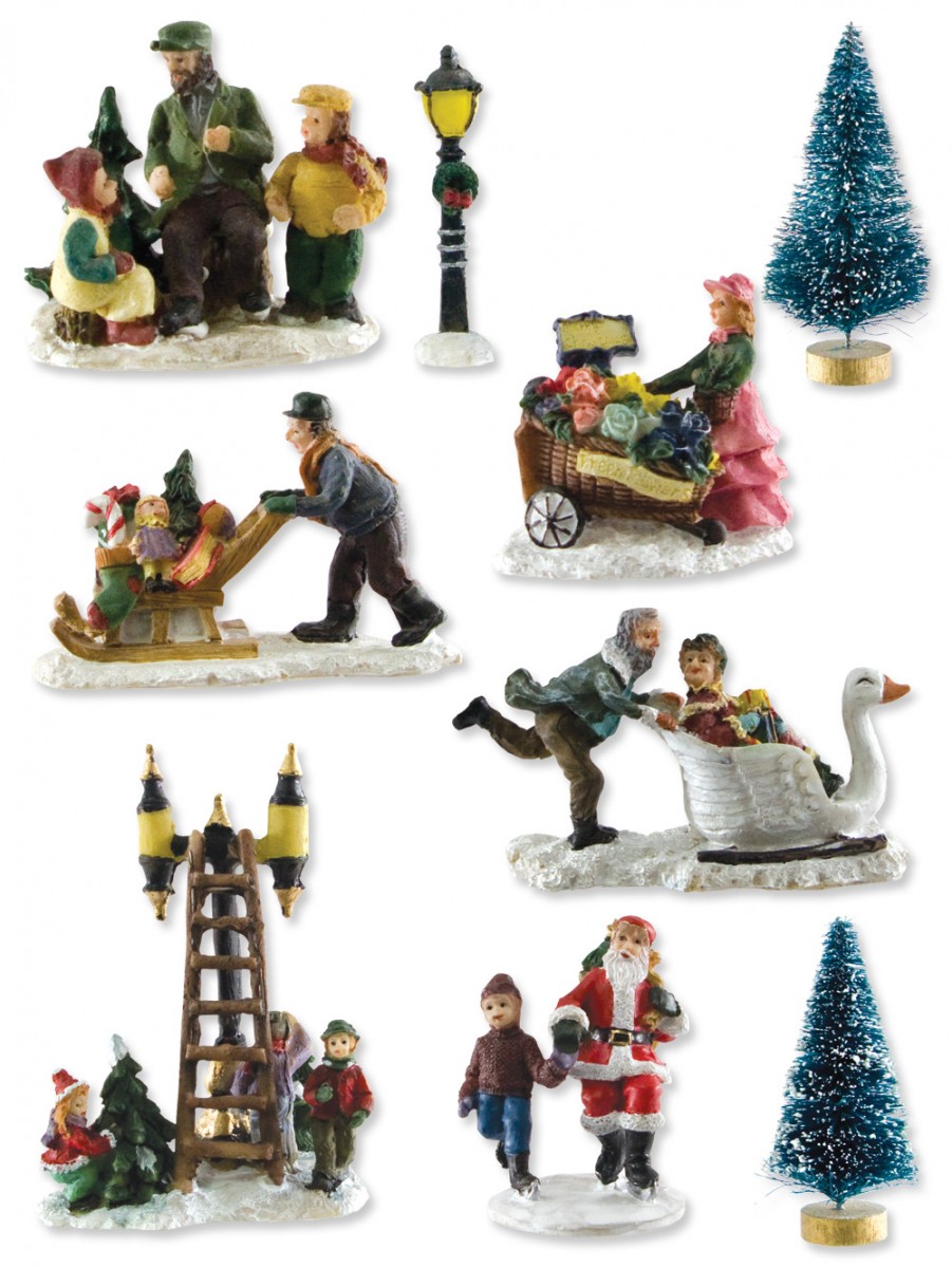 The traditional polyresin town scene comes in a set of nine individual figurines. Fill the streets of your tiny Christmas village with the hustle and bustle of holiday activities.