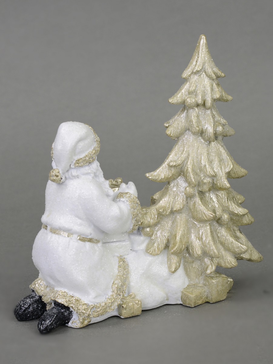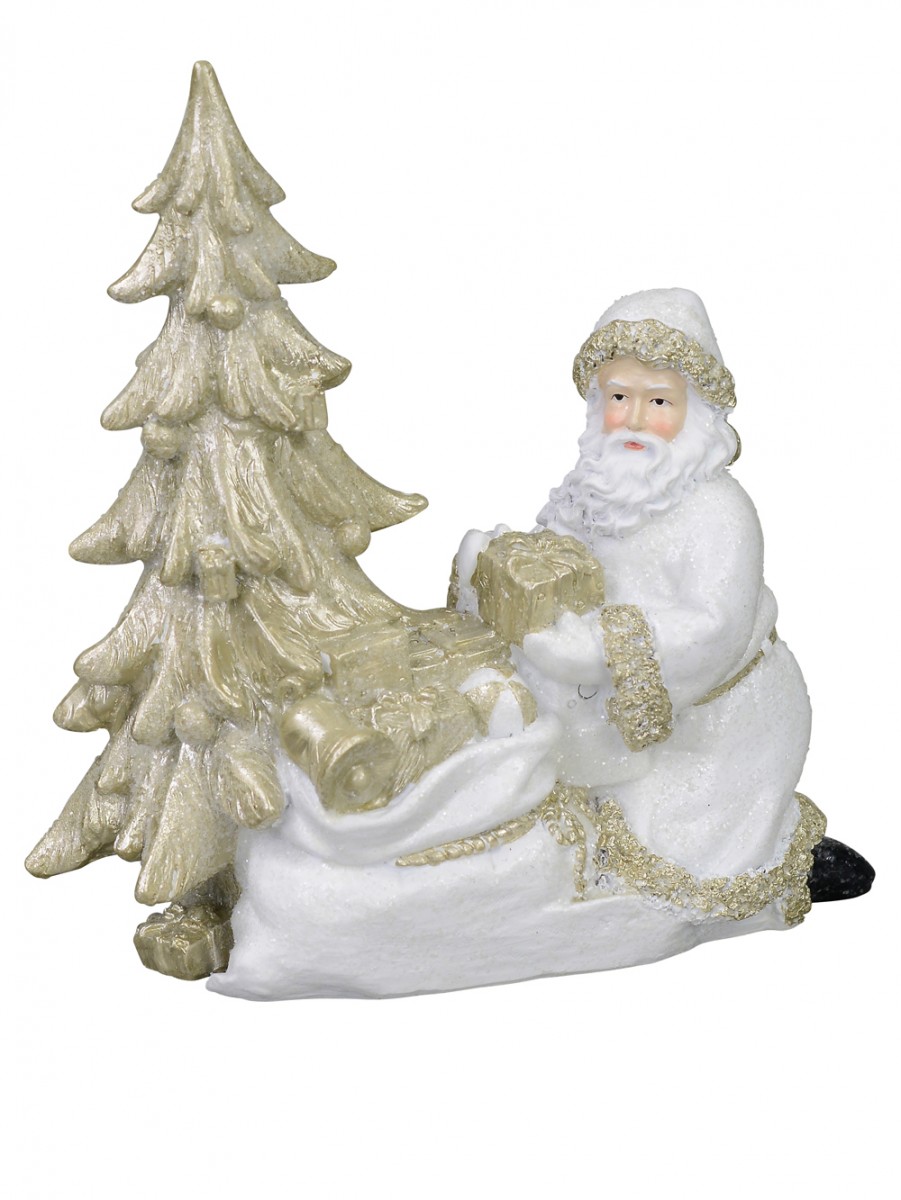 The Traditional Santa Placing Gifts Under Christmas Tree is an overture of grace and finesse. In this classic Christmas décor, Santa kneels to place a gift package beneath a Christmas tree. He is dressed in only White flowing robe which has champagne coloured hems and dons a white winter cuff hat with similar champagne hem.