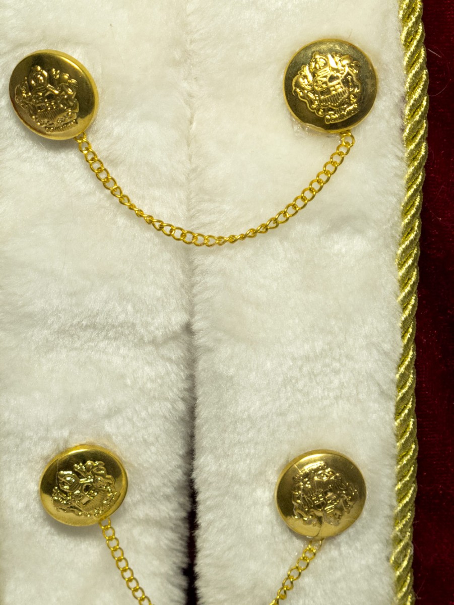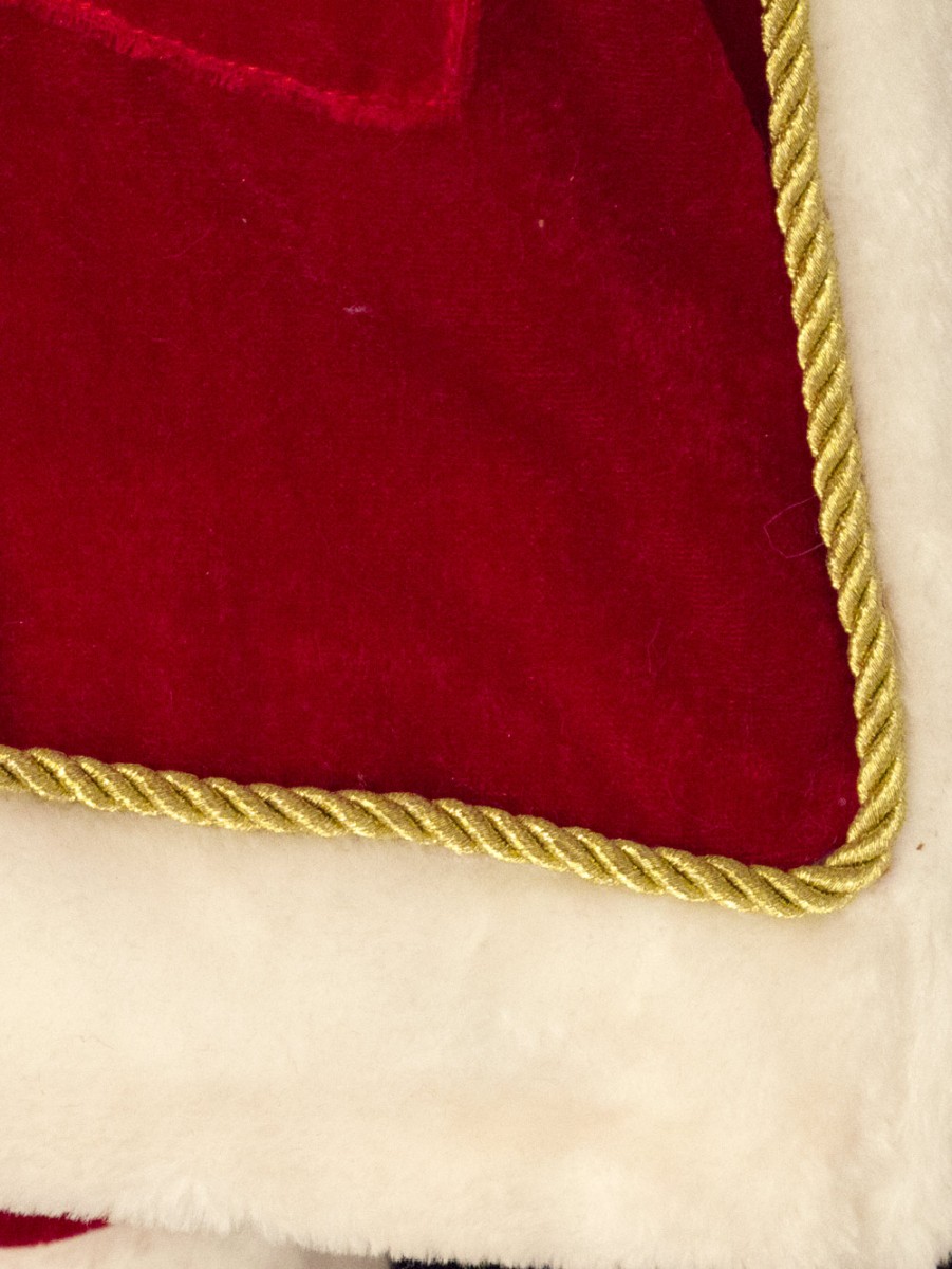 Our Traditional Santa with Gifts comes to you wearing a long old world style coat in red velvet that reaches to his shoes. It's trimmed all the way down the front and around the hem with white faux fur and has a white fur collar, with brass look buttons and chains. His long white hair, beard, and mustache surround a kindly old face.