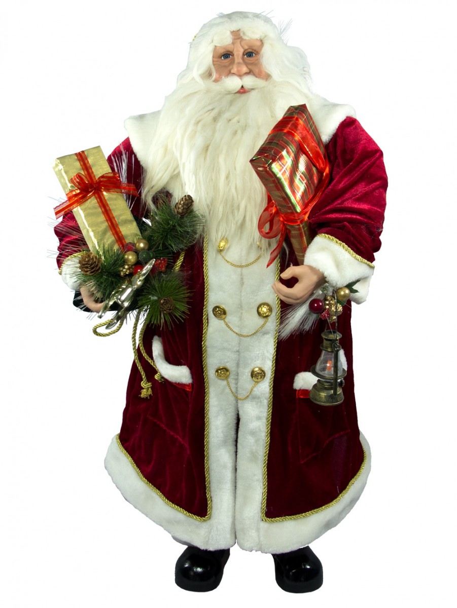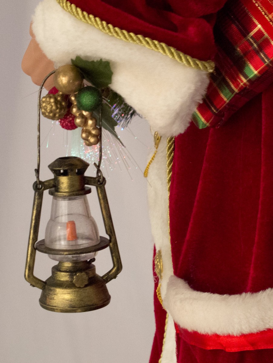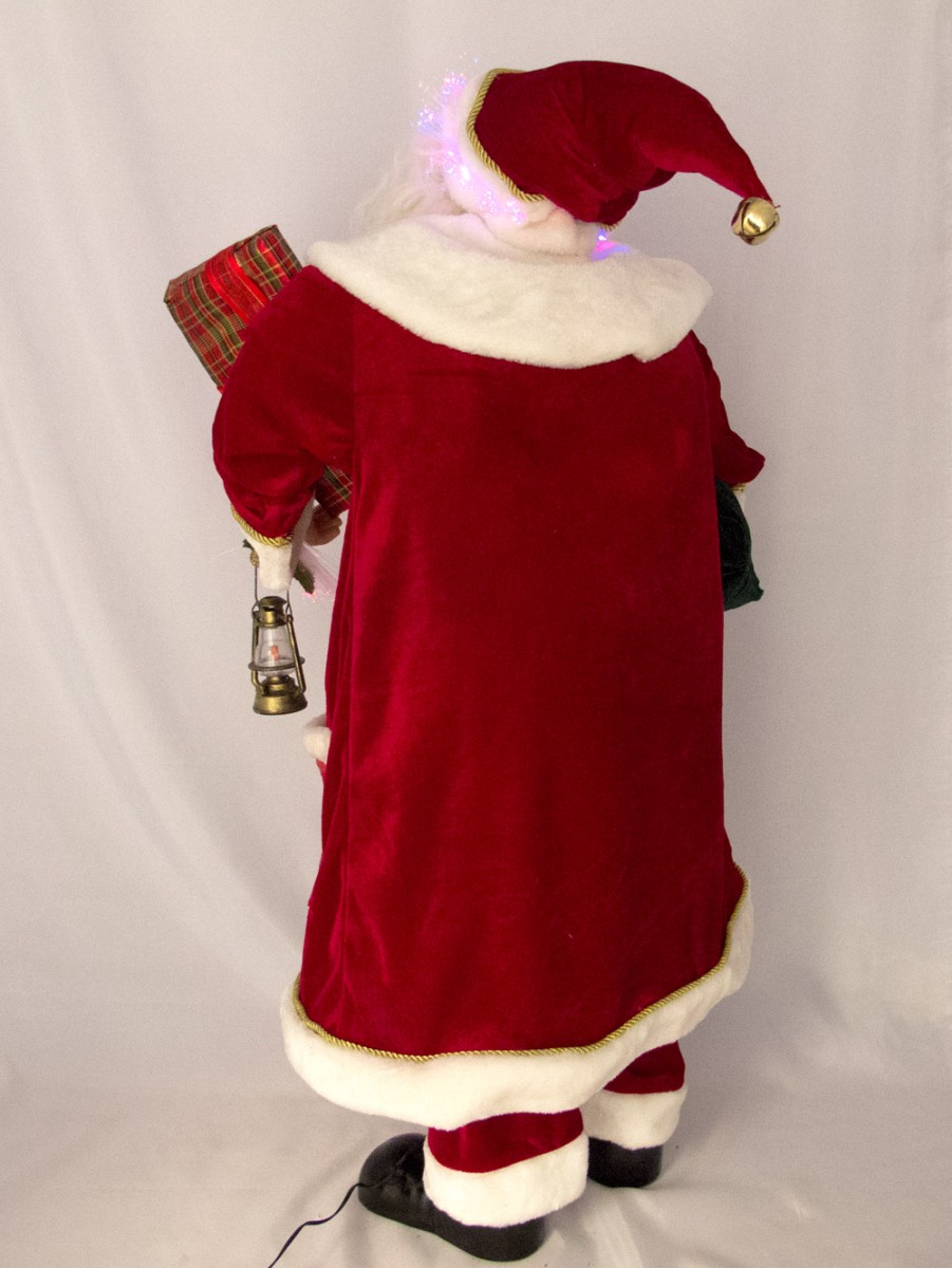 Santa is carrying an oil lamp, baubles, greenery, and gifts wrapped with gold foil and tied with red ribbons and bows. Figure stands just less than 3 feet tall. Fiber optic lights and animation are activated with on/off switch.