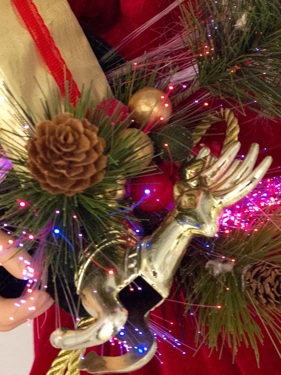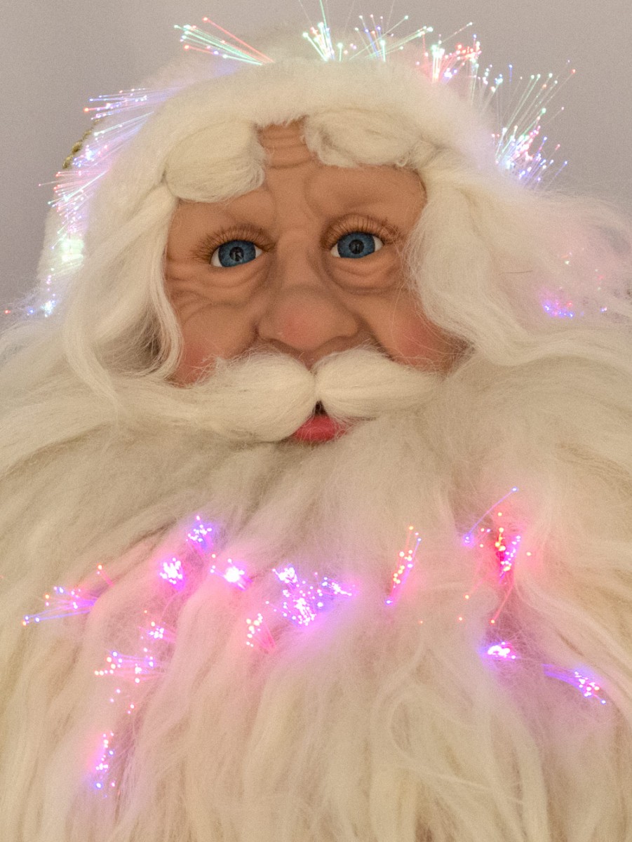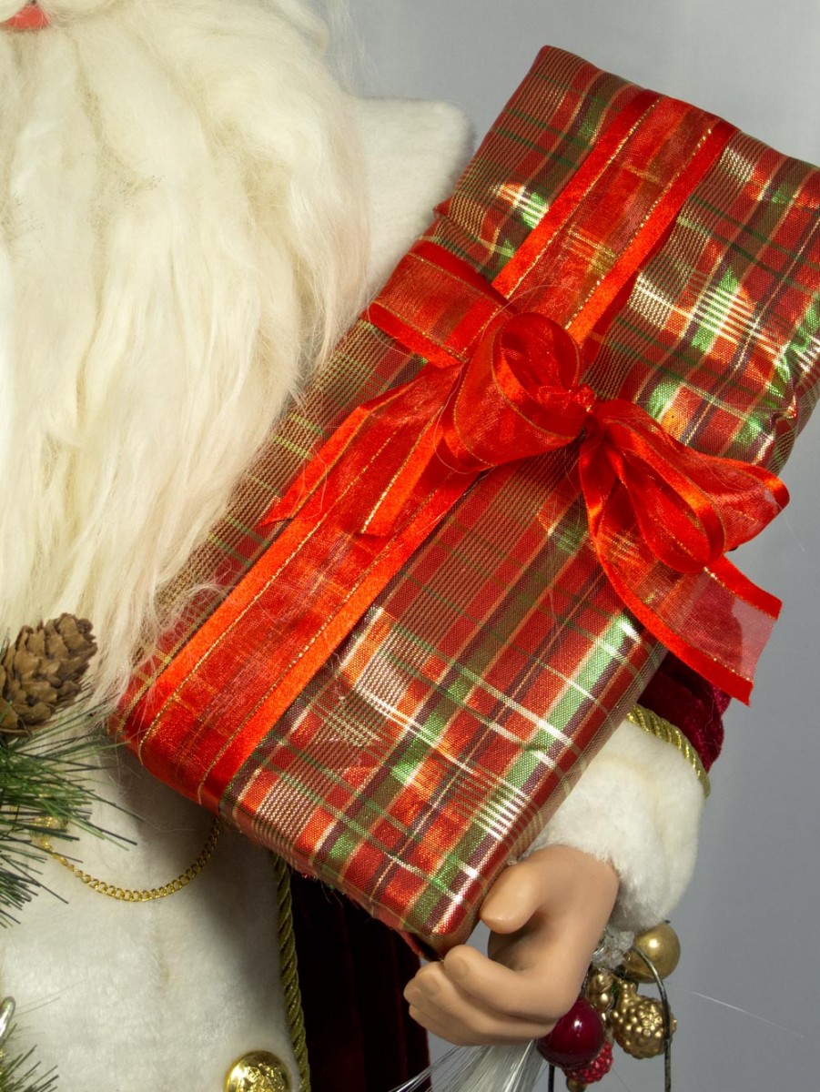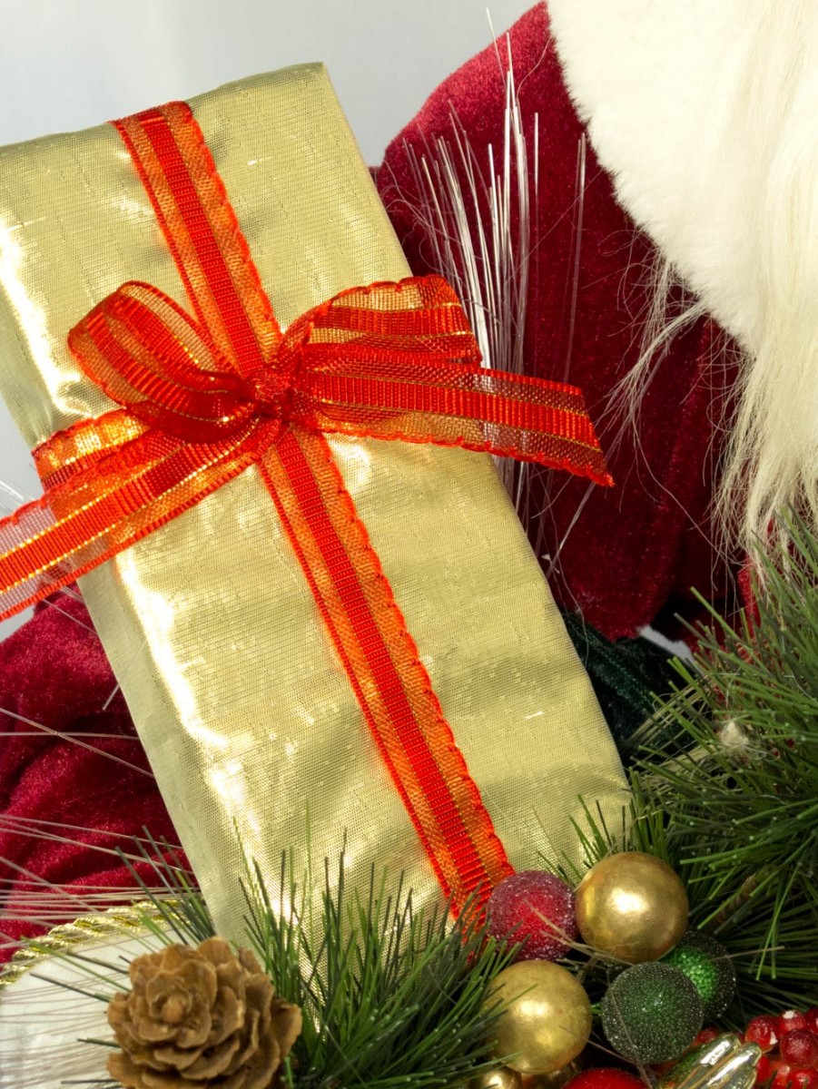 Santa is carrying an oil lamp, baubles, greenery, and gifts wrapped with gold foil and tied with red ribbons and bows. Figure stands just less than 3 feet tall. Fiber optic lights and animation are activated with on/off switch.