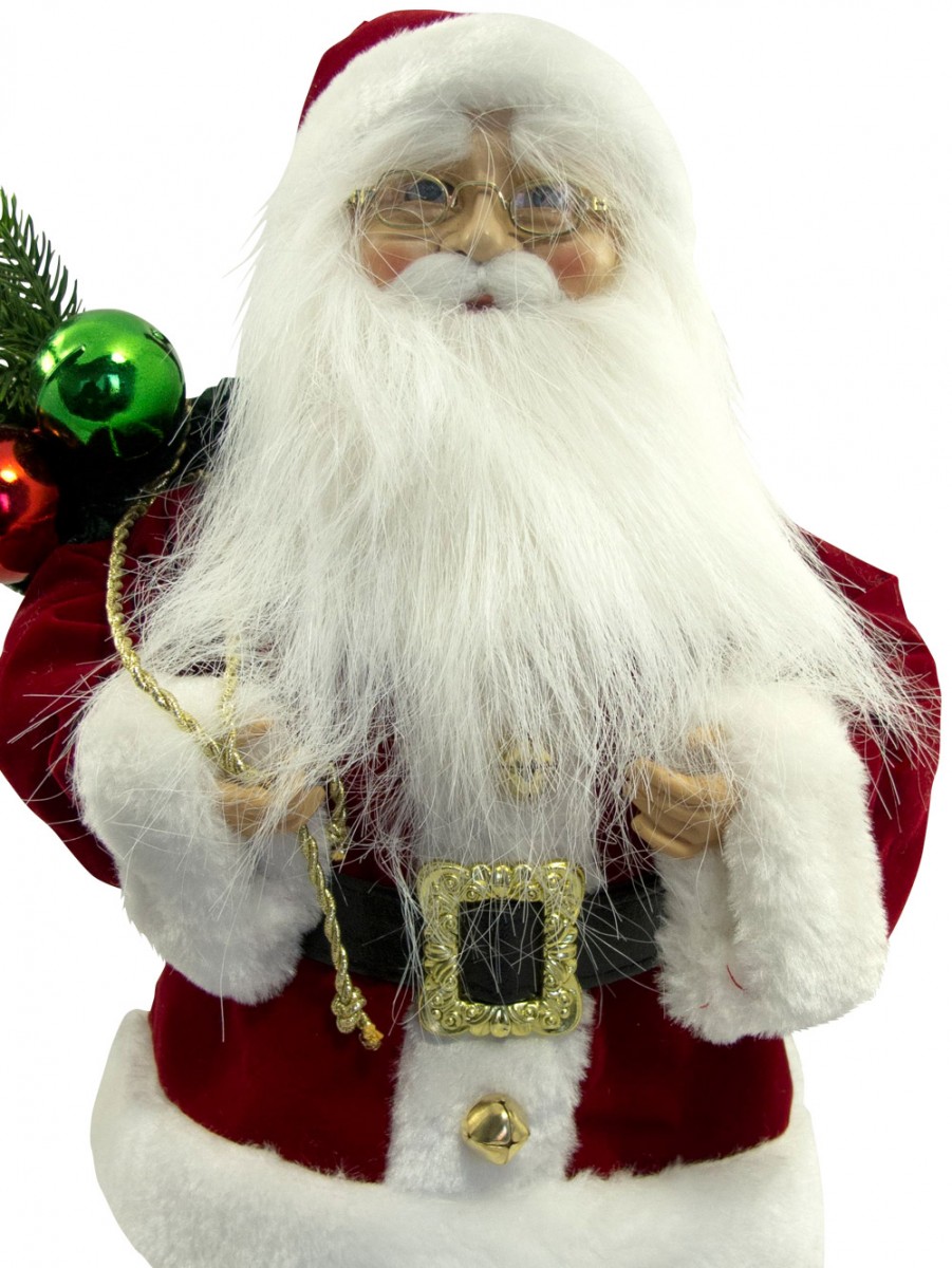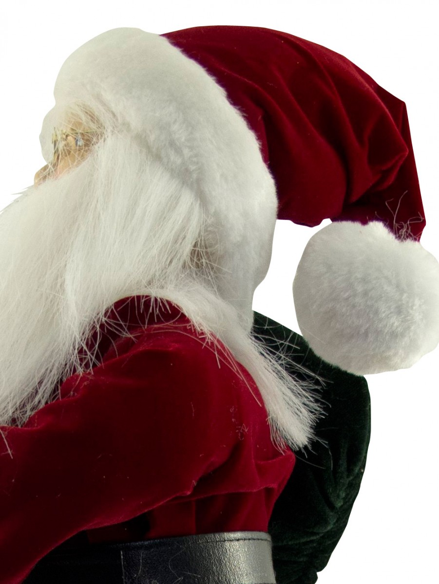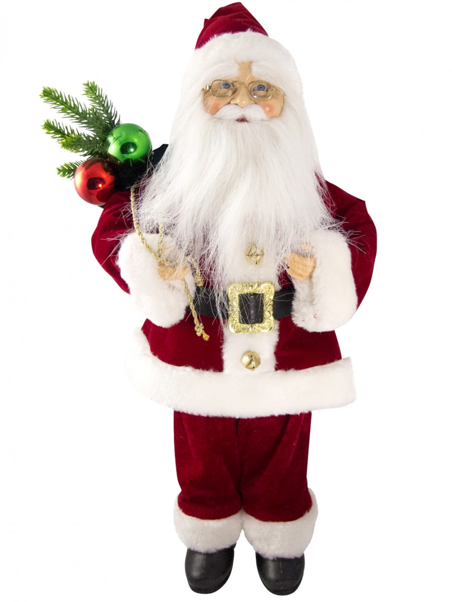 Celebrate the yuletide season with the festive ambiance everywhere! Large decorations such as this Traditional Suit Standing Santa With Sack is the perfect accessory for any jovial season celebration. This ornamental piece is a head turner which could accentuate anywhere anytime. It could be simply placed in homes, offices and any venues for that instant holiday sprucing up. The Traditional Suit Standing Decorative Santa With Sack is measured 46cm and made from the finest quality materials. It is designed with the plump Santa Claus trademark, white white beard and matching red and white hat. The eye catching yuletide accessory is also designed with the deep and regal red suit with white padded edges and classic gold glasses and belt buckle. The Santa pants have the red palette with white padded edging. Santa is also holding a sack with a combination of baubles, pine twigs and wrapped gifts.