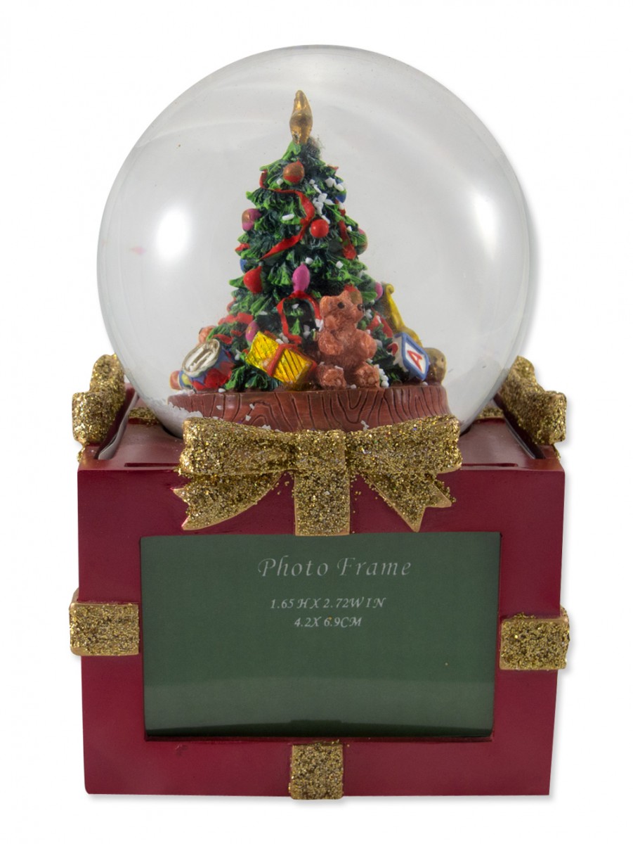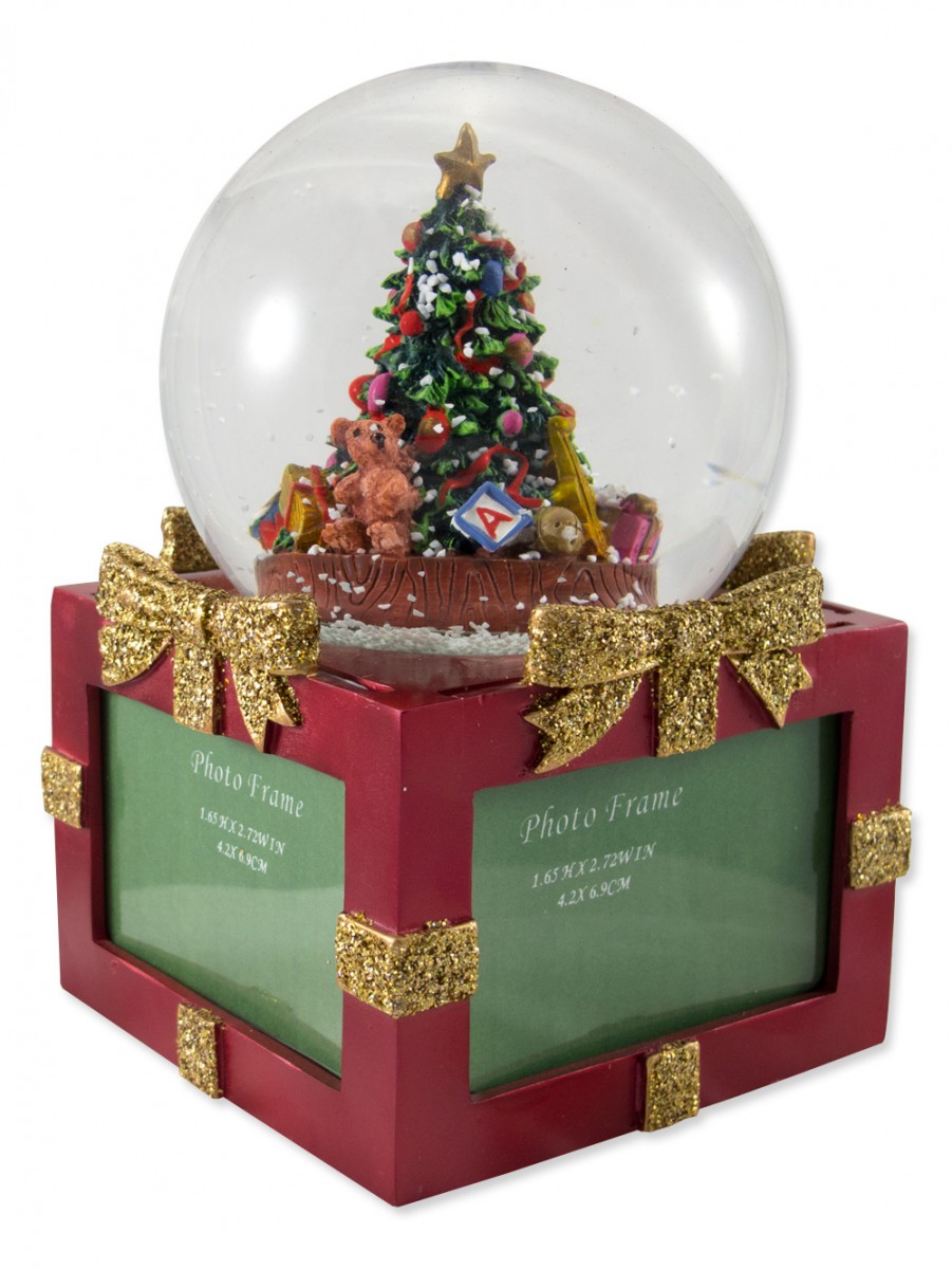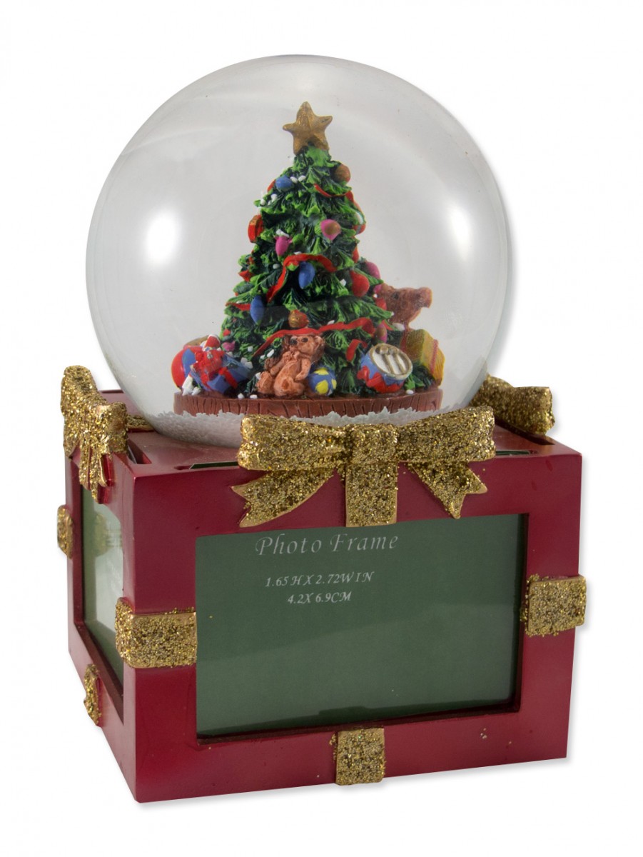 Snow globes have a rich history that dates all the way back to France in the late 1800s. It's no surprise that they've been around so long as their stunning beauty creates wonder and excitement for everyone from the very young to the elderly. They're a must have in any home, especially during the holiday season. This Tree Waterball With a Photo Frame Gift Box Base is an exquisite example of why many continue to buy and decorate with snowglobes. The base, which is decorated with a gold glitter ribbon and bows, consists of a red box that has place to put a photo on all four sides. The snowglobe portion depicts a beautifully decorated Christmas tree surrounded by toys and stuffed animals for a deserving child. The best aspect of this item is that it also winds up to play "We Wish You a Merry Christmas." It's a wonderful item whether you keep it for yourself or choose to give one as a gift.