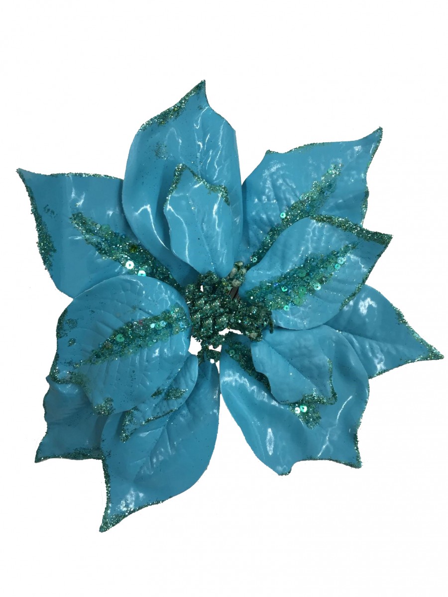 Give a distinctive look to your Christmas tree or displays with this beautiful Light Blue Poinsettia Clip On that is sure to give some sophistication and style to your decorations this season. Its light cool blue colour has an intricate leaf-like design outlined with a darker shade of blue glitter and sequins embellished from the centre that gives this ornament a pretty icy flower look.