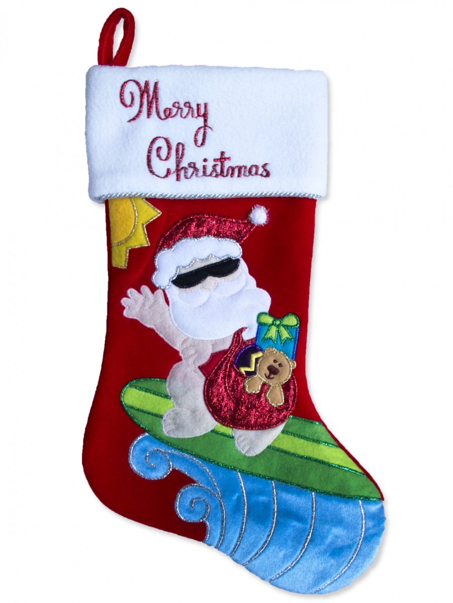 Christmas stockings are a must have in every home during the holidays. Without one, it just seems like something is missing. While there is nothing wrong with the plain and traditional red and white stockings, sometimes it just needs a little more flair. This Velvet Stocking showcases how Santa gets around when he travels to places where his sleigh and reindeer can't get to. While the stocking itself is red with a white cuff and has a red loop at the top for easy hanging, the front also depicts Santa decked out in his swimwear and surfing a huge wave on a green surfboard while wearing a red and white hat and carrying a big bag overflowing with toys. He's also rocking stylish black shades. "Merry Christmas" is embroidered with red metallic thread in elegant script. It's the ideal Christmas stocking for those who want a little humor and charm as part of their holiday d�cor.