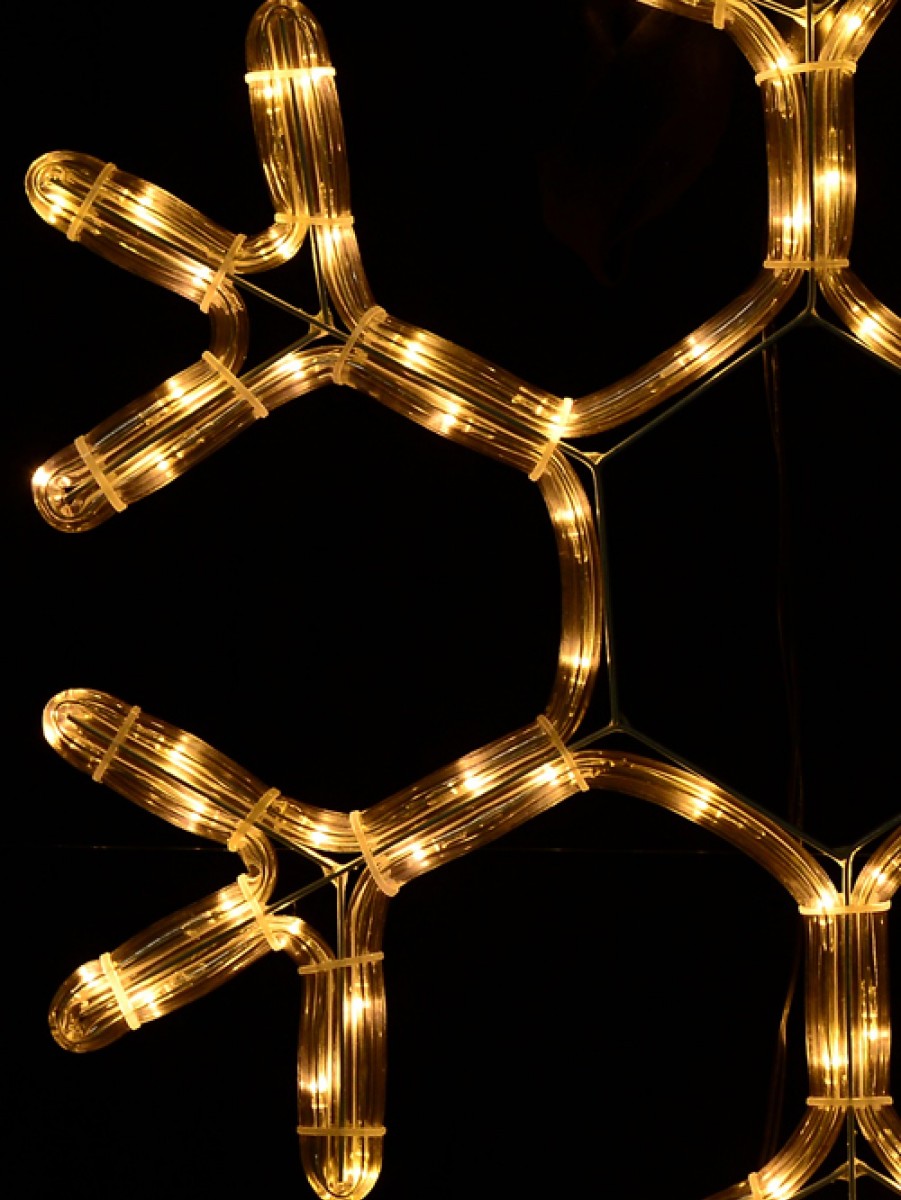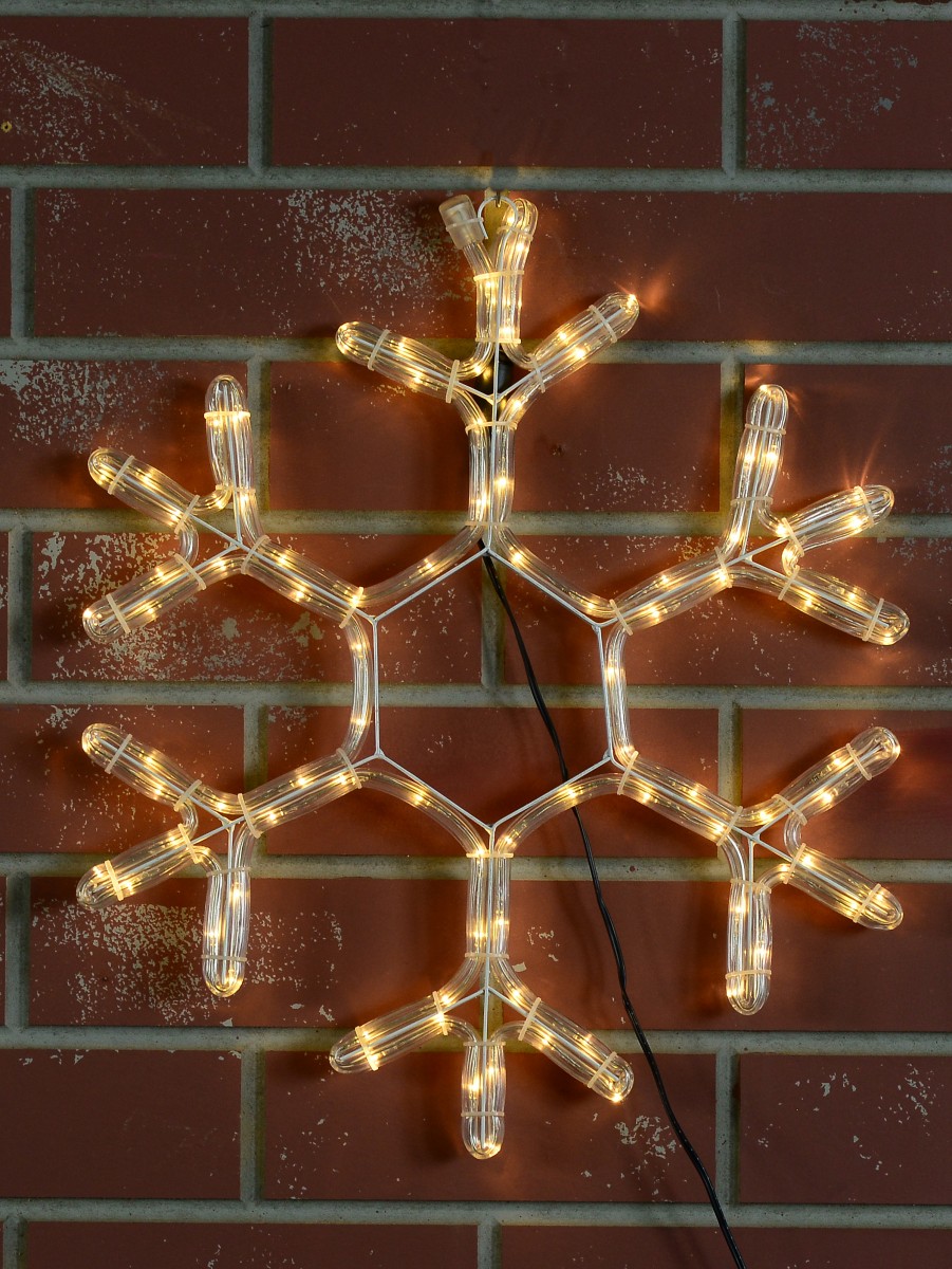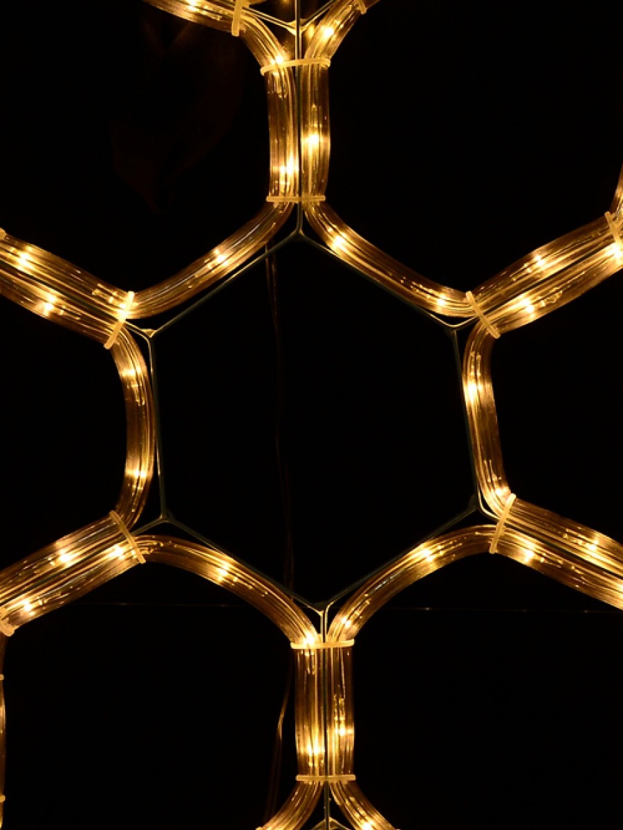 Ever seen warm white, almost golden coloured snowflakes before that you can hang up anywhere you want? No? Here's an illuminated rope light silhouette in the classic snowflake shape you will love. The ice crystal star design branches out from the centre to make it look like dendrites. The display includes 96 warm white LED concave bulbs inside a clear tube each spaced at exactly 42 mm between one another. The silhouette comes with a mounted frame with loop for easy display. All of these warm white LED branched snowflake silhouettes comply with Australian safety and performance requirements so they work incredibly well indoors and outdoors too. These snowflake lights are sold individualy but you cna get pairs of these to o decorate your doors, windows, and the Christmas tree or add to other decorations this Christmas.