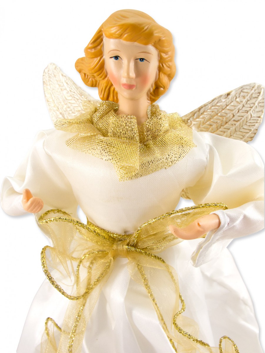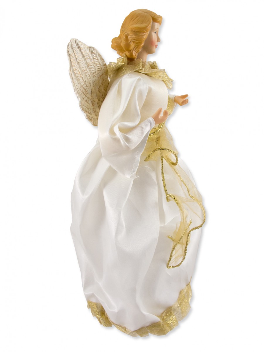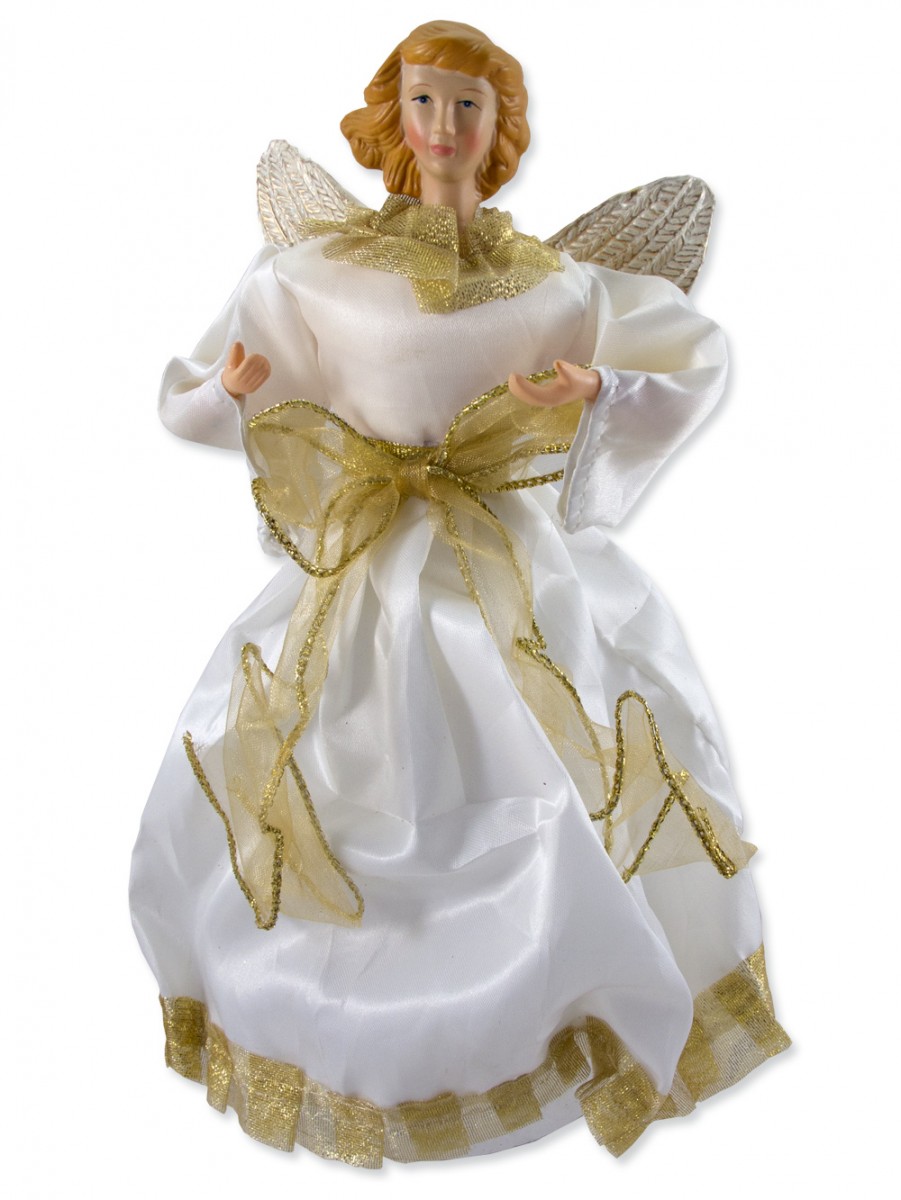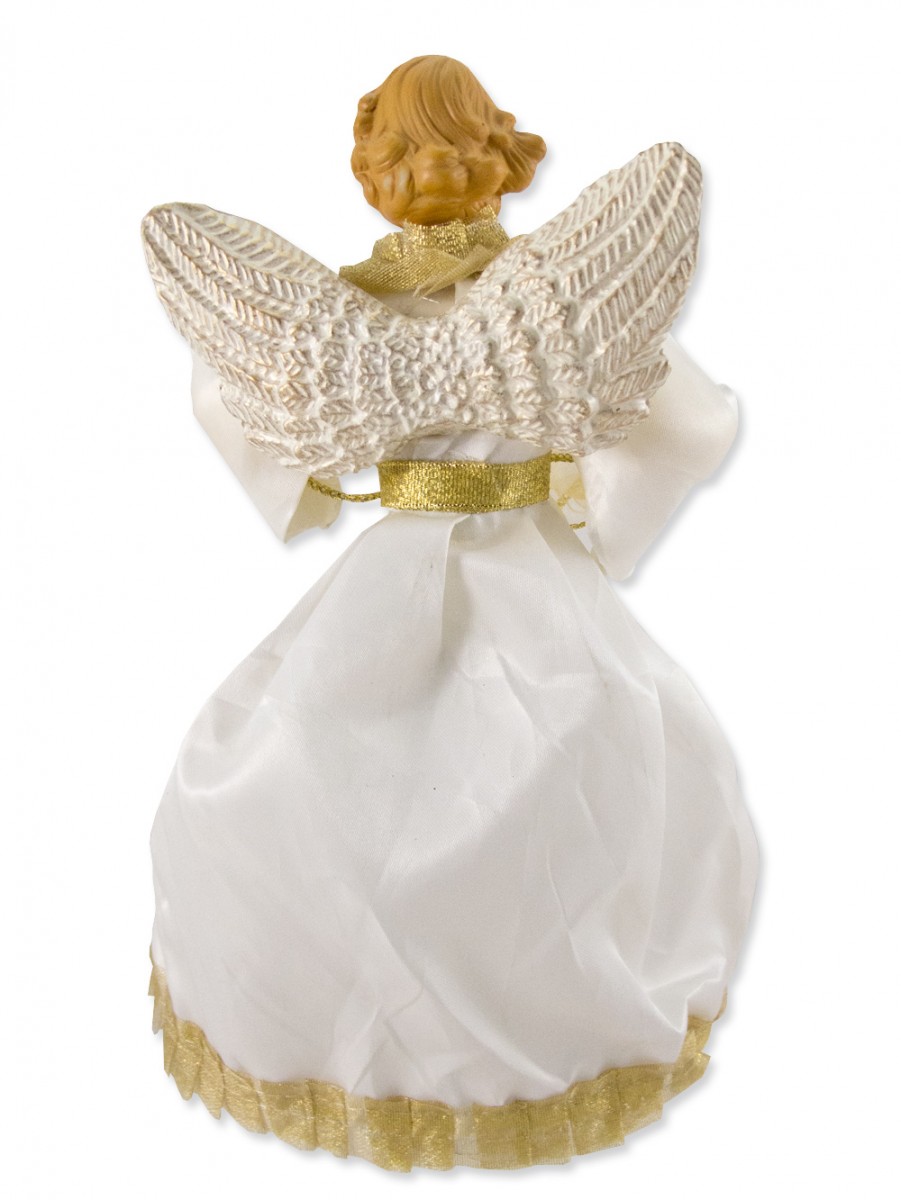 Everyone loves a flashy display of Christmas decorations and colourful lights, but sometimes it`s the simplest things that make the holiday season wonderful. A beautiful angel atop the tree, or in the centre of the table, can be an effortless way to spread the festive spirit. This decorative angel is dressed in a white gown, with a gold sash and trim. Along with her skilfully created cream wings, she symbolises the beauty and true meaning of the season. cone base allows this item to be used as more than just a magnificent tree topper. Measuring 25cm tall and 10cm wide, this classic angel can be the perfect focal point among the other Christmas decorations on your mantle. You might also place her on the sideboard during dinner, or at the window surrounded by candles - elegant and traditional, she can fit into any area of your home. This angel looks majestic with golden hair and a flowing layered dress. This piece is sure to be a wonderful sight for many holidays to come.
