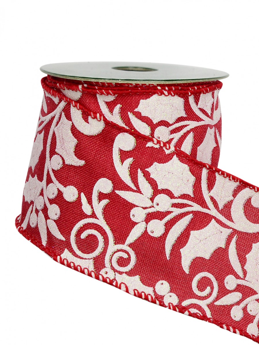 White Holly Leaf & Berry Pattern On Red Ribbon - 3m