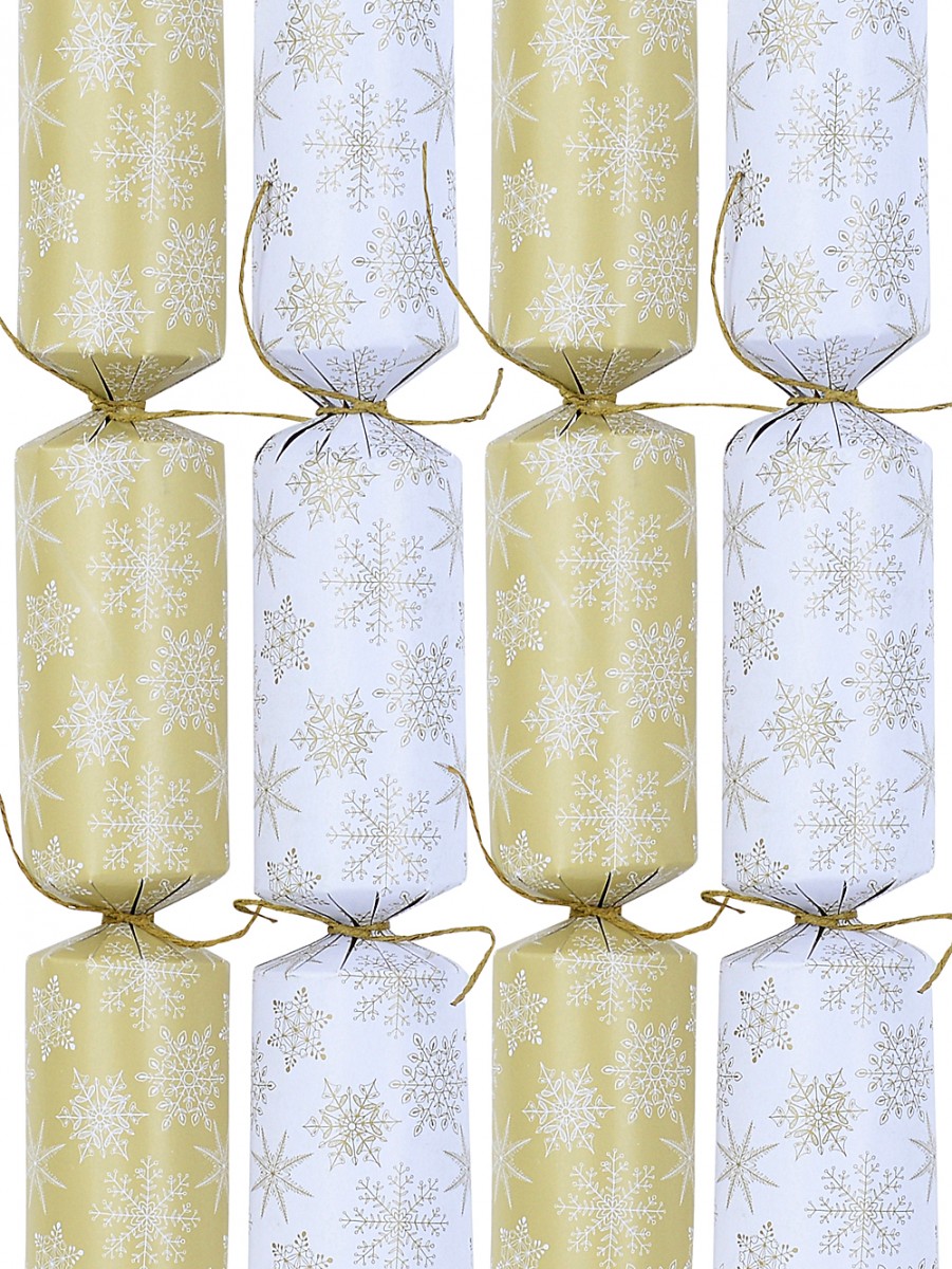 Each cracker, measuring an ample 50mm x 50mm x 30cm, showcases a luxurious blend of matte gold and pristine white, adorned with an intricate snowflakes pattern. Their sophisticated design is perfect for complementing any holiday theme, whether you're dreaming of a white Christmas, donning traditional red and green, or creating a minimalist and modern festive display.
