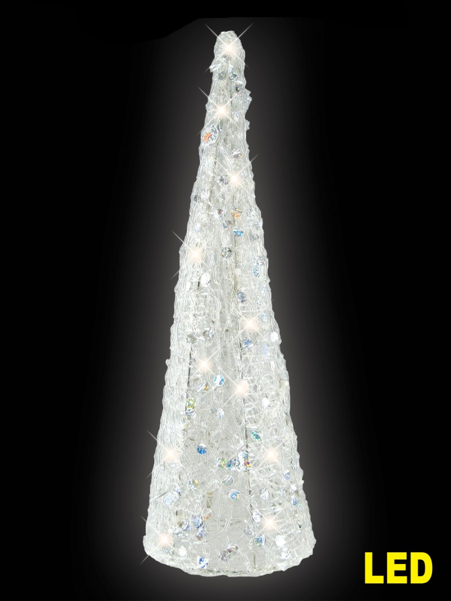 This battery operated pyramid light setting designed for the table top has 12 LED globes set in amongst silver sequins for some added sparkle. The base measures 14cm and it is 40cm high. It uses three AA batteries, and the LED globes mean that you should get maximum time and super bright lights with low energy needs, so your batteries should last a long time. Christmas means food, and food means tables. It doesn't matter whether you're setting a formal table or a big buffet, the table is a place where food and decorations come together. You need to consider how you light your table for mood and effect, without the lighting getting in the way of people's sight lines and access to all the goodies. Think about the impact of a room set up for a function with the white sparkling lights of these pyramids as centrepieces throughout a large space; or a line of them marching down a long buffet table. Whether you need one for your home to make a simple but elegant Christmas dinner table display, or you need multiple displays for a function, these beautiful light-up pyramid trees are all class.