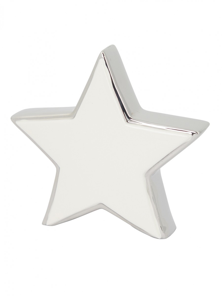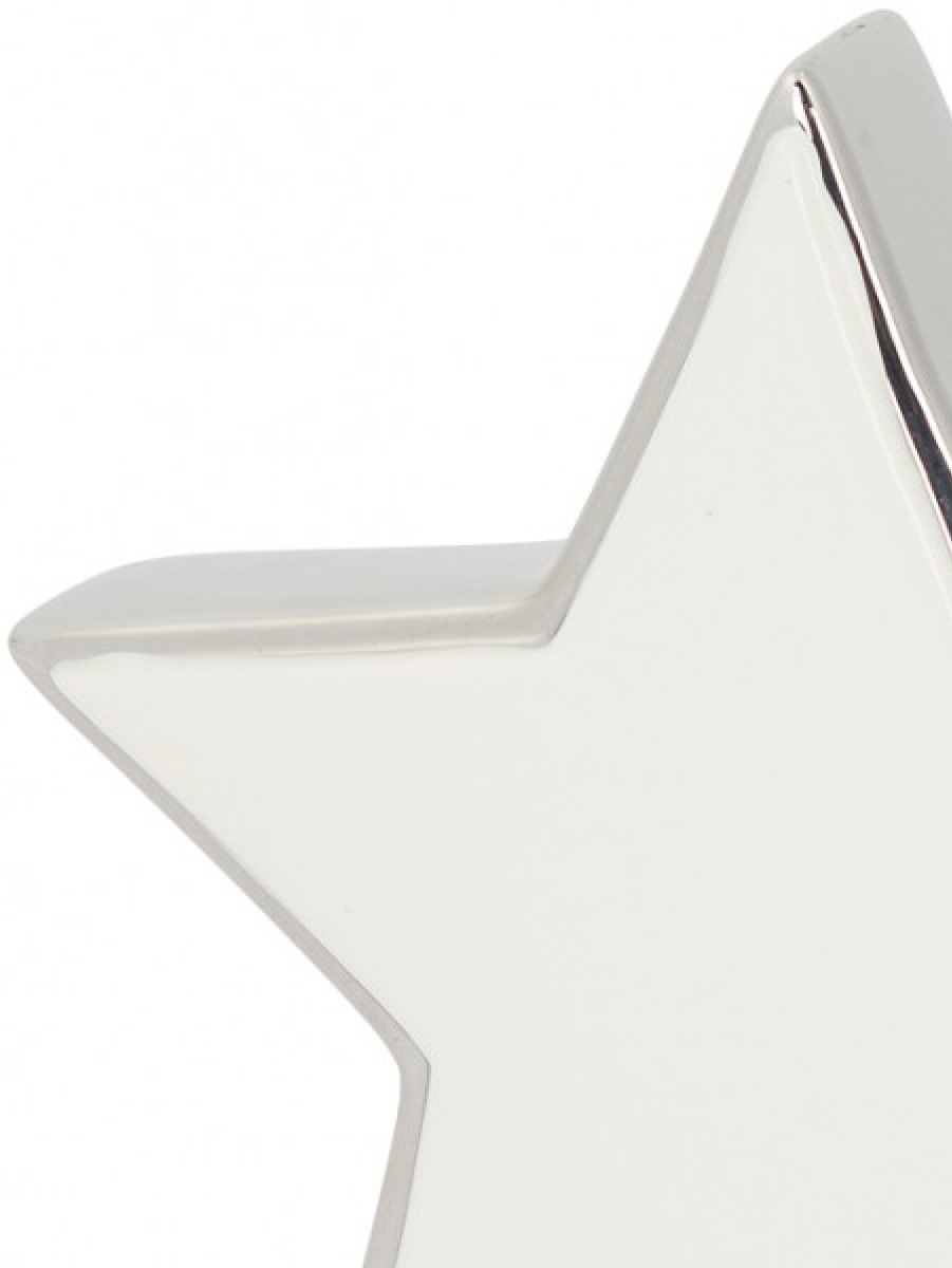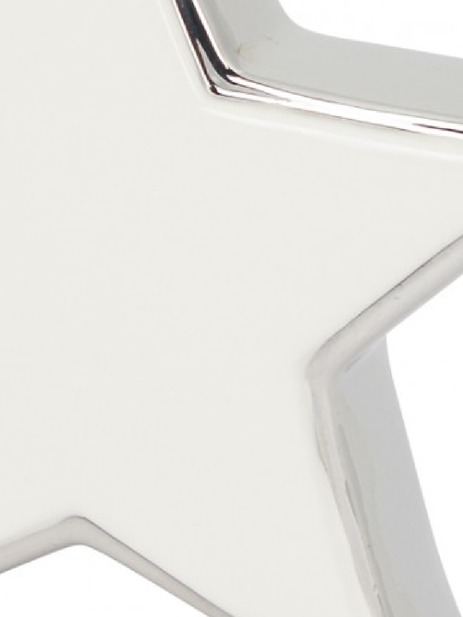 The 21 centimetres tall, immaculately white ceramic standing ornament has a touch of silver at the edges and is made of carefully refined ceramic material with a smooth and glossy feel. It is a five point star shaped ceramic ornament that would blend in perfectly with every interior and exterior setting due to its white choice of hue. It is smooth with no jagged or prickly edges.