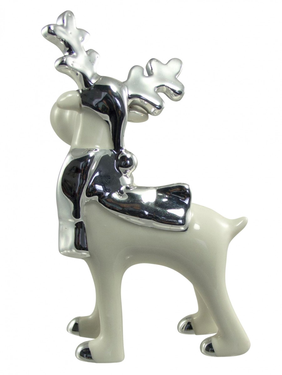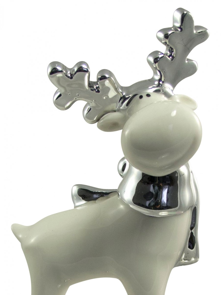 Reindeer are one of the most joyous symbols of Christmas around, as Santa�s sleigh is driven by them. They are one of the most loved Christmas gift and decoration items. This winter white reindeer is made of ceramic with silver colored horns and a scarf around its neck, which makes it an excellent spectacle for the guests to see during your Christmas party, or it would be ideal if you hang it from your Christmas tree. This reindeer comes in a dimension of 9 cm x 6 cm x 16 cm and stands out from the other Christmas gifts and decorative items with its shiny, glazed appearance teamed up with silvery ornaments around its neck and horns.