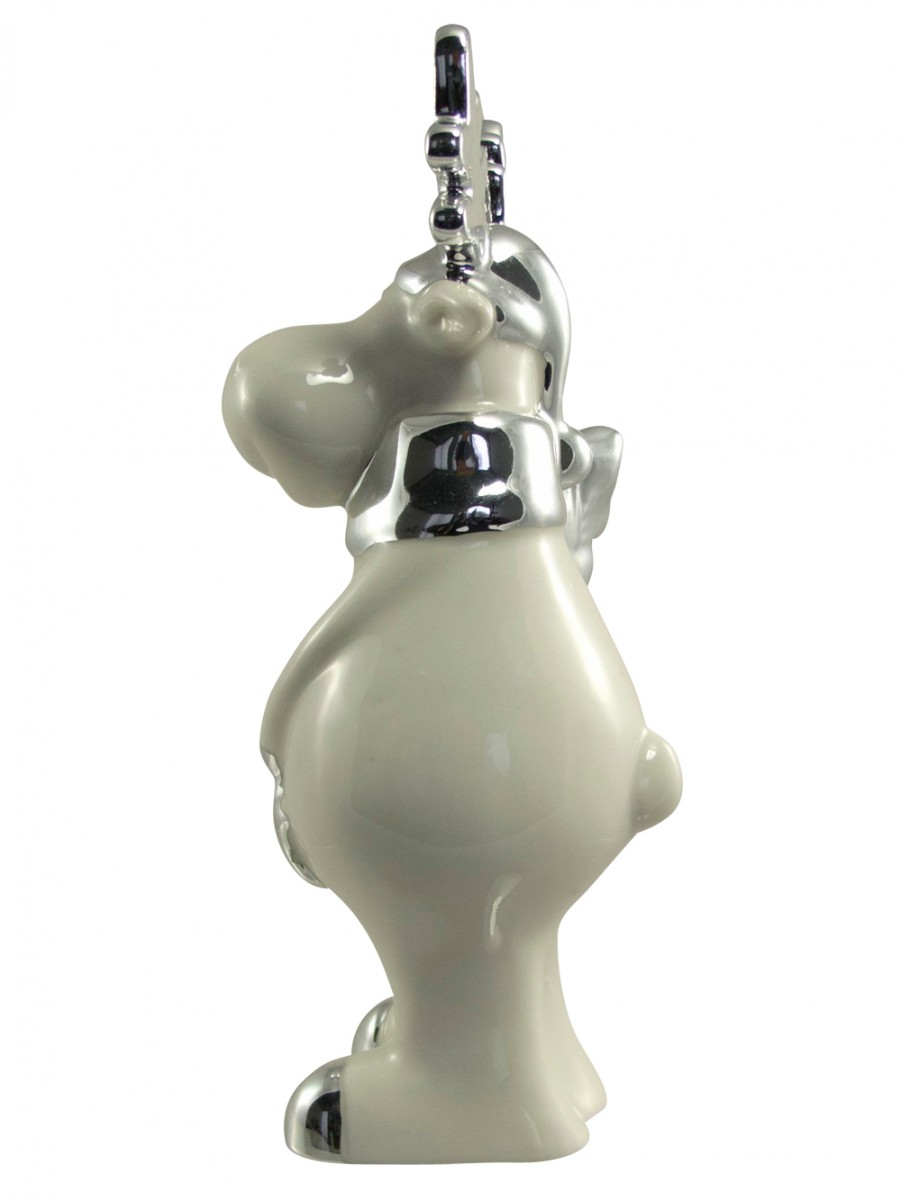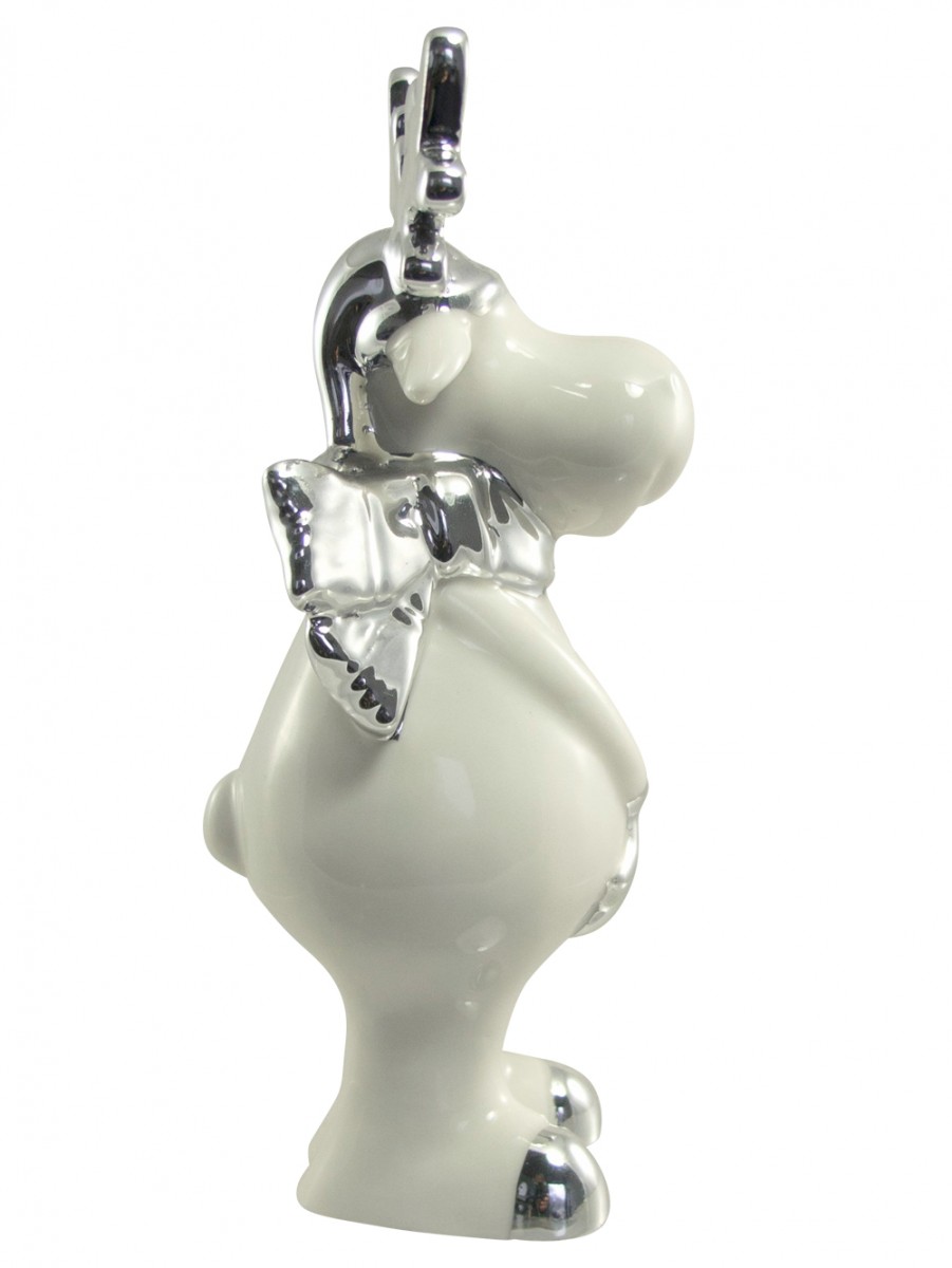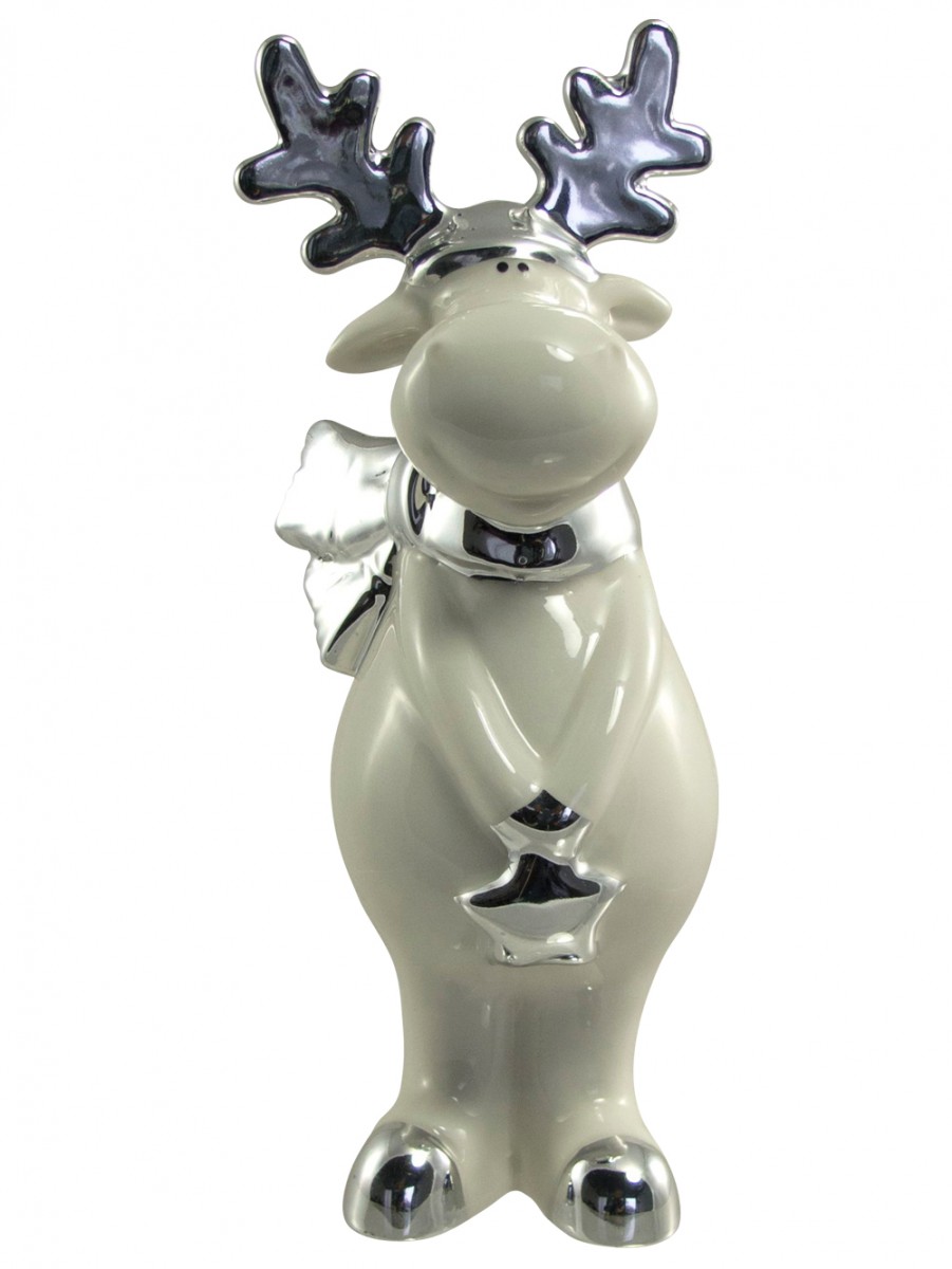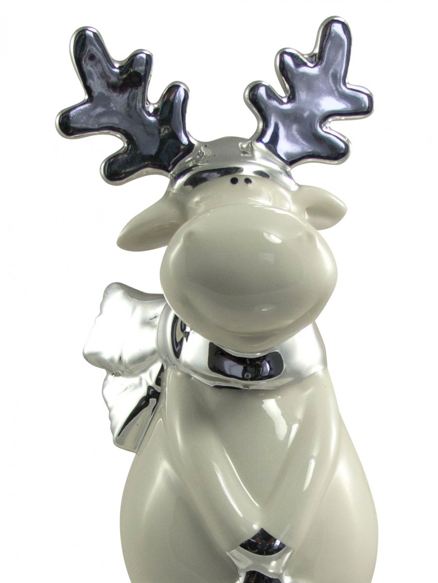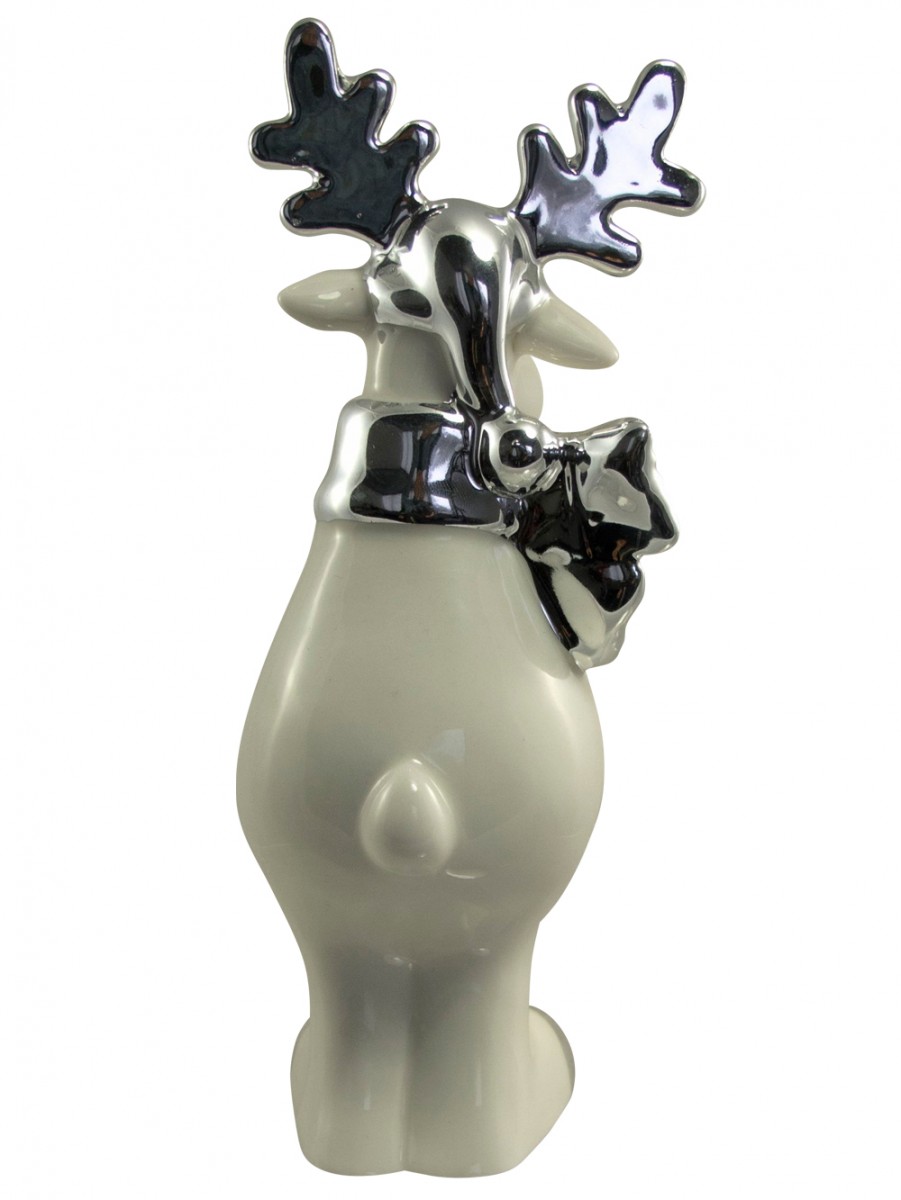 An intricate Christmas ornament in the shape of a Reindeer with detailed features. The large reindeer is ceramic and is finished in a shiny white or silver glaze depending on the part of the product. This ceramic winter reindeer has a detailed scarf and antlers and is holding a star. All features are finished in silver, shiny glaze. The ends of the feet of the reindeer are also finished in a silver glaze. The white winter ceramic reindeer with the star is 8cm wide, 8cm deep and 20 cm tall. This Christmas product is sold during the Christmas season and should be used for decorative purposes. The product is sold individually and is individually priced. In addition to this, the white ceramic winter reindeer can be shipped worldwide.