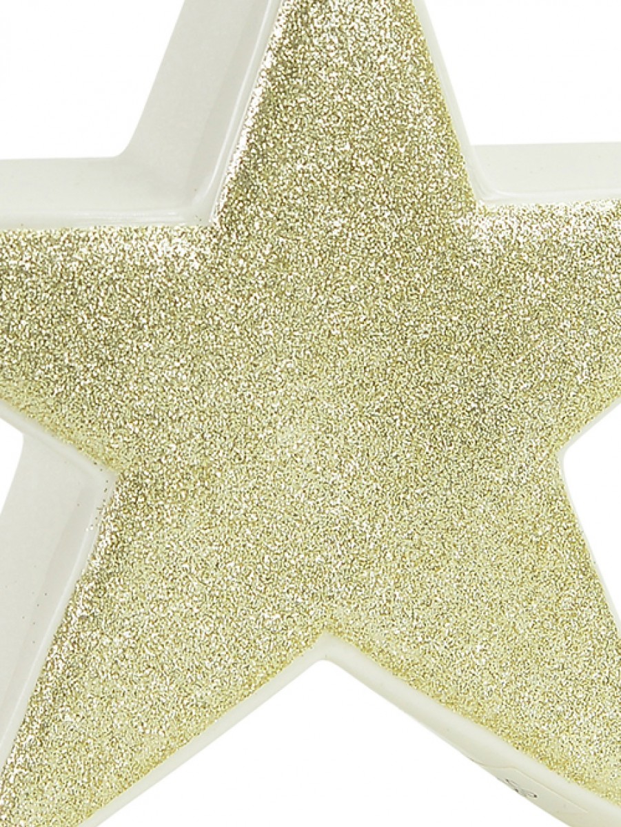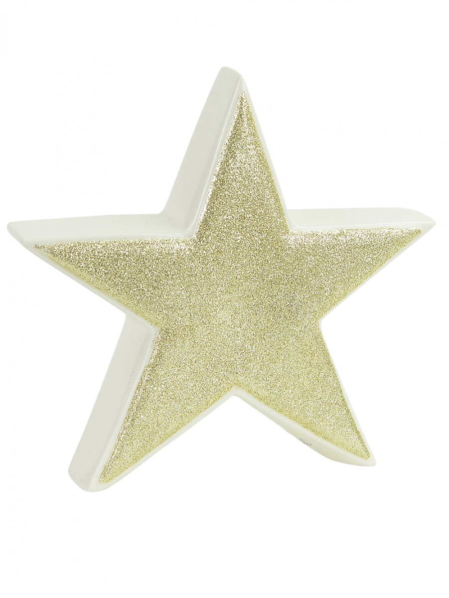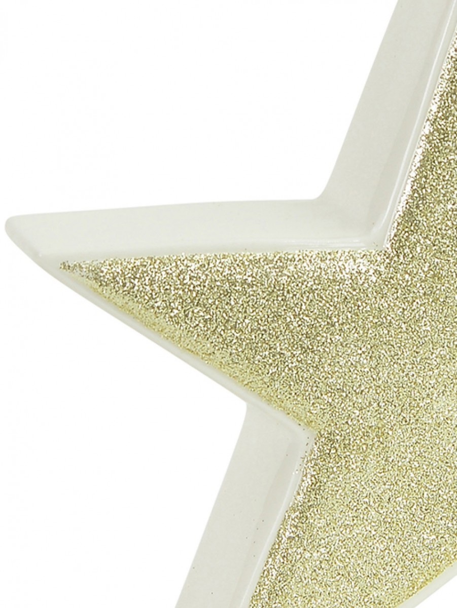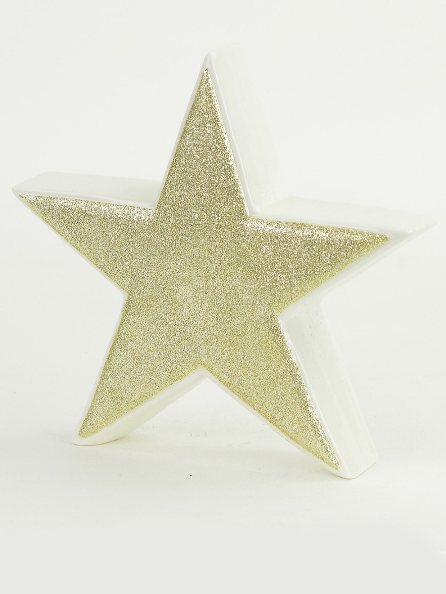 This Free Standing Star Ornament is the perfect arrangement accent that will give some shine and symmetry when placed on the mantelpiece, on your desk, hearth, coffee or end table, buffet, or kitchen counter! It is made of white ceramic with gold glitter embossed side with a dimension of 17cm x 40mm x 17cm and is sold individually.