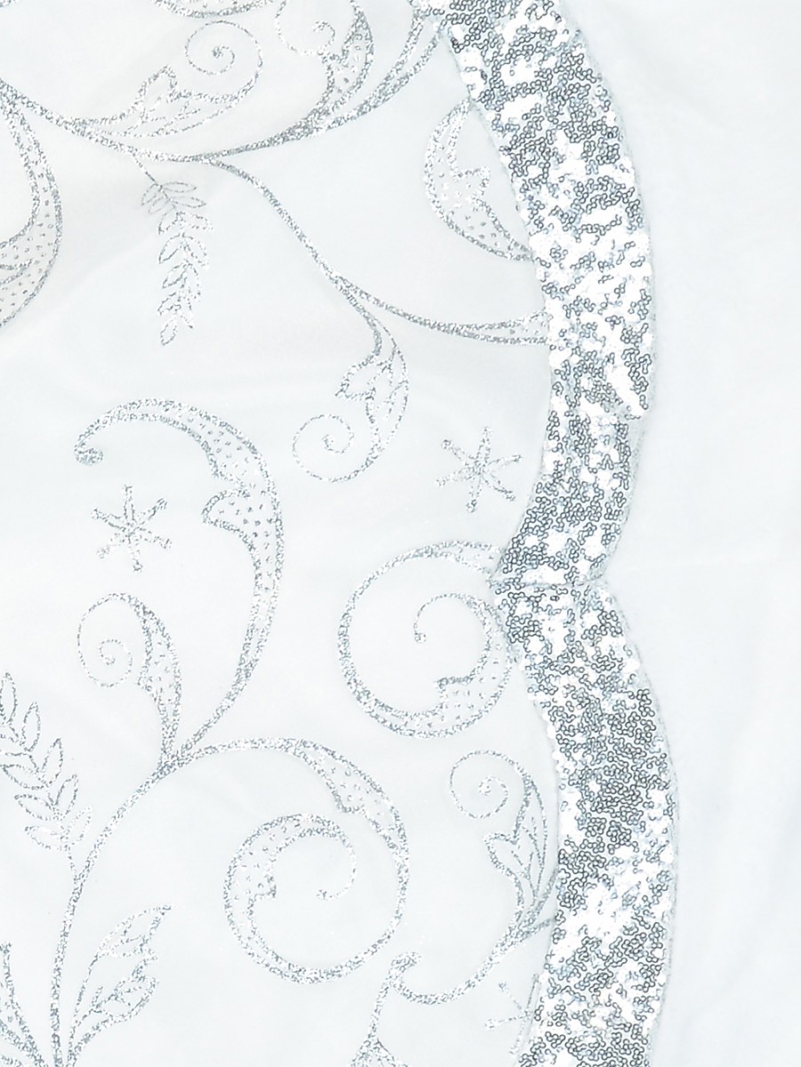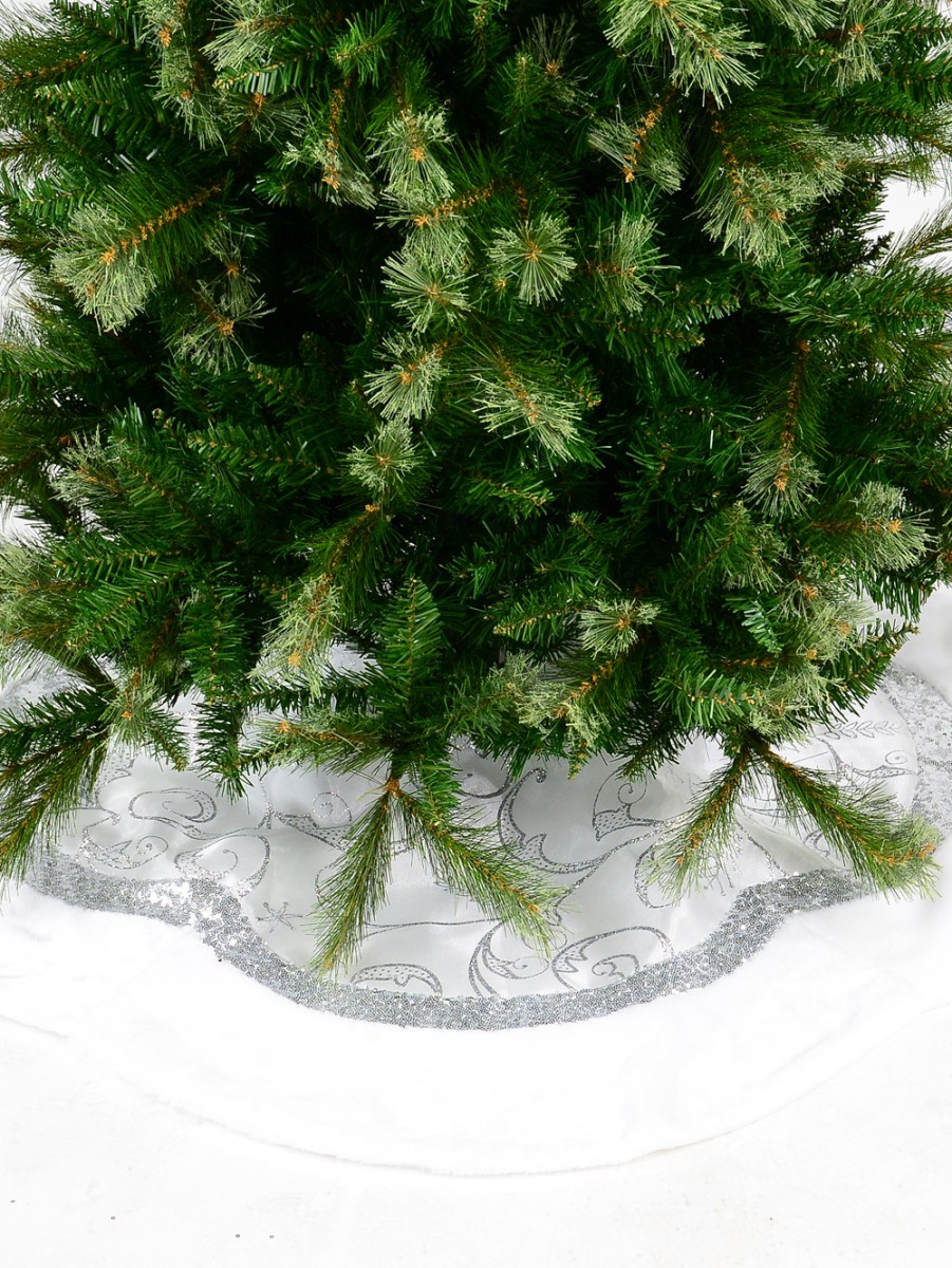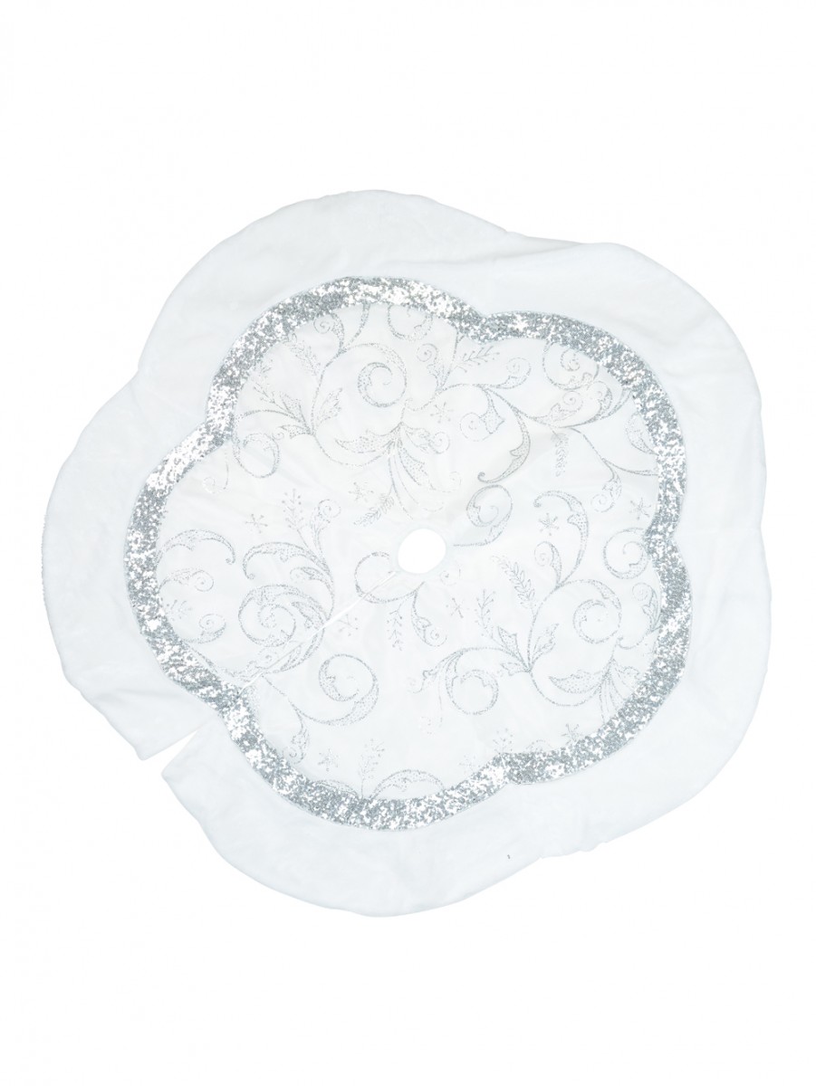 The White With Silver Sequin Vine Pattern & Fur Trim Scallop Shape Tree Skirt features a Christmas tree skirt made of white velvety fabric with a shapely pattern resembling that of sea scallops. The centre of this tree skirt features several floral themed ornate patterns of vines while enclosing this floral design centre is a hedge of sequins also shaped in the form of a sea scallop. The silver coloured sequins go further to reinforce and enhance the classic appeal of the white fabric material. Since white is a universal colour and also one of the predominant colours of Christmas, this tree skirt would fit right in with the Christmas tree decor.