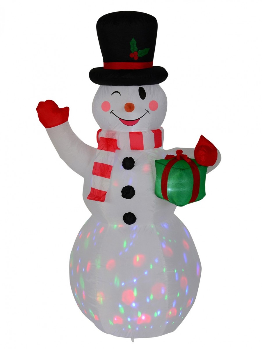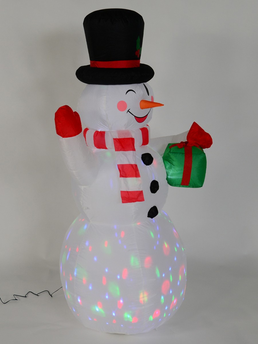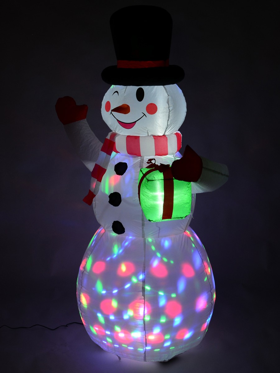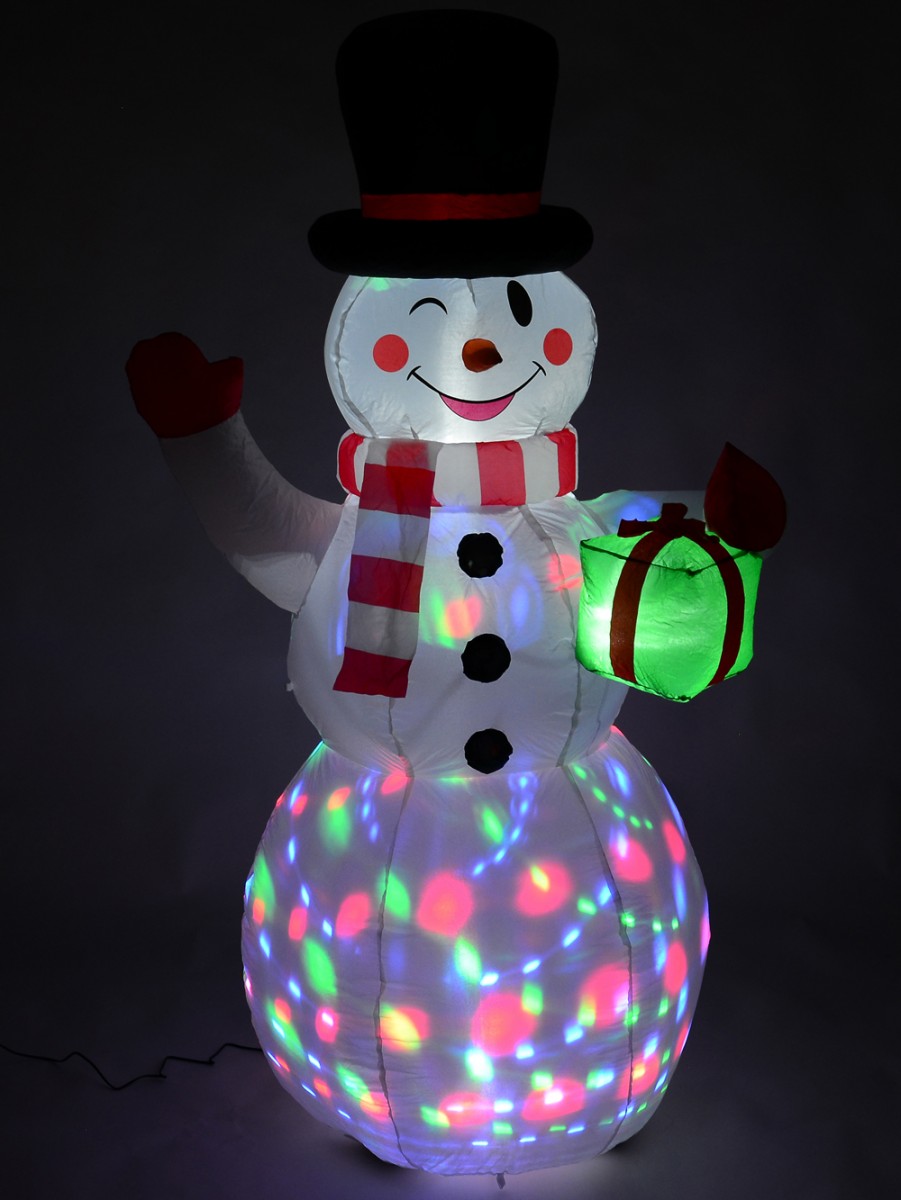 The Winking Snowman With LED Disco Light Christmas Inflatable would be a delightful decorative accent to every Christmas decoration you intend to engage in this coming Xmas. This festive ornament showcases an inflatable snowman figurine wearing a lovely smile and a winking gesture over rosy red cheeks. Apart from its jolly facial expression, the snowman is dressed in typical Christmas fashion and shines with rotating light colours.