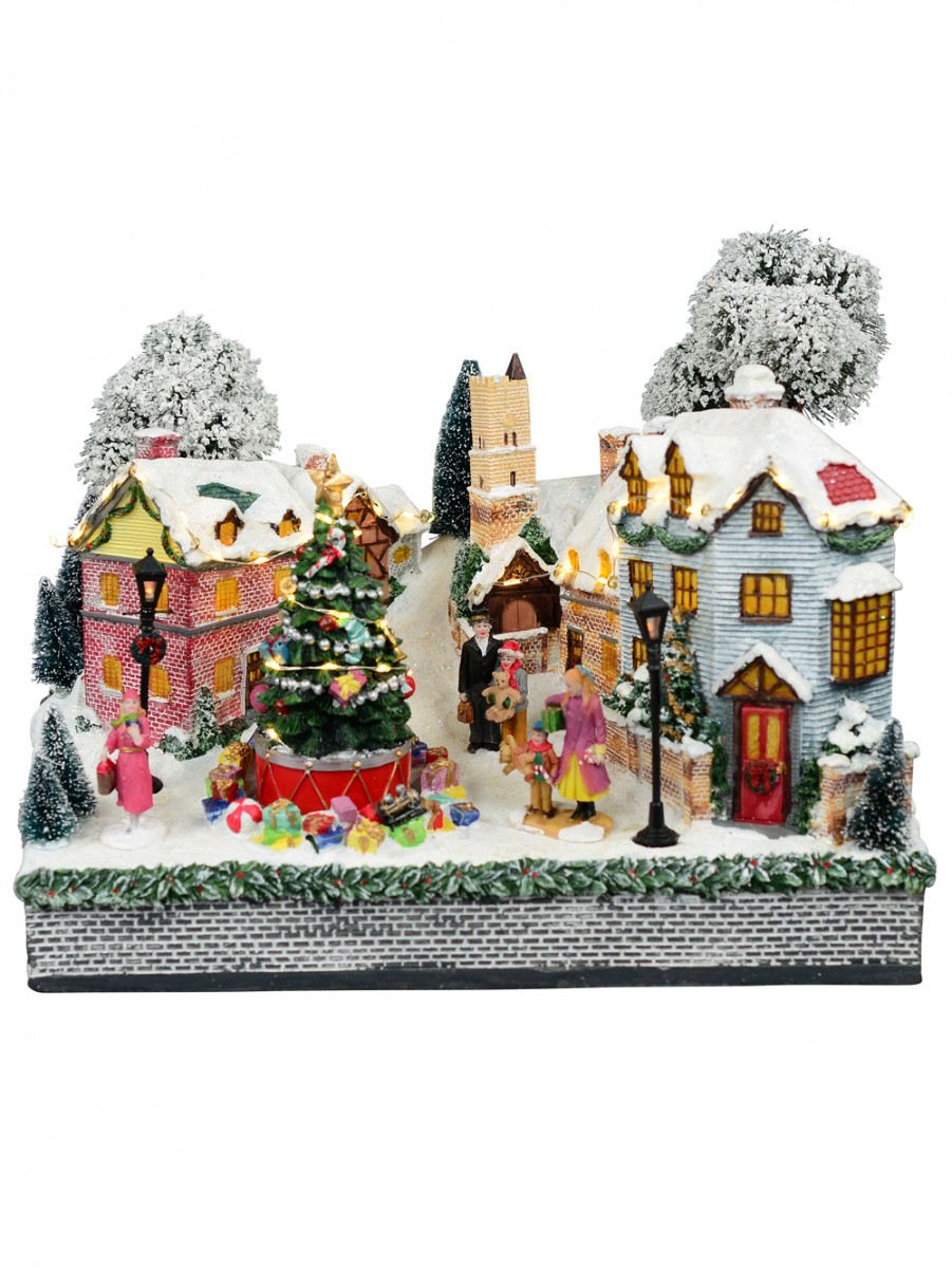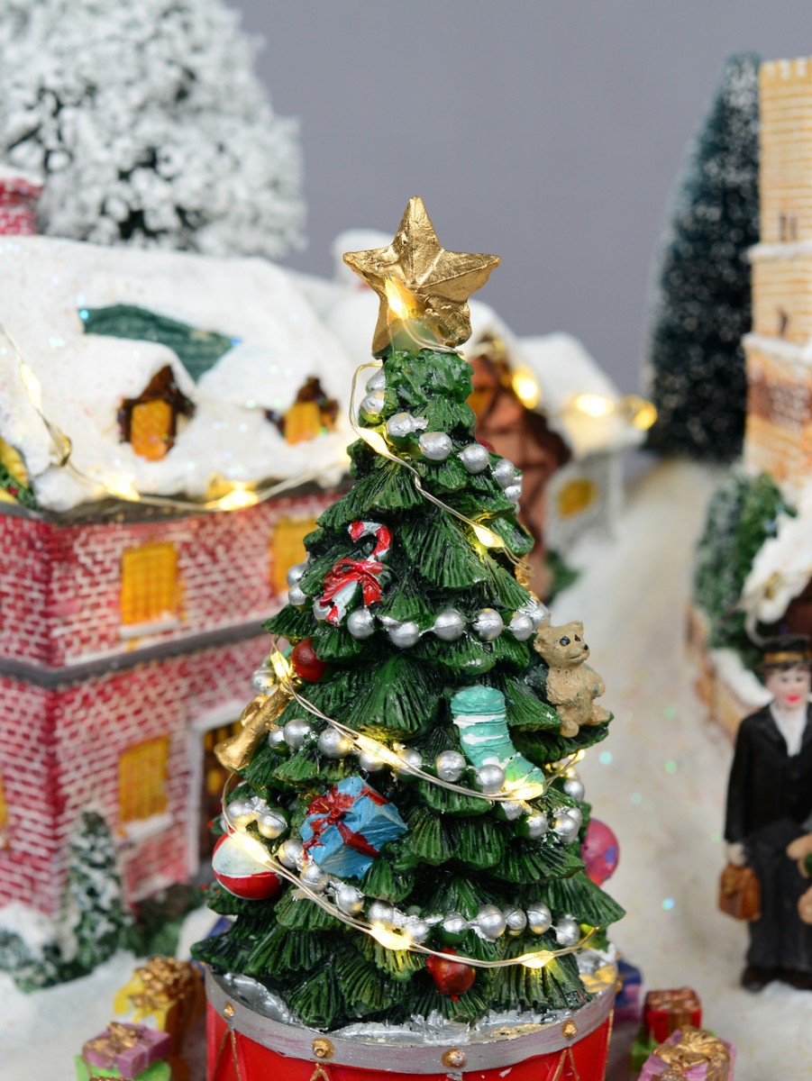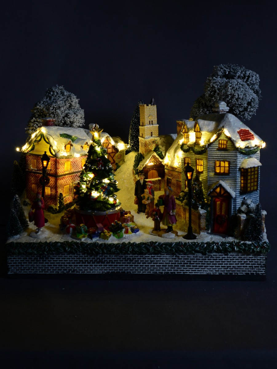 If you're looking for something to brighten up your space this Christmas, we've got you covered! This musical northern winter street scene Christmas ornament is the ideal choice for that extra color splash your decor needs this holiday season. It consists of a central Christmas tree decorated with glittering lights, candy canes, a large golden star at the top, and a rotating drum base. The townspeople are laying down presents under the tree. The backdrop is of various houses and a pine cone forest. Both of which are covered by a blanket of snow. Overall, the entire village scene figurine spreads a cheerful ambiance. The warm LED lights and the rotating tree makes this extremely special and adds vibrance to your decor due to the lively and radiant set.