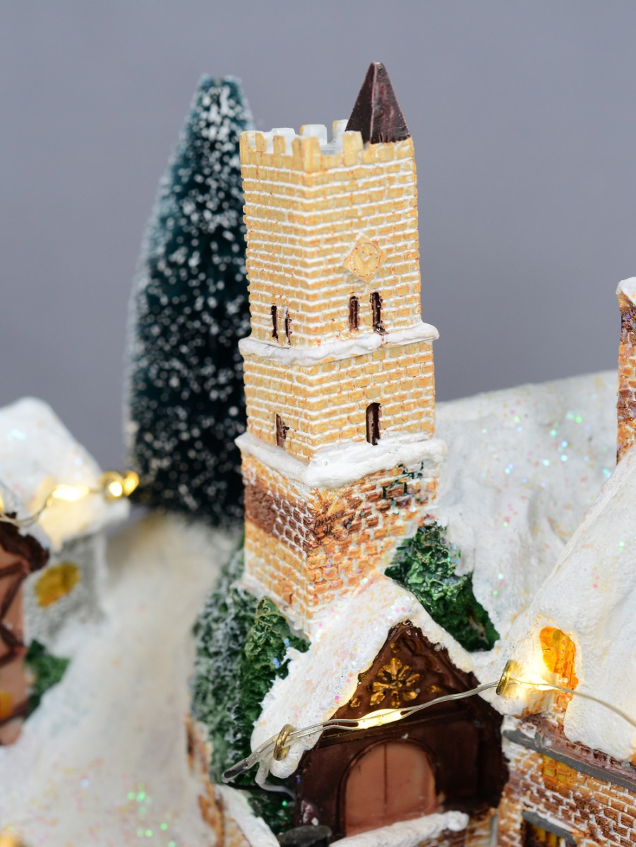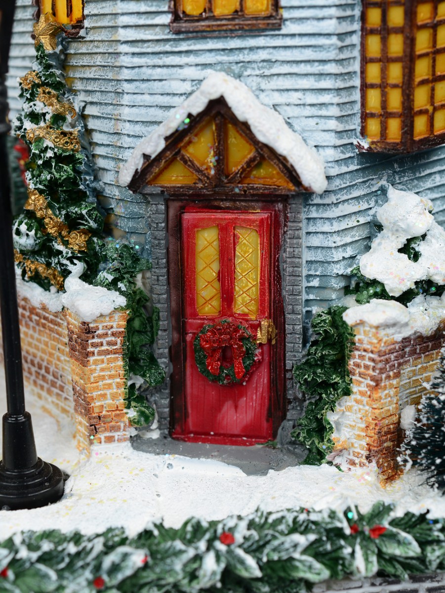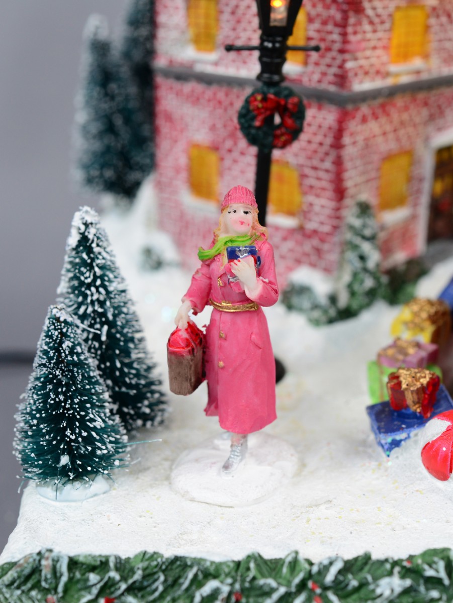If you're looking for something to brighten up your space this Christmas, we've got you covered! This musical northern winter street scene Christmas ornament is the ideal choice for that extra color splash your decor needs this holiday season. It consists of a central Christmas tree decorated with glittering lights, candy canes, a large golden star at the top, and a rotating drum base. The townspeople are laying down presents under the tree. The backdrop is of various houses and a pine cone forest. Both of which are covered by a blanket of snow. Overall, the entire village scene figurine spreads a cheerful ambiance. The warm LED lights and the rotating tree makes this extremely special and adds vibrance to your decor due to the lively and radiant set.