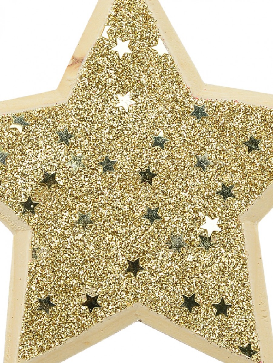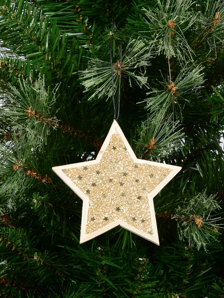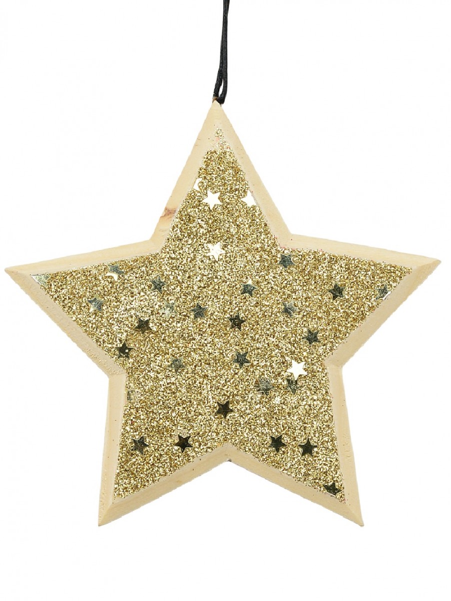 The Natural Wood Star With Gold Glitter & Stars Hanging Decoration is a 100% natural wooden ornament with such shapeliness and alluring look appearance. Its shapeliness is due to the use of laser cutting edge technology to achieve a perfect 5-point star shape. With smoothened edges, the surface area of the wooden star is then covered in gold glitters which produce such sheen that is sure to be the focus of your Christmas decoration. With the attached black string, you can easily hang it on your Christmas tree, on your front doorknob, vehicles rear view mirror, office door knob and wherever else pleases you. And, it comes at discounted prices.