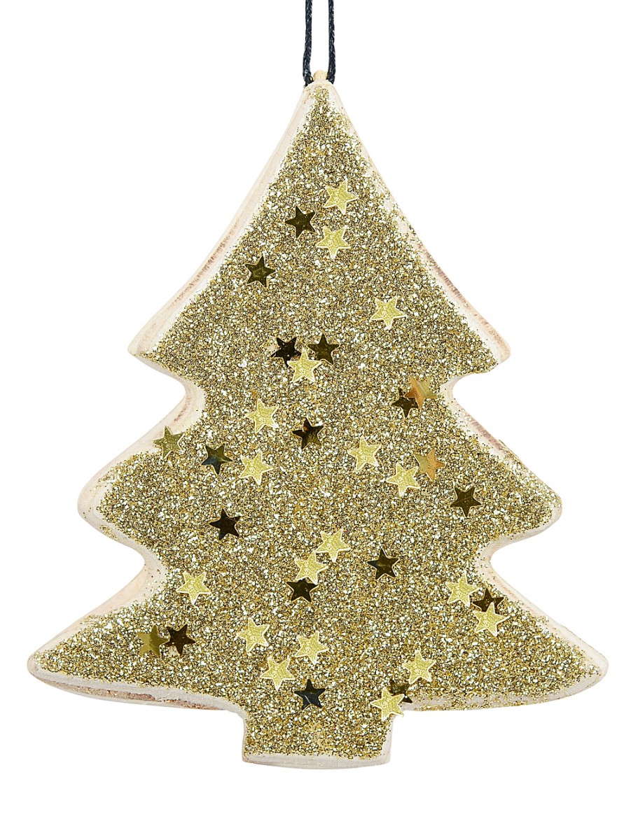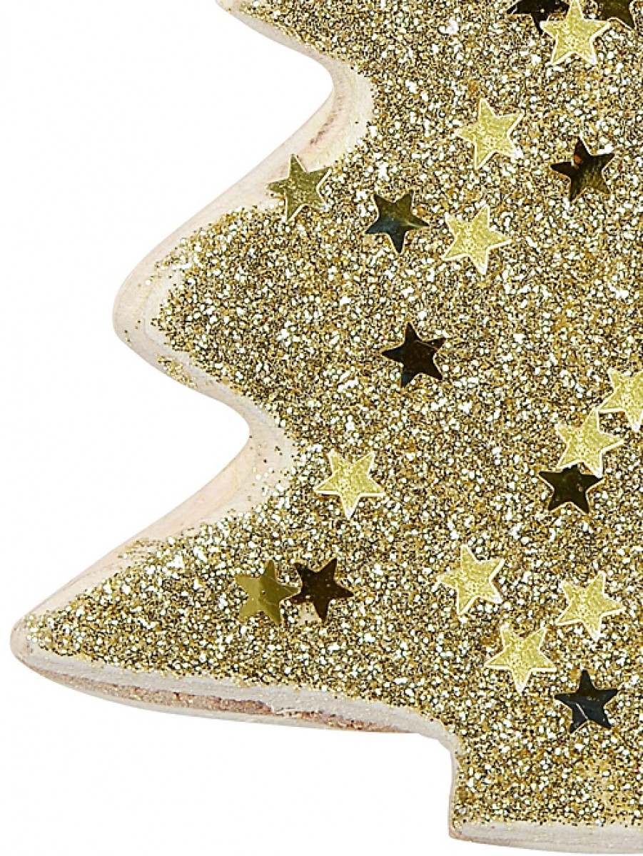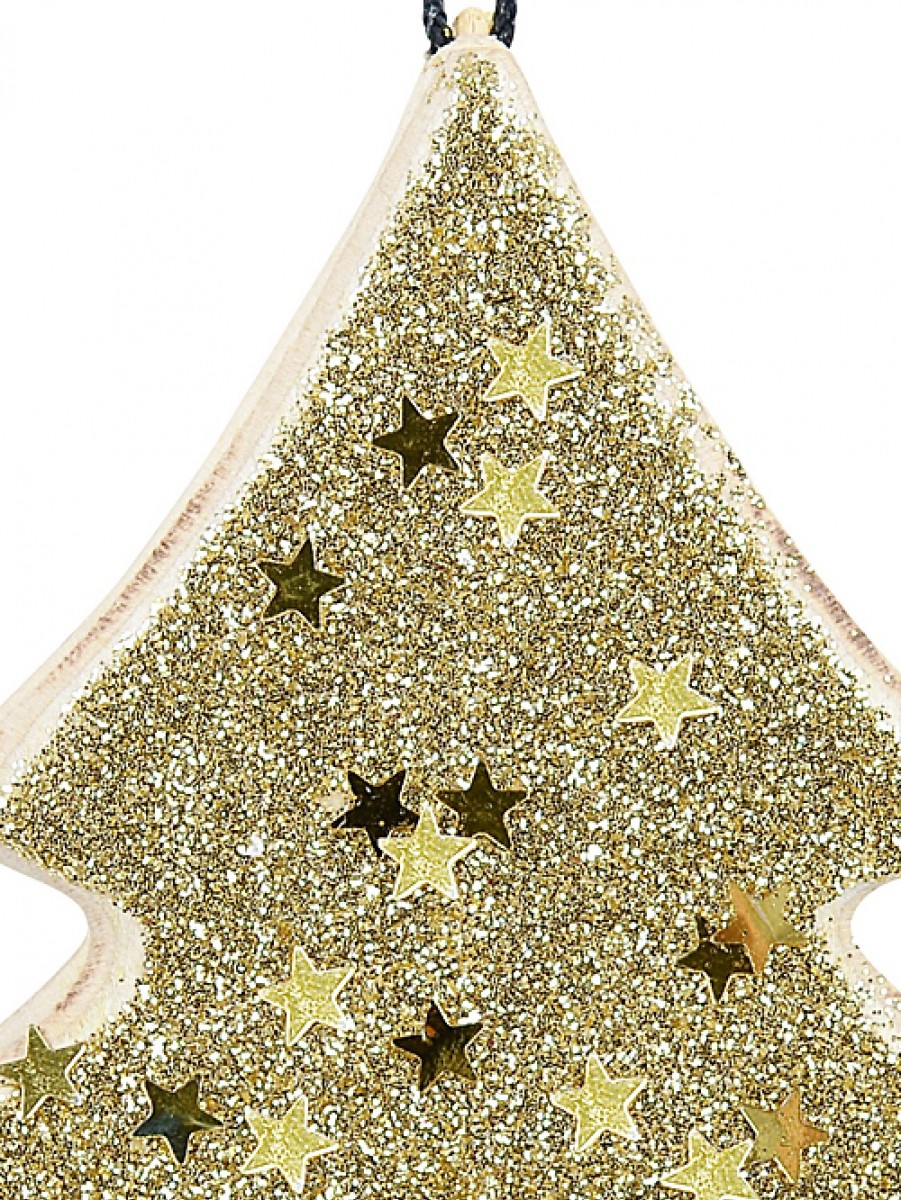 Wood Tree With Gold Glitter & Stars Christmas Tree Hanging Decoration - 11cm