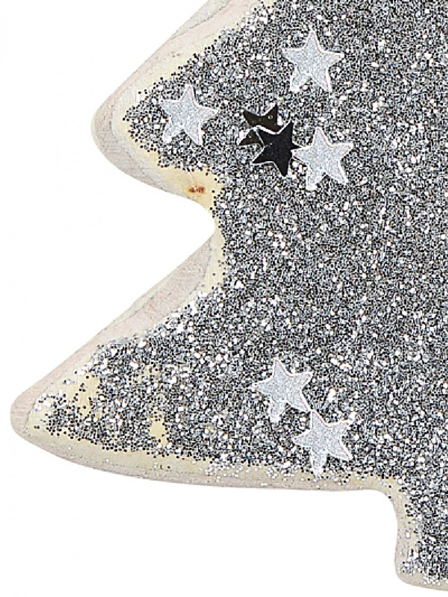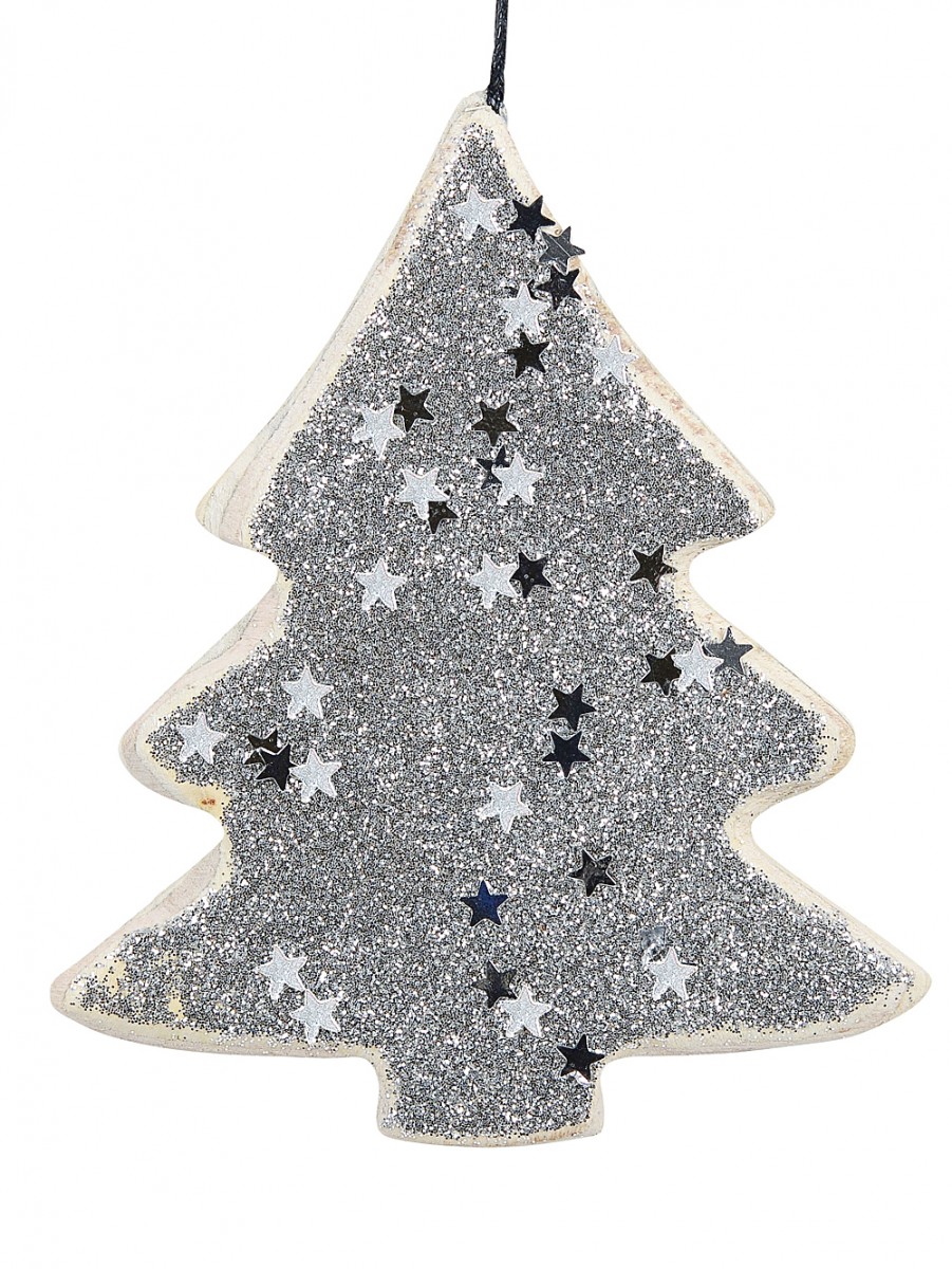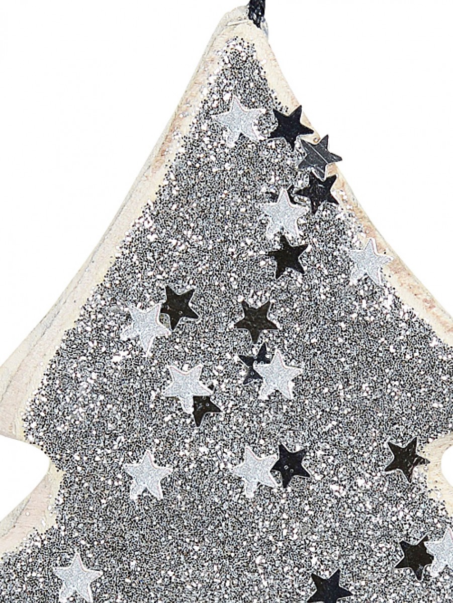 Wood Tree With Silver Glitter & Stars Christmas Tree Hanging Decoration - 11cm